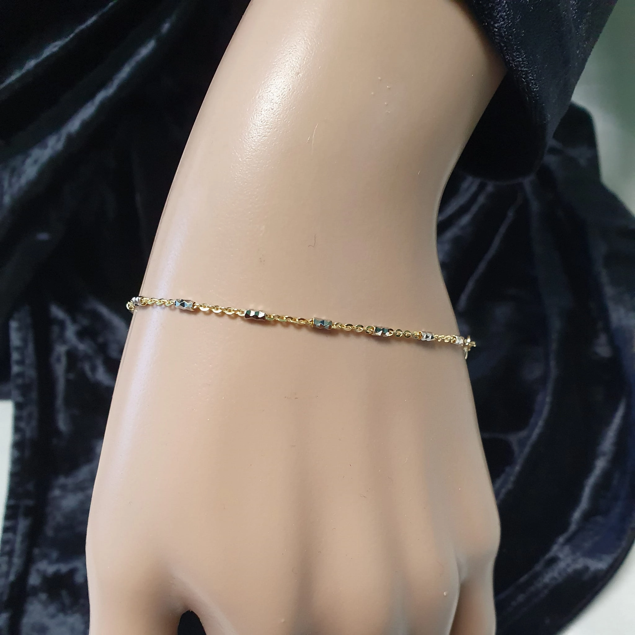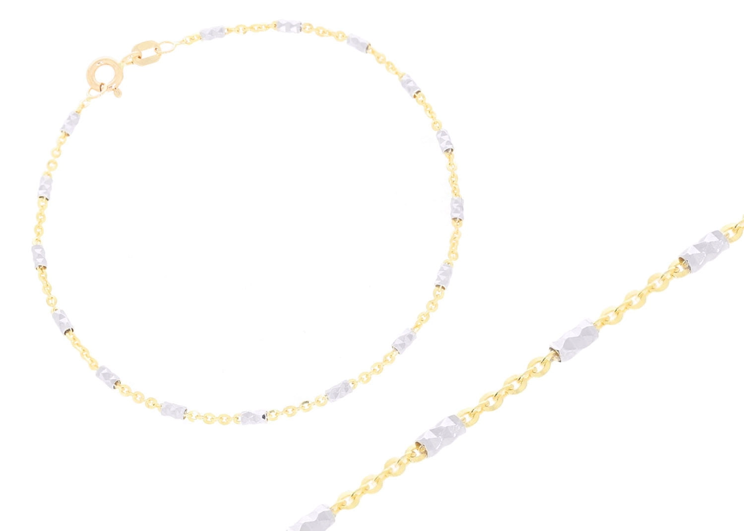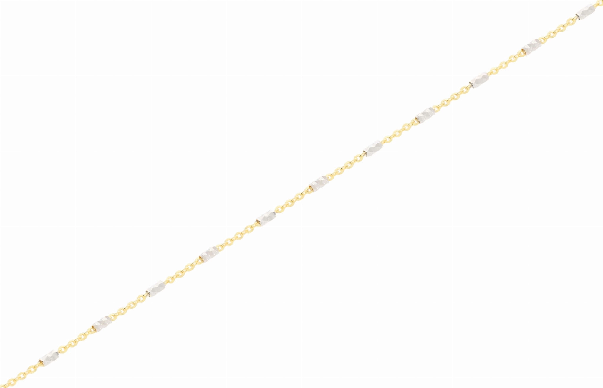 Atraskite išskirtinę eleganciją su šia nuostabia moteriška apyranke, pagaminta iš aukščiausios kokybės 585 prabos aukso. Ši apyrankė, spindinti dviejų spalvų aukso – šilto geltono ir modernaus balto – deriniu, yra tikras meno kūrinys, sukurtas su aistra ir dideliu preciziškumu. Jos unikalus dizainas, kuriame subtiliai persipina geltono aukso grandinėlė su žėrinčiais balto aukso elementais, suteikia jai nepaprasto žavesio ir rafinuotumo.