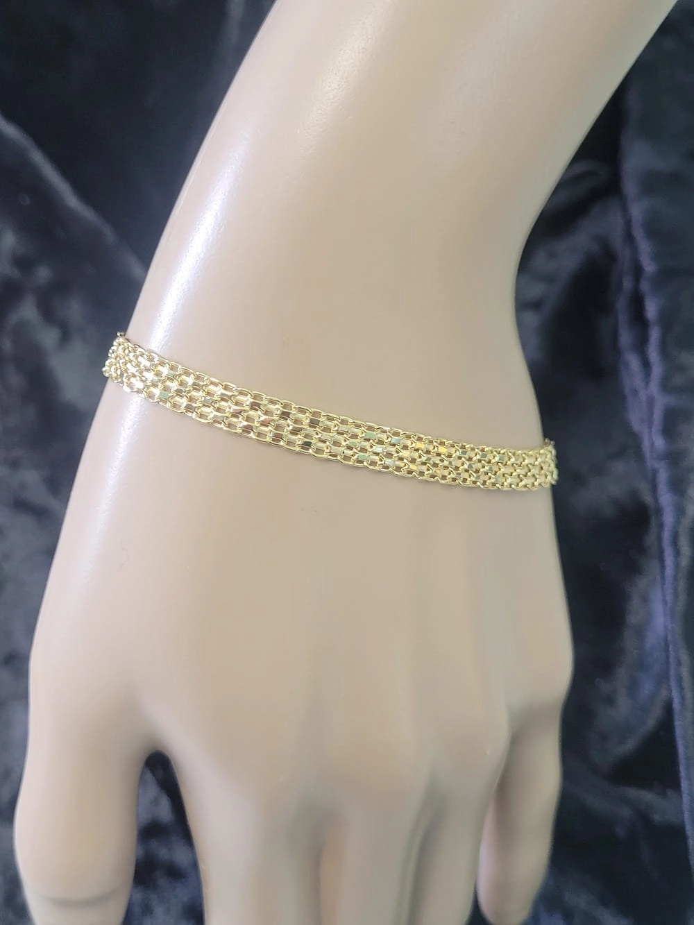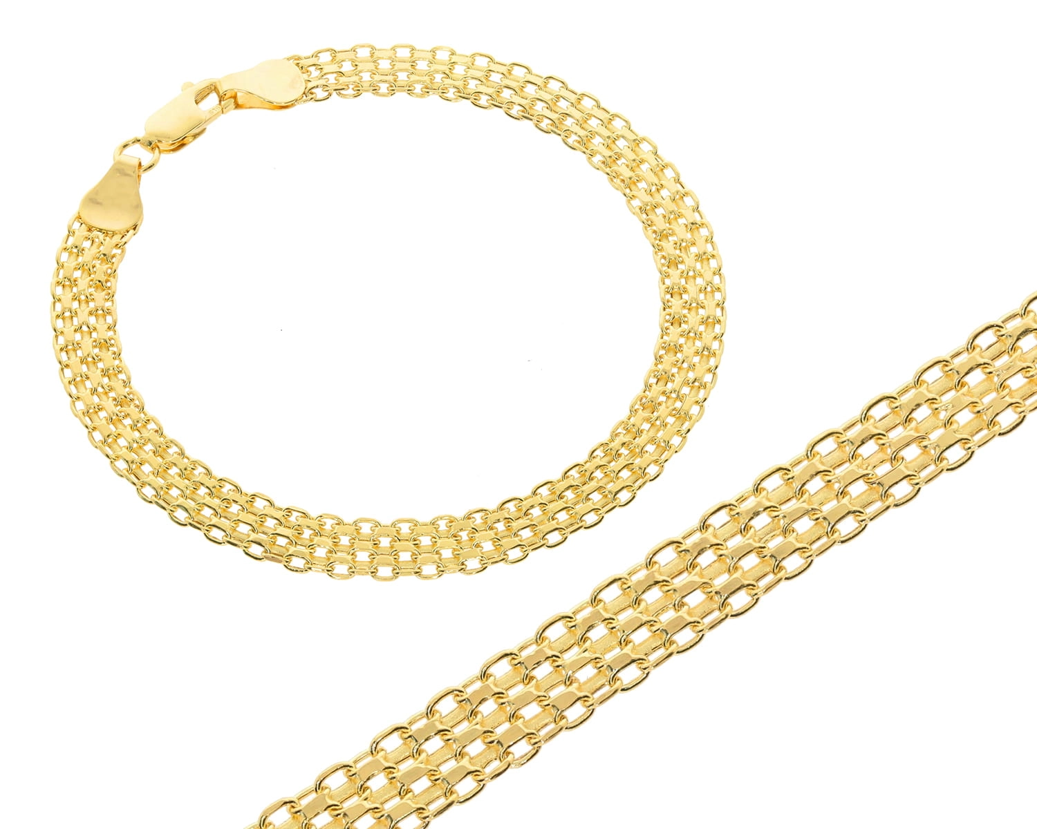 Pagaminta iš aukščiausios kokybės 585 prabos geltono aukso, ši apyrankė pasižymi išskirtiniu ilgaamžiškumu ir atsparumu. Jos plotis – 6,28 mm, todėl ji atrodo solidžiai ir elegantiškai ant riešo. Kiekviena detalė sukurta su ypatingu kruopštumu ir preciziškumu, užtikrinant ne tik estetinį grožį, bet ir patogumą dėvint. Tai puiki dovana sau ar artimam žmogui, kuri taps brangiu prisiminimu ir puošmena ilgus metus.