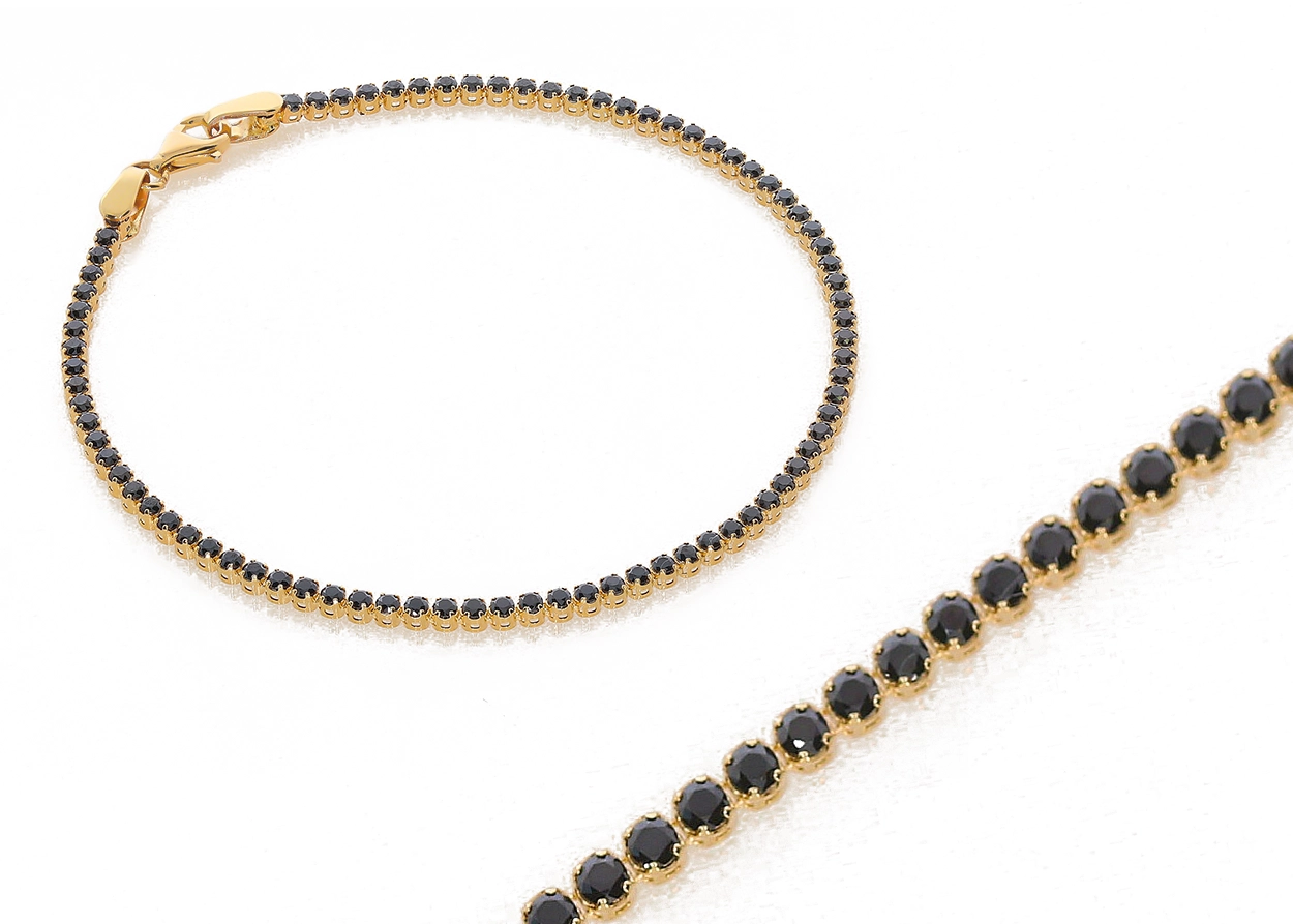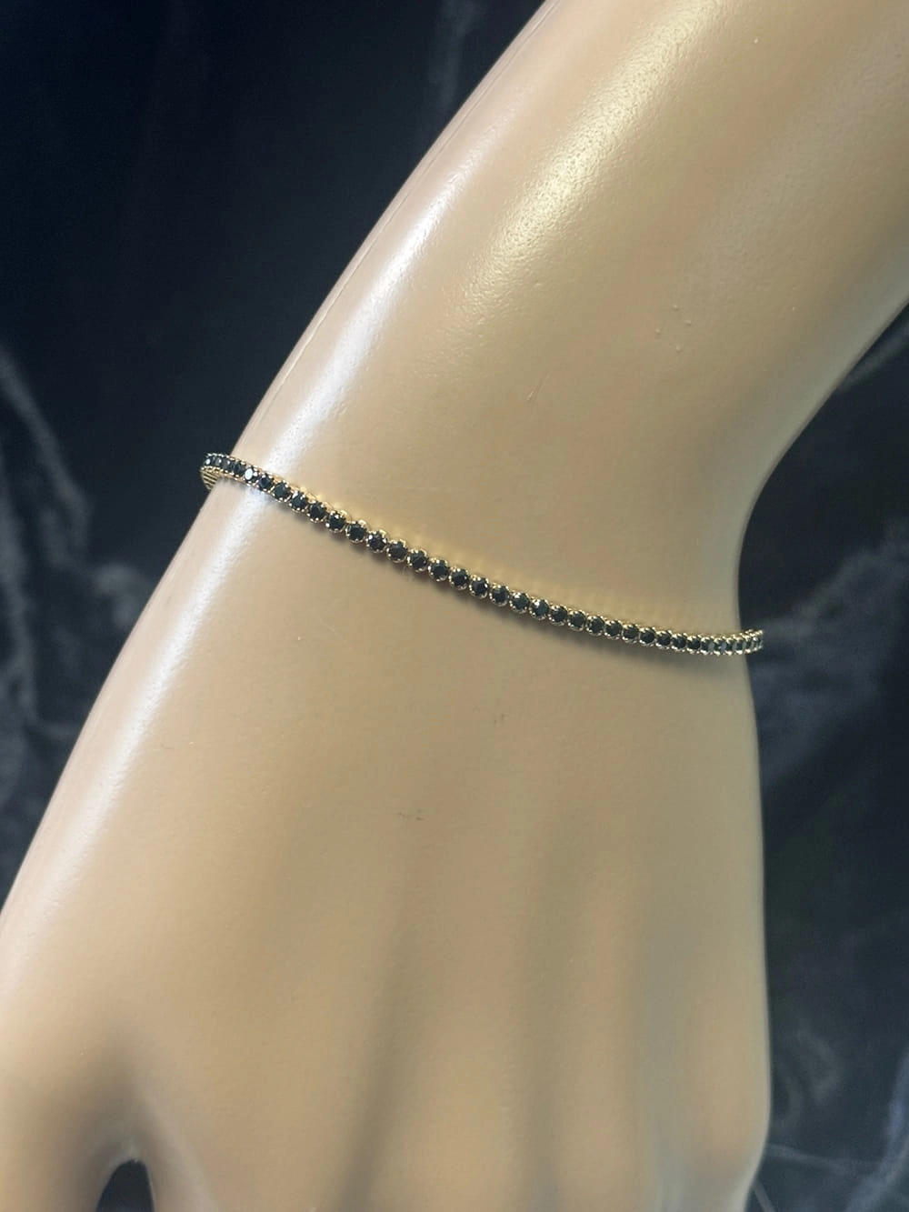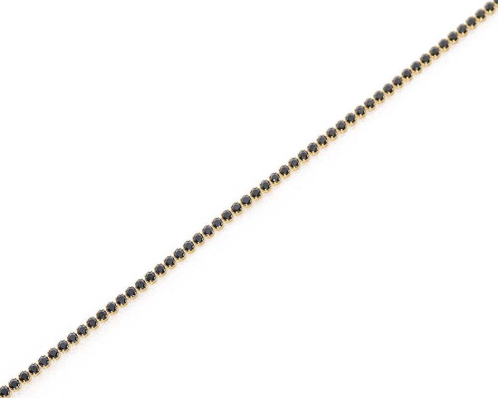 Apyrankė pagaminta iš aukščiausios kokybės 585 prabos geltono aukso, garantuojančio ilgaamžiškumą ir atsparumą. Jos paviršius dekoruotas gausybe juodų cirkonių, kurie sukuria subtilų, bet ryškų kontrastą su aukso spalva. Kiekvienas cirkonis kruopščiai įtvirtintas, kad užtikrintų maksimalų blizgesį ir saugumą. Apyrankės plotis – 2 mm, todėl ji atrodo grakščiai ir elegantiškai ant riešo.
