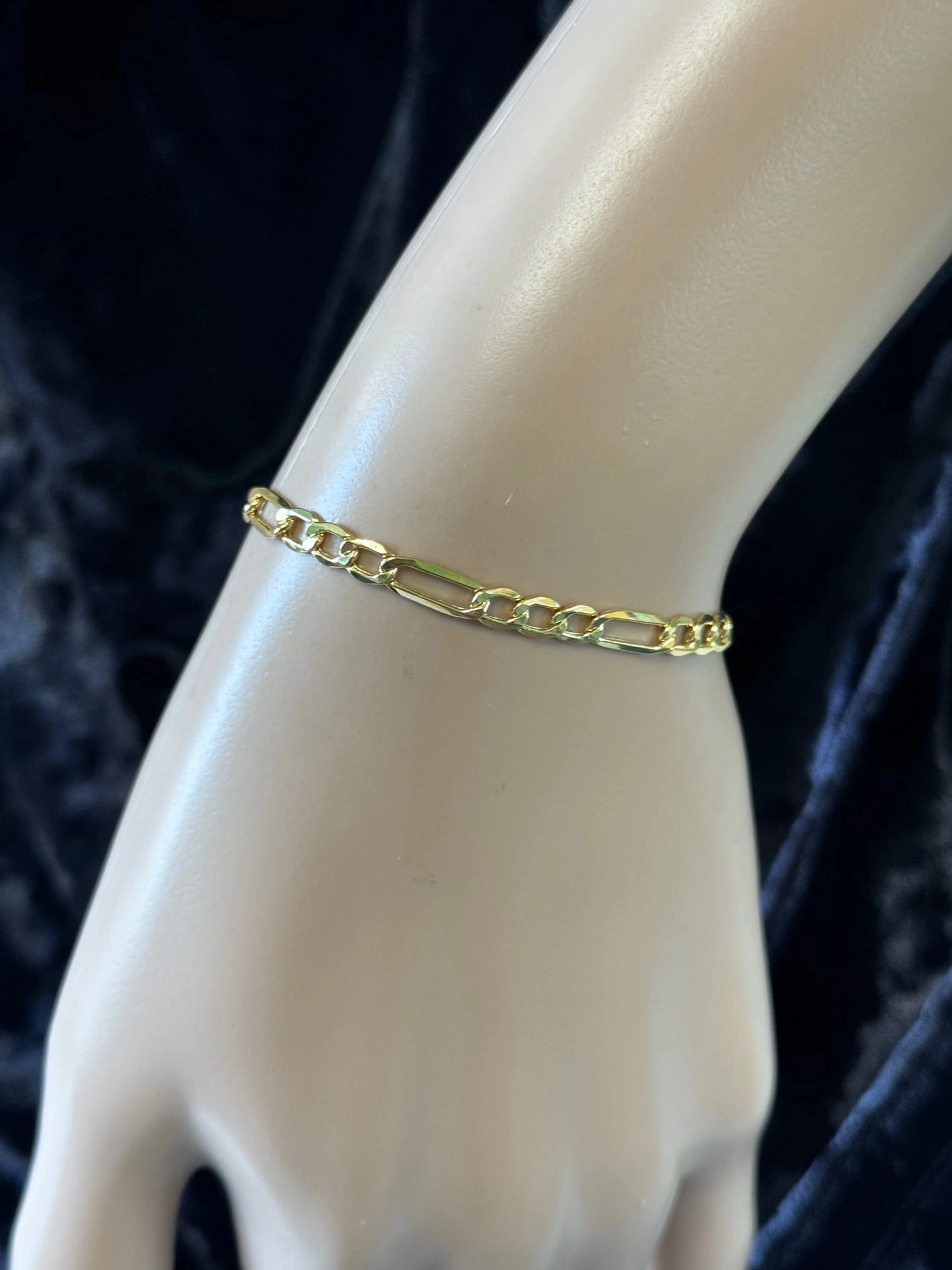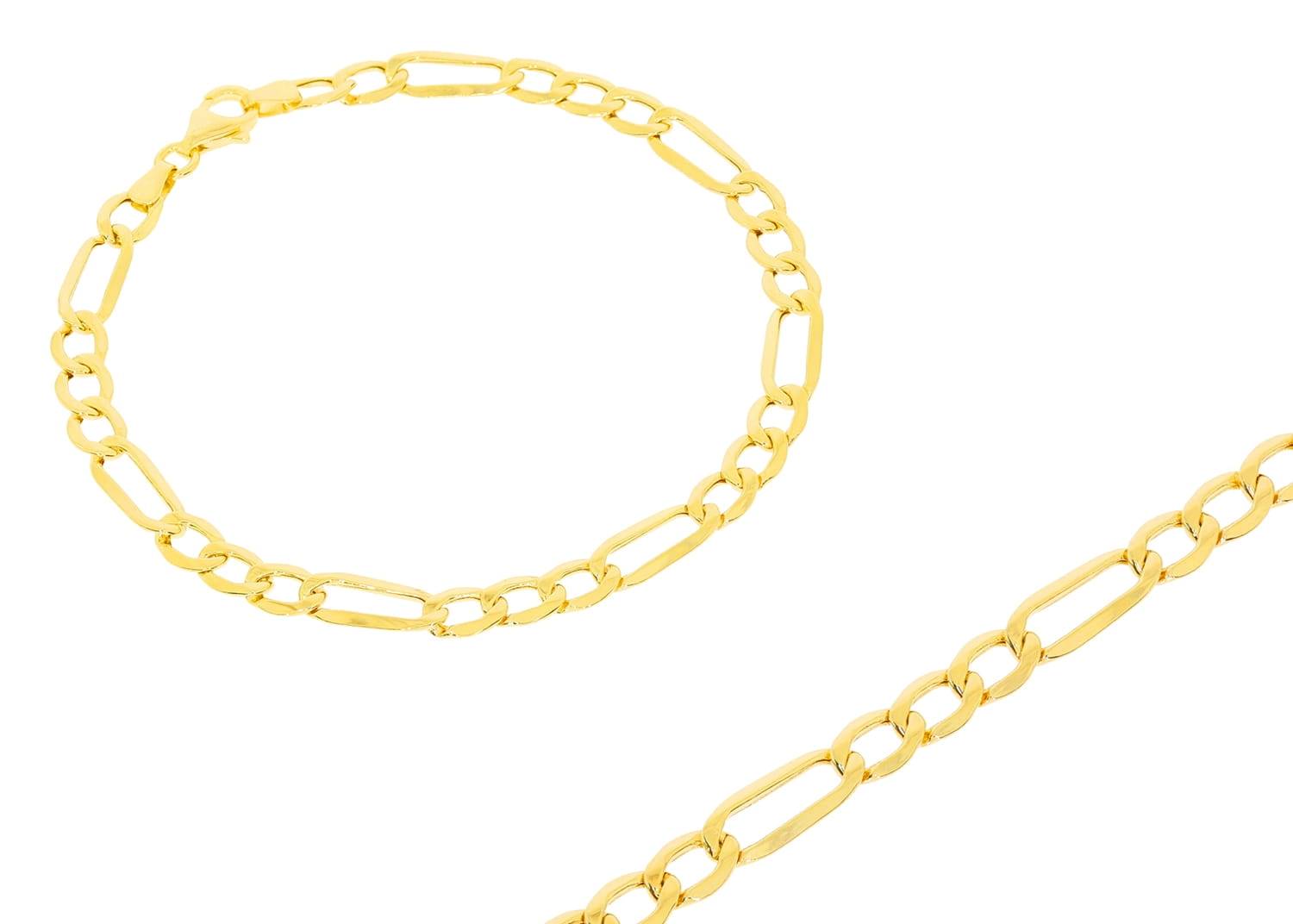 Ši apyrankė pagaminta iš aukščiausios kokybės 585 prabos geltono aukso, garantuojančio ilgaamžiškumą ir išskirtinį blizgesį. Jos tuščiaviduris Figaro pynimas (5,40 mm pločio) suteikia apyrankei lengvumo ir subtilumo, kartu išlaikant tvirtumą ir patikimumą. Kiekviena grandelė yra kruopščiai sujungta, sukuriant harmoningą ir elegantišką dizainą, kuris traukia akį ir žavi savo paprastumu.