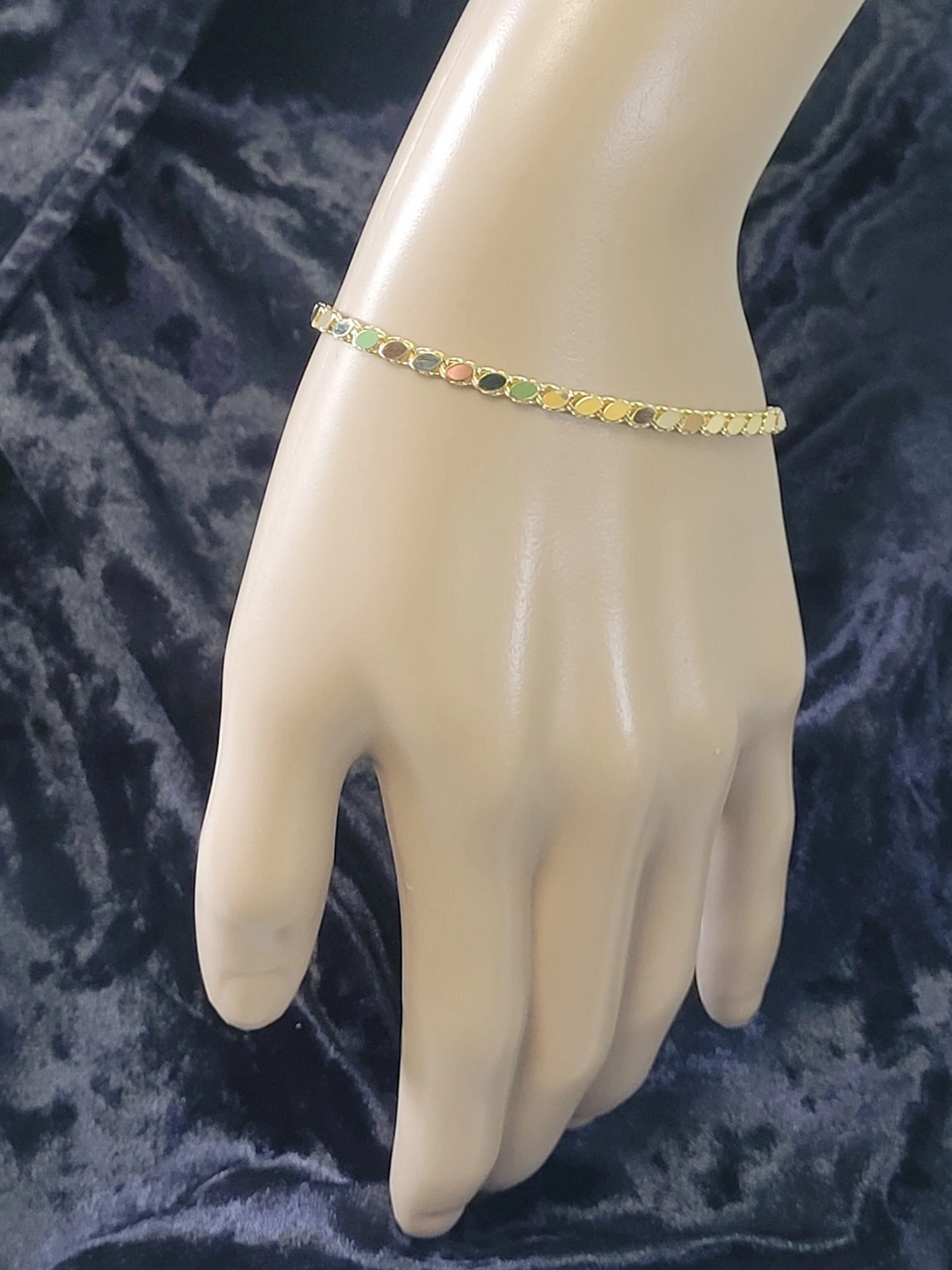 Apyrankės dizainas išsiskiria subtiliais, ovalo formos elementais, kurie žavingai atspindi šviesą, suteikdami Jums nepakartojamo spindesio. Jos plotis yra 3,5 mm, todėl ji puikiai tinka tiek kasdieniam nešiojimui, tiek ypatingoms progoms. Tai puiki dovana, kuri pabrėš Jūsų individualumą ir suteiks pasitikėjimo savimi. Ši apyrankė – tai investicija į stilių, kuris niekada neišeis iš mados.
