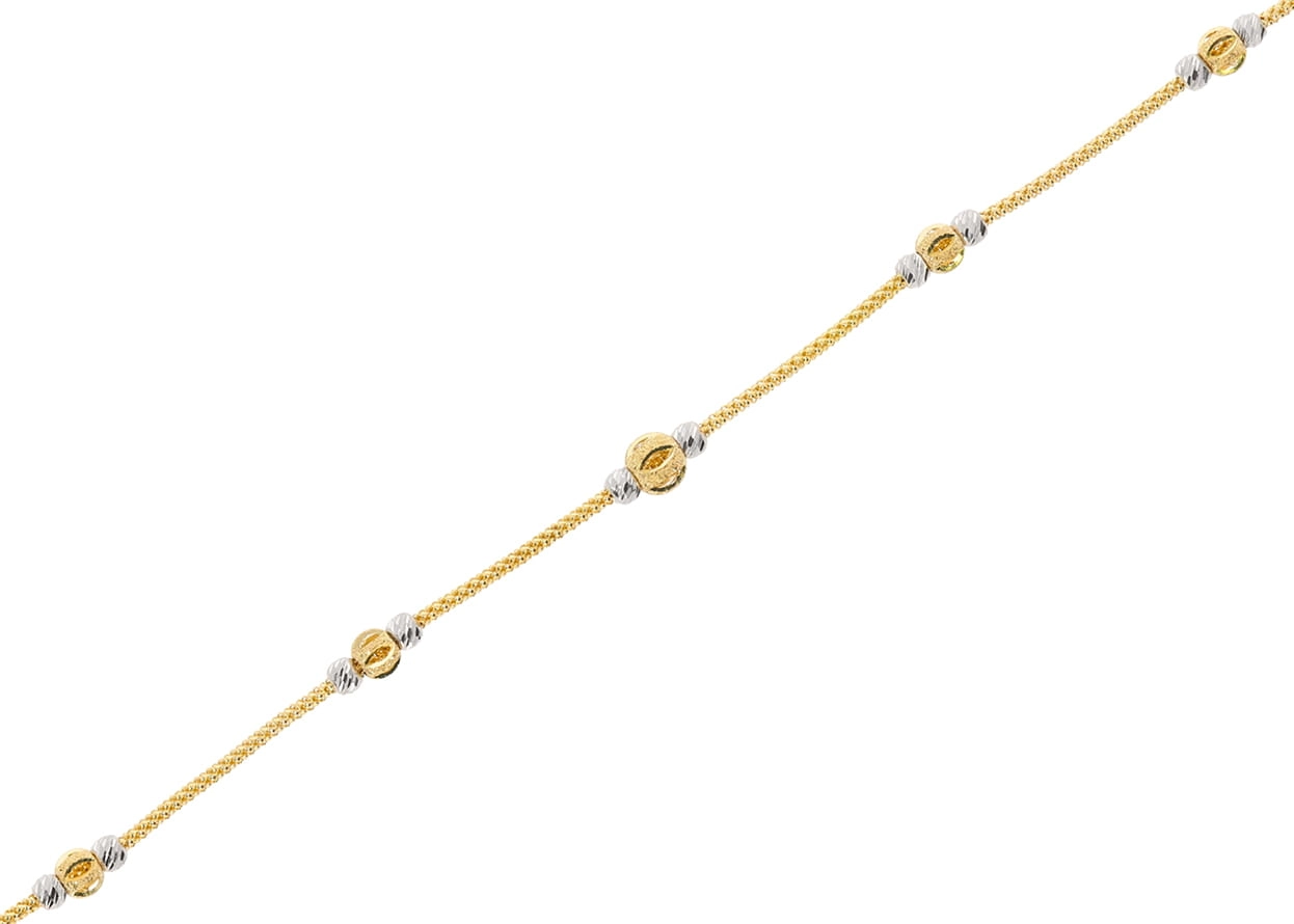 Apyrankės dizainas išsiskiria subtiliais geltono aukso burbuliukais, kurie yra įkomponuoti į grandinėlę, o tarp jų įpintos smulkios, raižytos balto aukso detalės, suteikiančios jai žaismingumo ir modernumo. Šis derinys sukuria unikalų ir patrauklų vaizdą, kuris pabrėš Jūsų individualumą ir suteiks Jums nepakartojamo žavesio. Apyrankės plotis svyruoja nuo 1,40 mm iki 4,95 mm, todėl ji puikiai atrodo ant riešo, neapkraunant jo, bet suteikiant prabangos pojūtį.