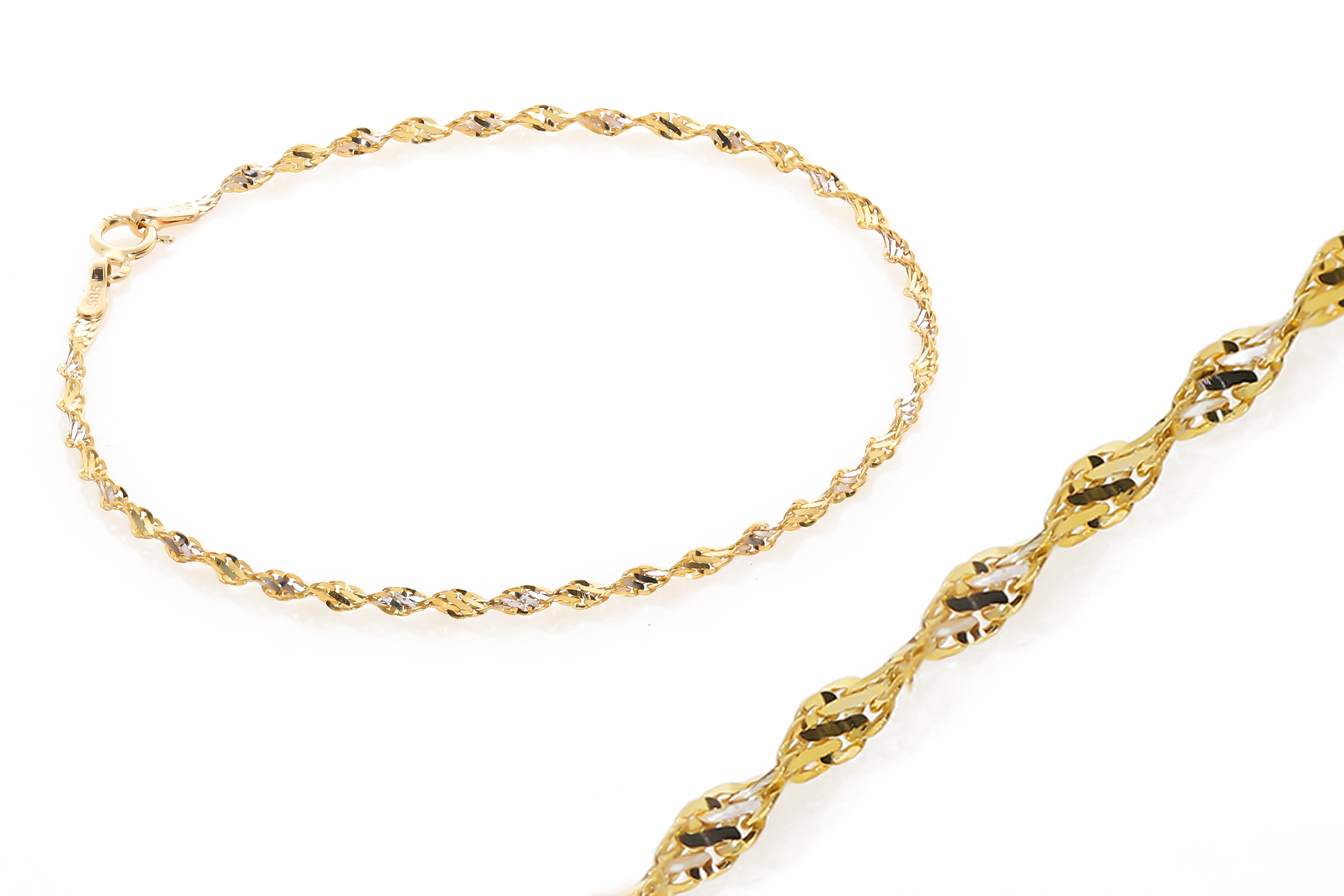 Apyrankės dizainas išsiskiria unikaliu dviejų spalvų aukso deriniu – geltono ir balto, kuris suteikia jai modernumo ir rafinuotumo. Kiekviena grandelė yra kruopščiai sujungta, sukuriant vientisą ir elegantišką Rope pynimo raštą, kuris gražiai atspindi šviesą ir sukuria žaismingą spindesį. Apyrankės plotis yra 2 mm, todėl ji atrodo subtiliai ir grakščiai ant riešo, pabrėždama Jūsų moteriškumą ir stilių.