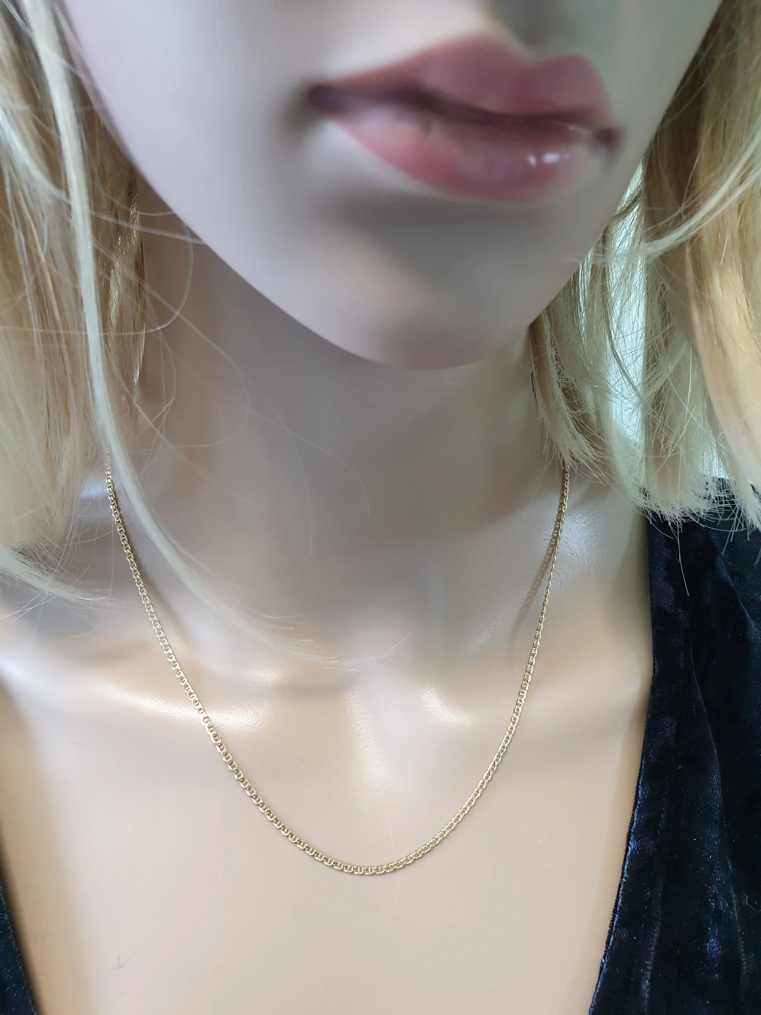 Marina pynimas, dar žinomas kaip „Gucci“ pynimas, pasižymi unikaliu ir žavingu dizainu, primenančiu inkarų grandines. Šis pynimas suteikia grandinėlei lengvumo ir modernumo, o tuščiavidurė konstrukcija užtikrina, kad ji būtų patogi nešioti ir neapsunkintų kaklo. Grandinėlės plotis – 1,7 mm, todėl ji yra pakankamai subtili, kad tiktų prie bet kokios aprangos, tačiau pakankamai pastebima, kad neliktų nepastebėta.