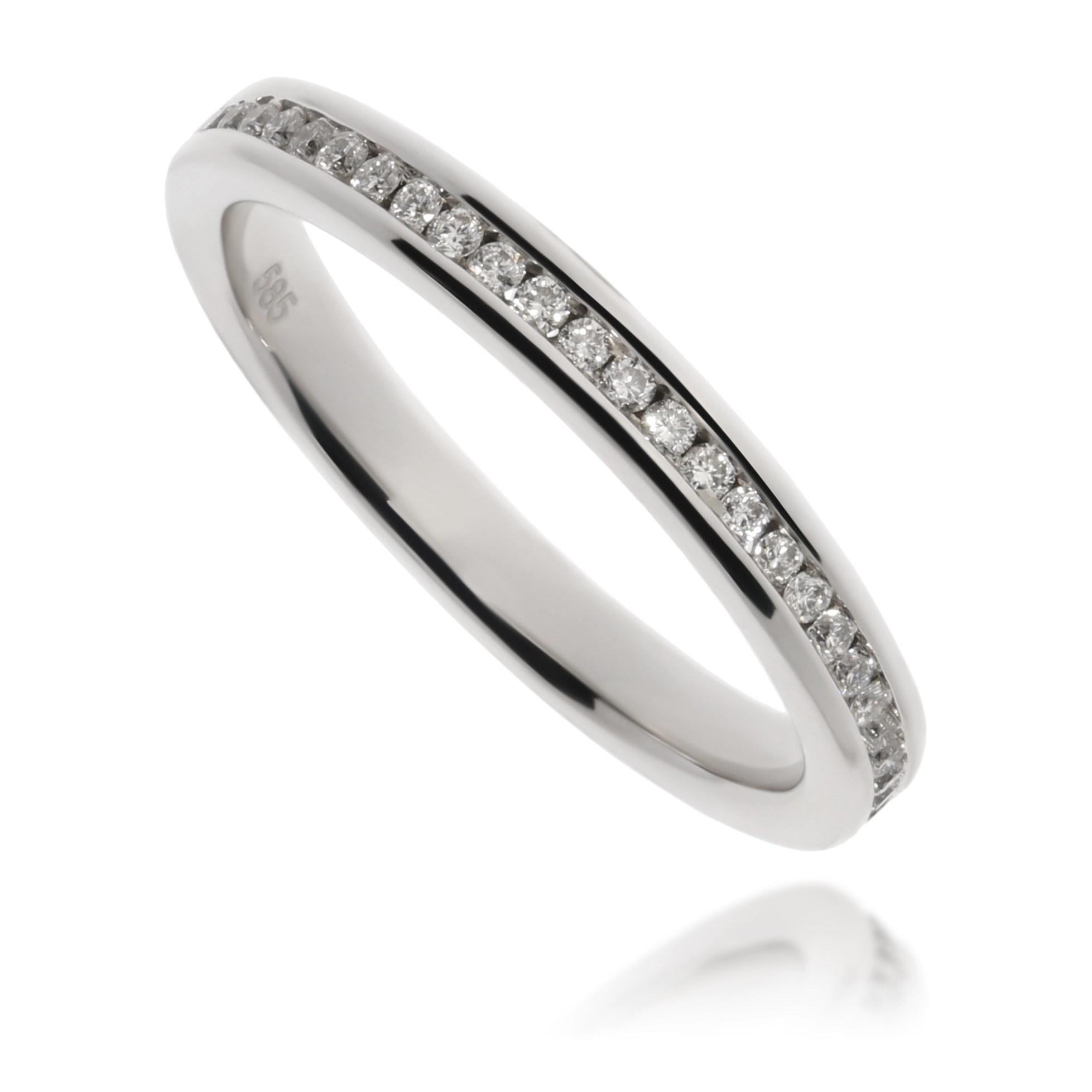 Žiedo viršutinę dalį puošia eilė žėrinčių deimantų, kurių bendra masė siekia 0,22 ct. Deimantai pasižymi SI1 švarumu ir I spalva, užtikrinančia jų nepriekaištingą spindesį ir grožį. Kiekvienas deimantas kruopščiai įtvirtintas, kad maksimaliai atskleistų savo šviesą ir sukurtų akinantį efektą. Žiedo briaunos plotis apačioje yra 3 mm, o viršutinės dalies plotis/ilgis – 3 mm, suteikiant jam subtilų, bet išraiškingą dizainą.
