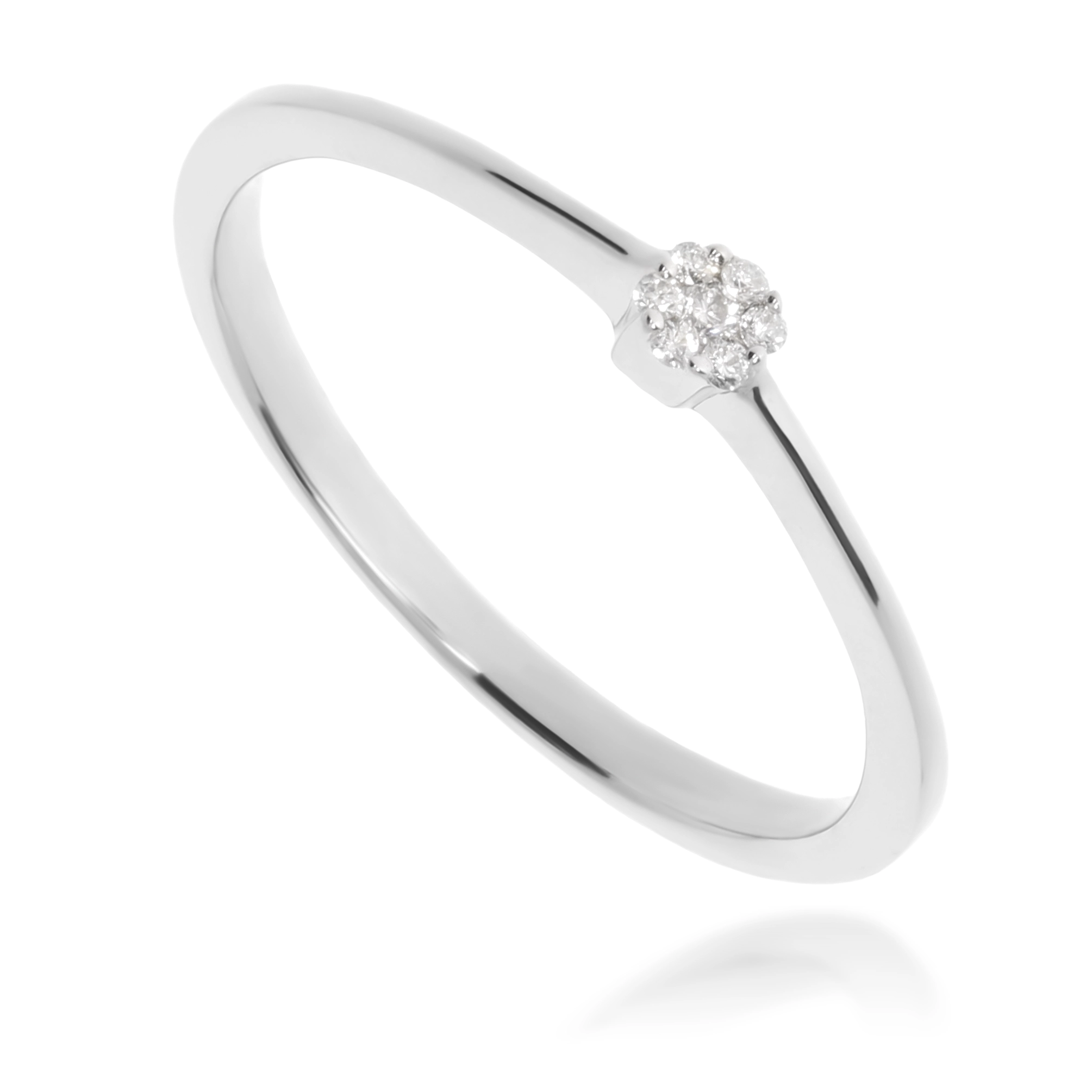 Žiedas pagamintas iš 585 prabos baltojo aukso, kuris suteikia jam modernumo ir prabangos. Žiedo briauna apačioje yra 2 mm pločio, o viršutinė dalis, puošta briliantais, siekia 3 mm pločio ir ilgio. Centre įmontuoti keli maži, bet ryškūs deimantai, kurių bendra masė yra 0,07 ct. Šie deimantai pasižymi išskirtine VS2 švarumo klase ir H spalva, garantuojančia akinantį spindesį ir nepriekaištingą grožį. Jų subtilus išdėstymas sukuria vientisą, spindintį paviršių, kuris atspindi šviesą su kiekvienu judesiu.