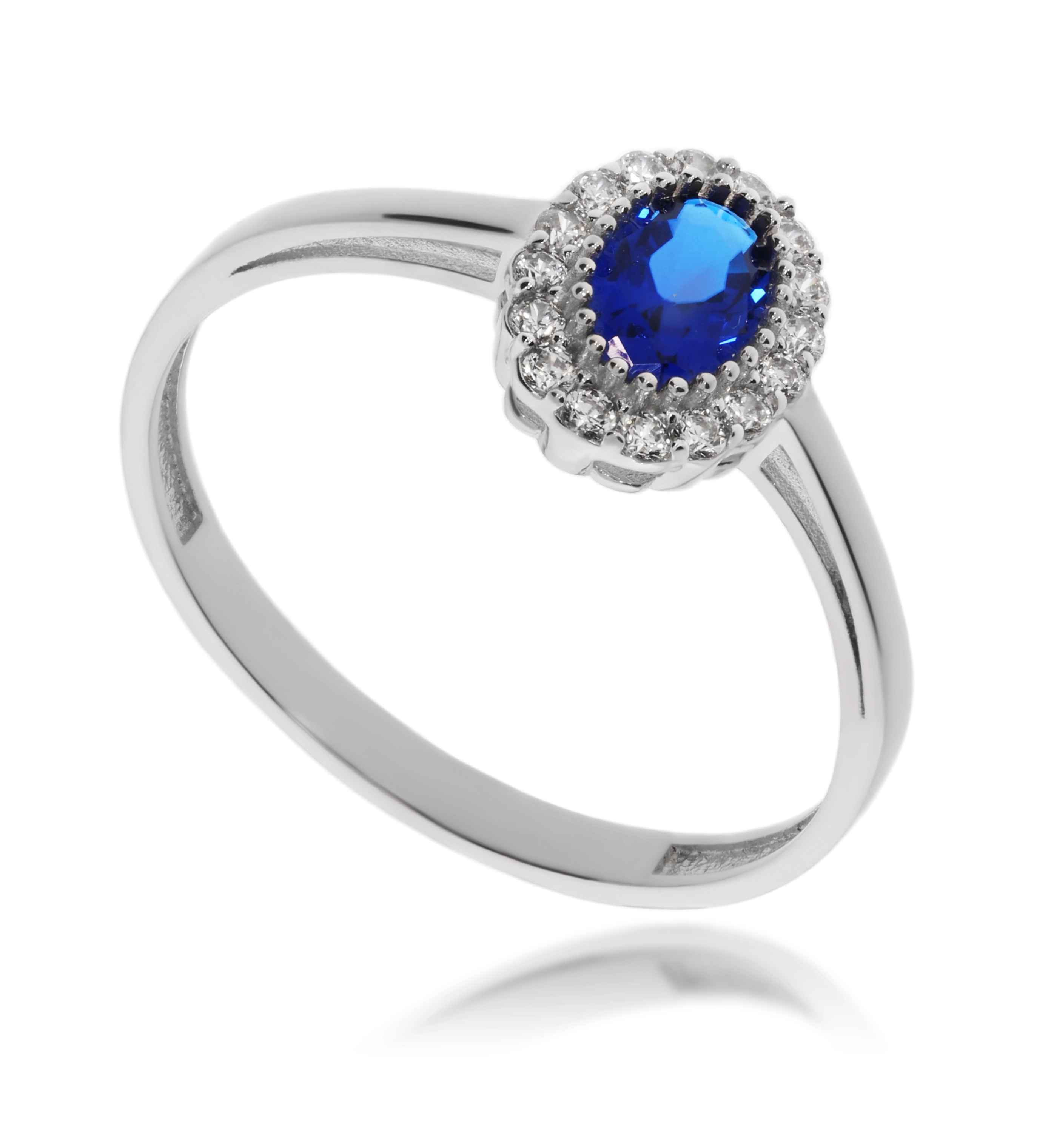 Elegantiškas moteriškas balto aukso žiedas su mėlynu cirkoniu 585