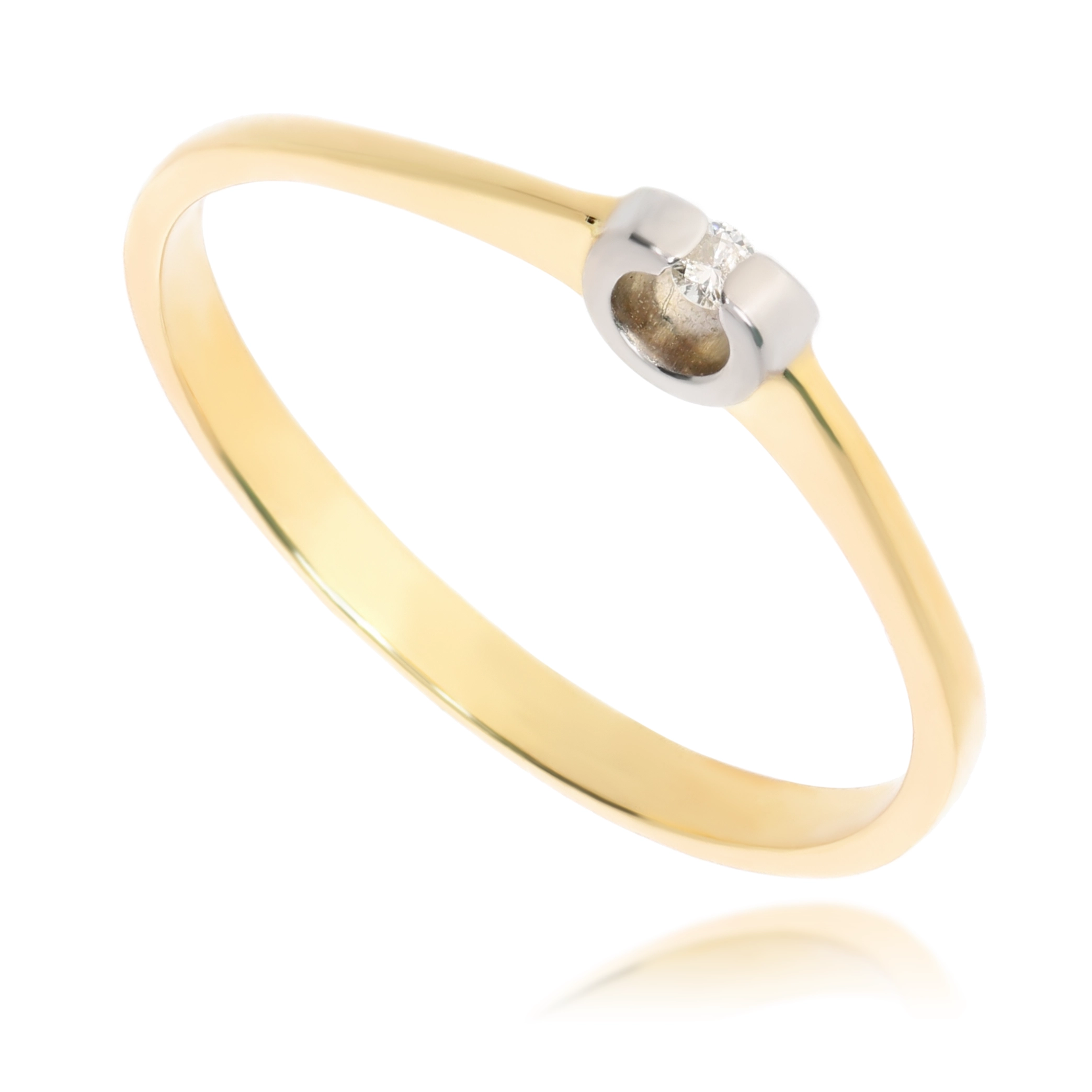 Žiedas pagamintas iš 585 prabos aukso, derinant šiltą geltono aukso spindesį su moderniu balto aukso akcentu, kuris pabrėžia centrinio deimanto grožį. Deimantas, kurio bendra masė yra 0,02 ct, pasižymi SI švarumu ir I spalva, užtikrinančia nuostabų blizgesį ir skaidrumą. Apatinės briaunos plotis yra 2 mm, o viršutinės dalies plotis/ilgis – 3 mm, suteikiant žiedui subtilų, bet išraiškingą siluetą. Šis žiedas sukurtas moteriai, kuri vertina klasikinį stilių su moderniu prieskoniu, ieškodama papuošalo, kuris atspindėtų jos unikalumą ir eleganciją.