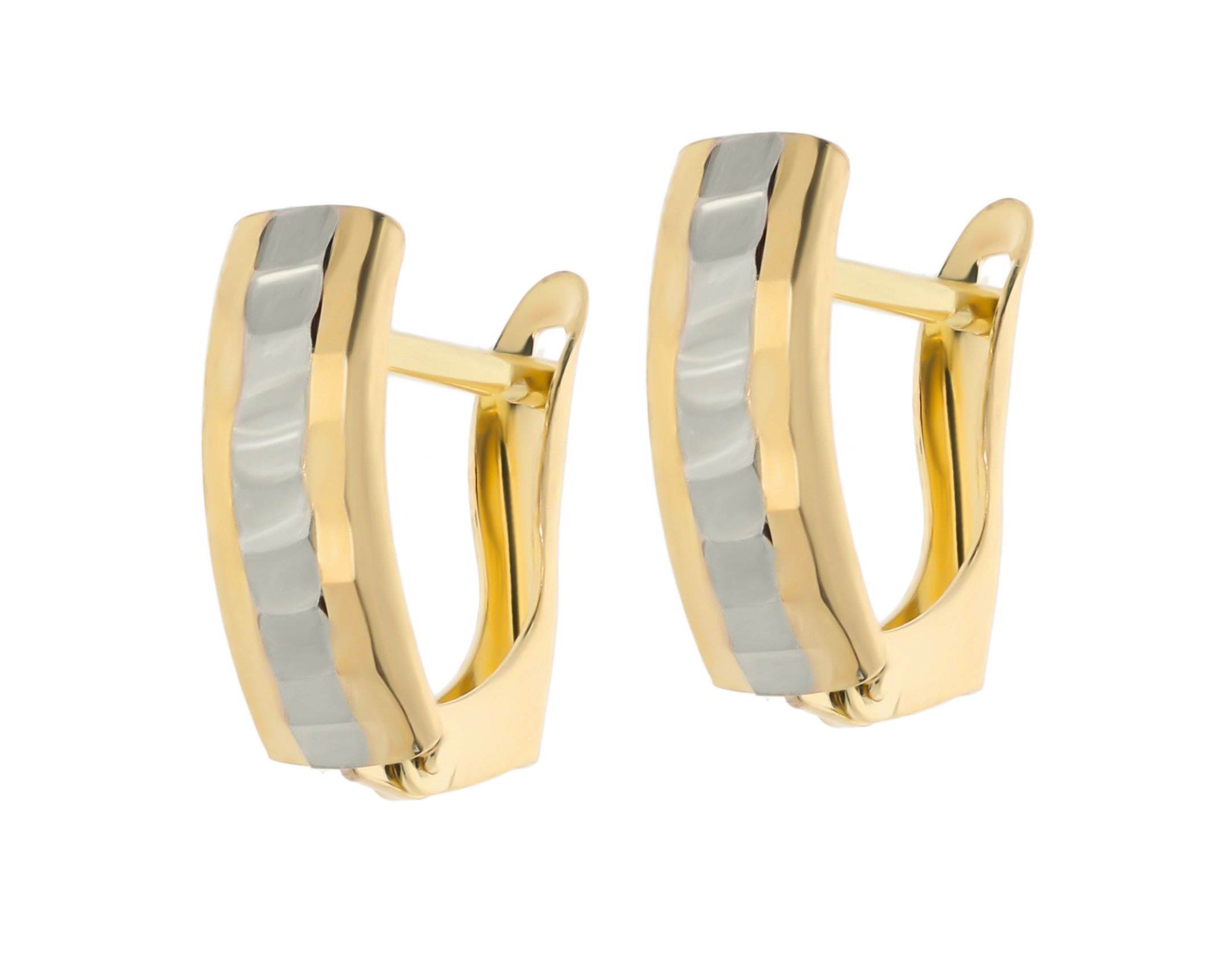 Jų dizainas išsiskiria modernia elegancija: geltono aukso briaunos švelniai apgaubia centrinę, subtiliai raižytą balto aukso juostelę, kuri sukuria žaismingą šviesos ir šešėlių efektą. Šis dviejų spalvų aukso derinys suteikia auskarams gyvybės ir išskirtinumo, pabrėžiant jūsų unikalų stilių. Auskarų ilgis yra 1,3 cm, o plotis – 4 mm, todėl jie yra pakankamai pastebimi, bet ne per daug įkyrūs, idealiai tinkantys bet kokiai progai.