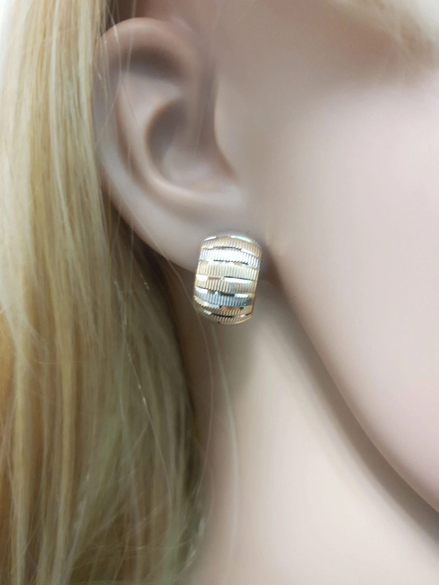 Pagaminti iš aukščiausios kokybės 585 prabos aukso, šie auskarai žavi savo unikaliu dizainu. Jų forma primena pusmėnulį, o paviršius dekoruotas išraiškingomis, banguotomis juostelėmis, kurios kaitaliojasi tarp šilto geltono ir spindinčio balto aukso. Šis dviejų spalvų derinys sukuria dinamišką ir modernų įvaizdį, kuris puikiai derės tiek prie kasdienio, tiek prie šventinio ansamblio. Auskarų ilgis yra 1,8 cm, o plotis – 1,1 cm, todėl jie yra pakankamai pastebimi, bet ne per daug masyvūs, idealiai tinkantys pabrėžti Jūsų veido bruožus.