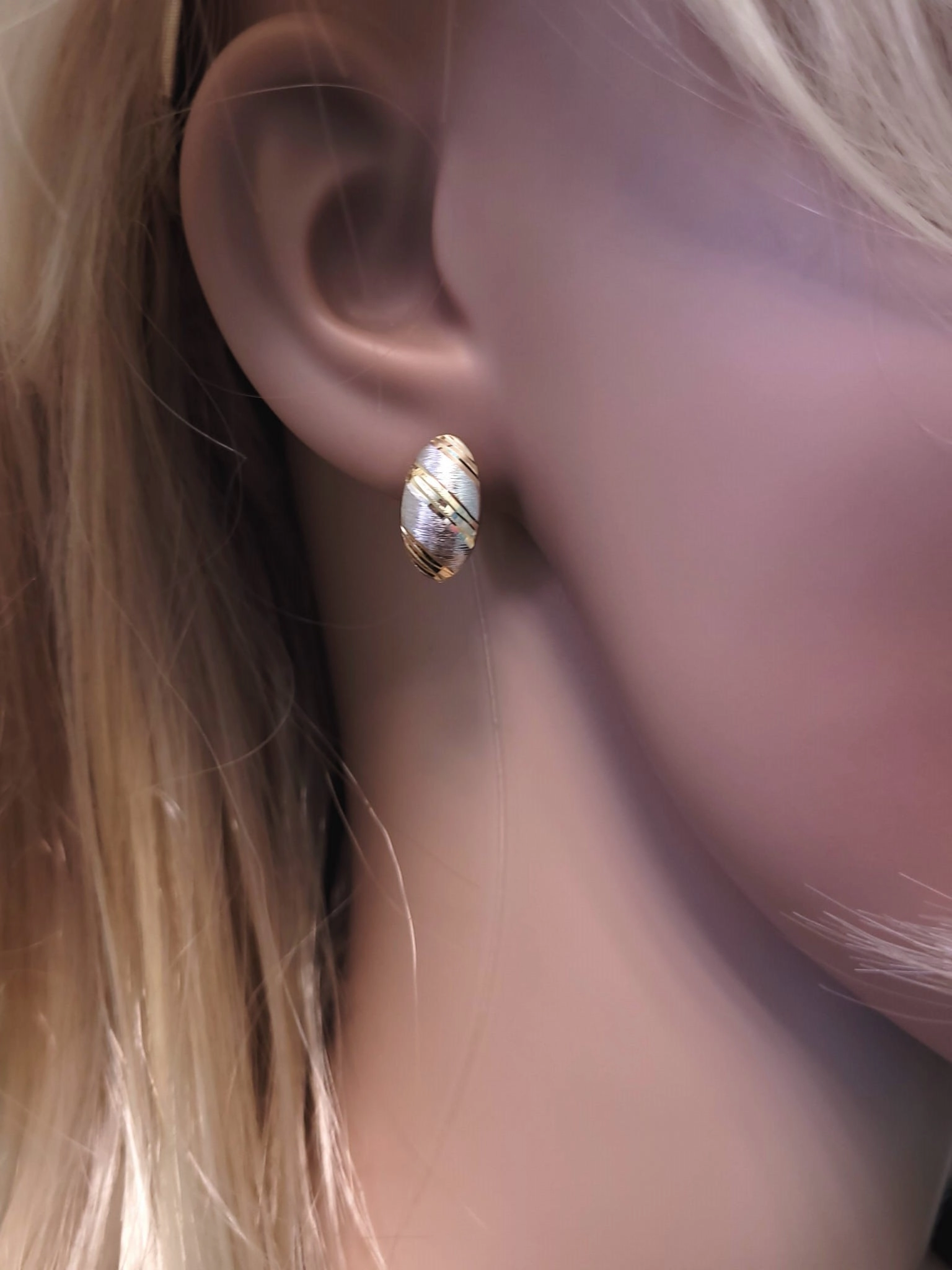 Auskarų forma yra ovalo, o paviršius dekoruotas matinėmis ir blizgiomis juostelėmis, kurios suteikia dinamiškumo ir žaismingumo. Šis išskirtinis raštas sukuria optinę iliuziją, pabrėžiančią auskarų grakštumą ir prabangą. Jų ilgis siekia 1,5 cm, o plotis – 8,0 mm, todėl jie puikiai tinka kasdieniam nešiojimui, suteikdami jūsų įvaizdžiui rafinuotumo, bet taip pat puikiai dera prie vakarinių ansamblių, pabrėždami jūsų unikalų stilių.