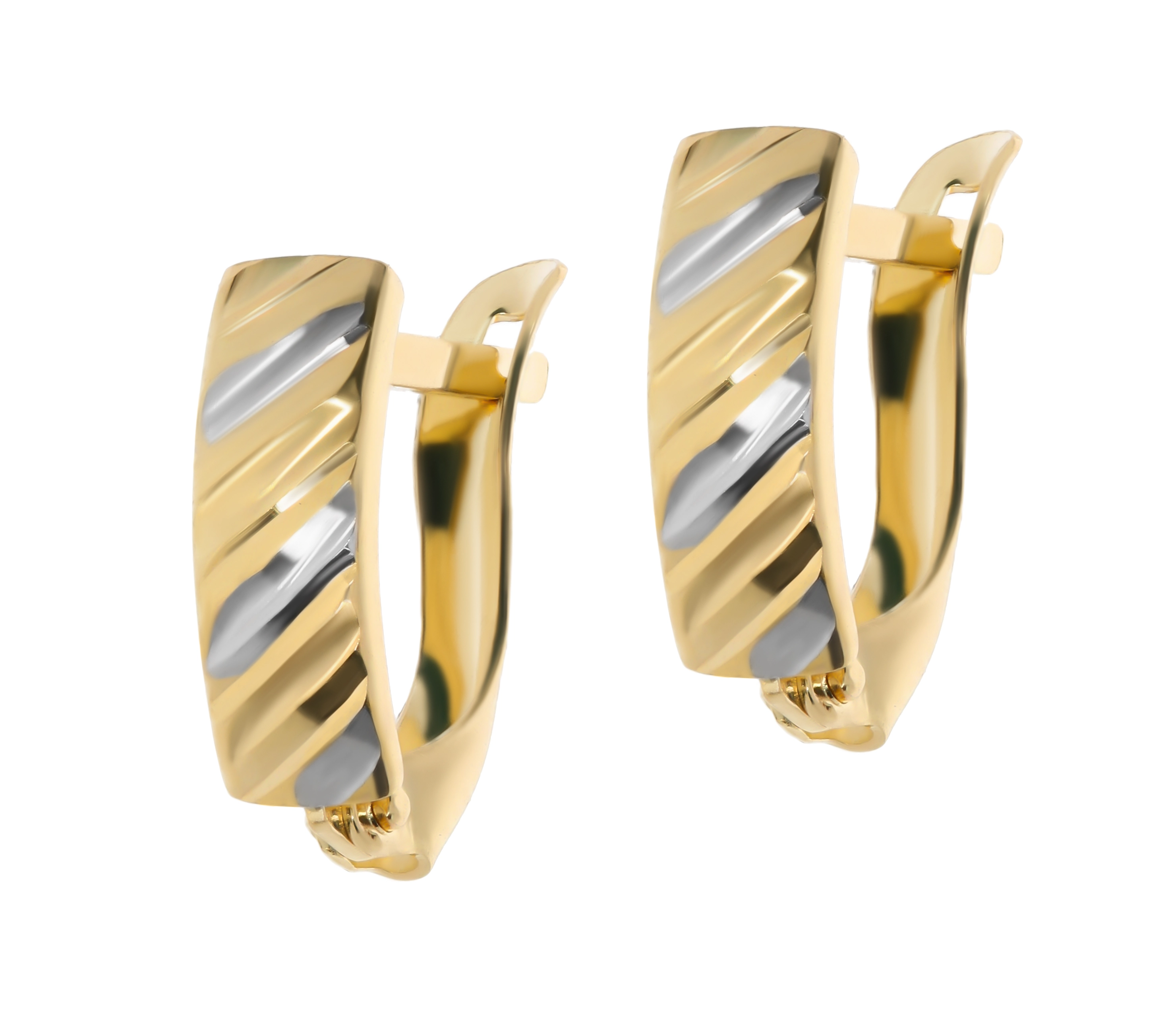 Atraskite nepakartojamą eleganciją su šiais išskirtiniais auskarais, kurie taps Jūsų mėgstamiausiu akcentu kiekvienai progai. Šie nuostabūs auskarai, pagaminti iš aukščiausios kokybės 585 prabos geltono aukso, pasižymi subtiliu, bet ryškiu dizainu, papuoštu balto aukso intarpais, kurie sukuria žaismingą ir modernų kontrastą. Jų briaunos dekoruotos įstrižais raštais, suteikiančiais auskarams dinamiškumo ir šiuolaikiškumo.
