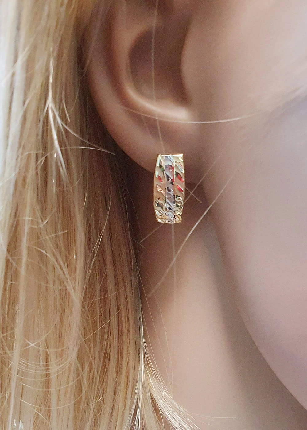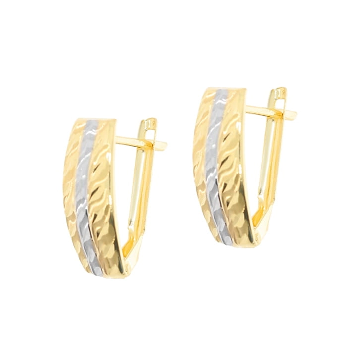 Auskarų dizainas išsiskiria modernumu ir rafinuotumu. Jų ilgis siekia 1,75 cm, o plotis – 8 mm, todėl jie yra pakankamai pastebimi, tačiau ne per daug įkyrūs. Geltono ir balto aukso derinys sukuria unikalų vizualinį efektą, o subtilus raštas ant paviršiaus suteikia auskarams papildomo žavesio ir žaismingumo. Šie auskarai puikiai tinka tiek kasdieniam dėvėjimui, tiek ypatingoms progoms, pabrėžiant Jūsų individualumą ir nepriekaištingą skonį. Tai puiki dovana moteriai, kuri vertina kokybę, stilių ir nori jaustis išskirtine.