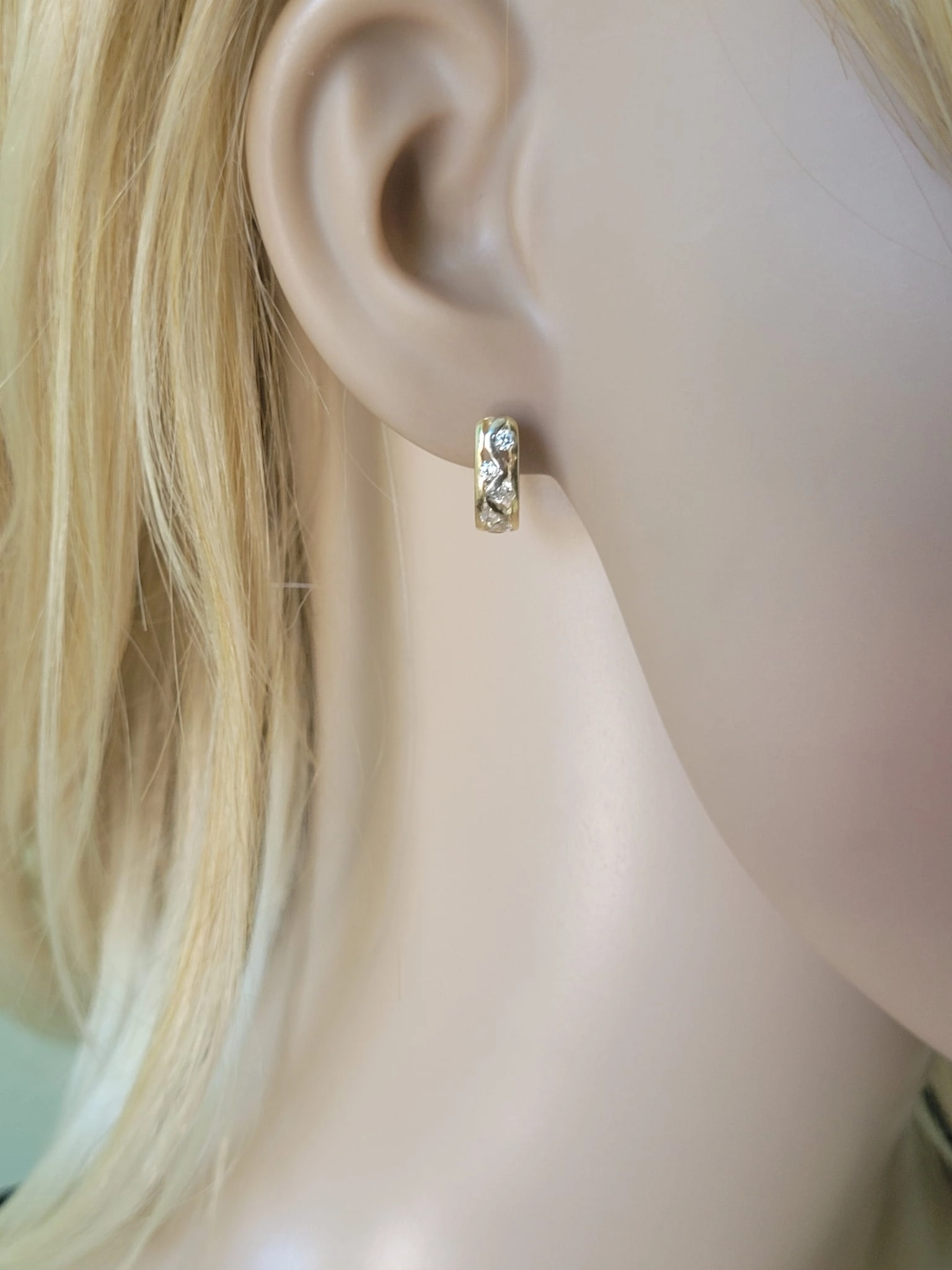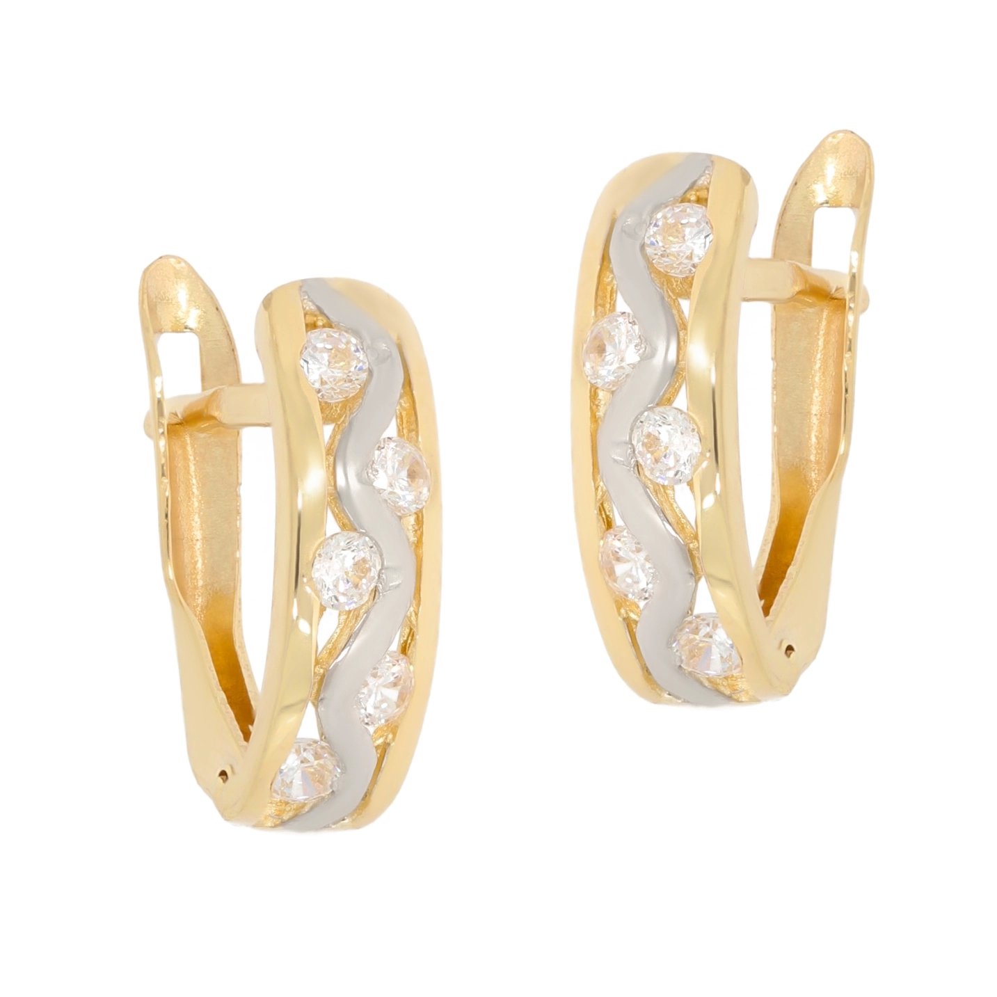 Atraskite eleganciją ir švytėjimą su šiais nuostabiais moteriškais auskarais, pagamintais iš aukščiausios kokybės 585 prabos dviejų spalvų aukso. Šie auskarai – tai tikras meno kūrinys, kuriame susilieja klasika ir modernumas, sukuriantys nepakartojamą įspūdį. Jų dizainas išsiskiria subtiliais geltono ir balto aukso bangavimo raštais, inkrustuotais spindinčiais baltais cirkoniais, kurie suteikia auskarams gyvybės ir prabangos.