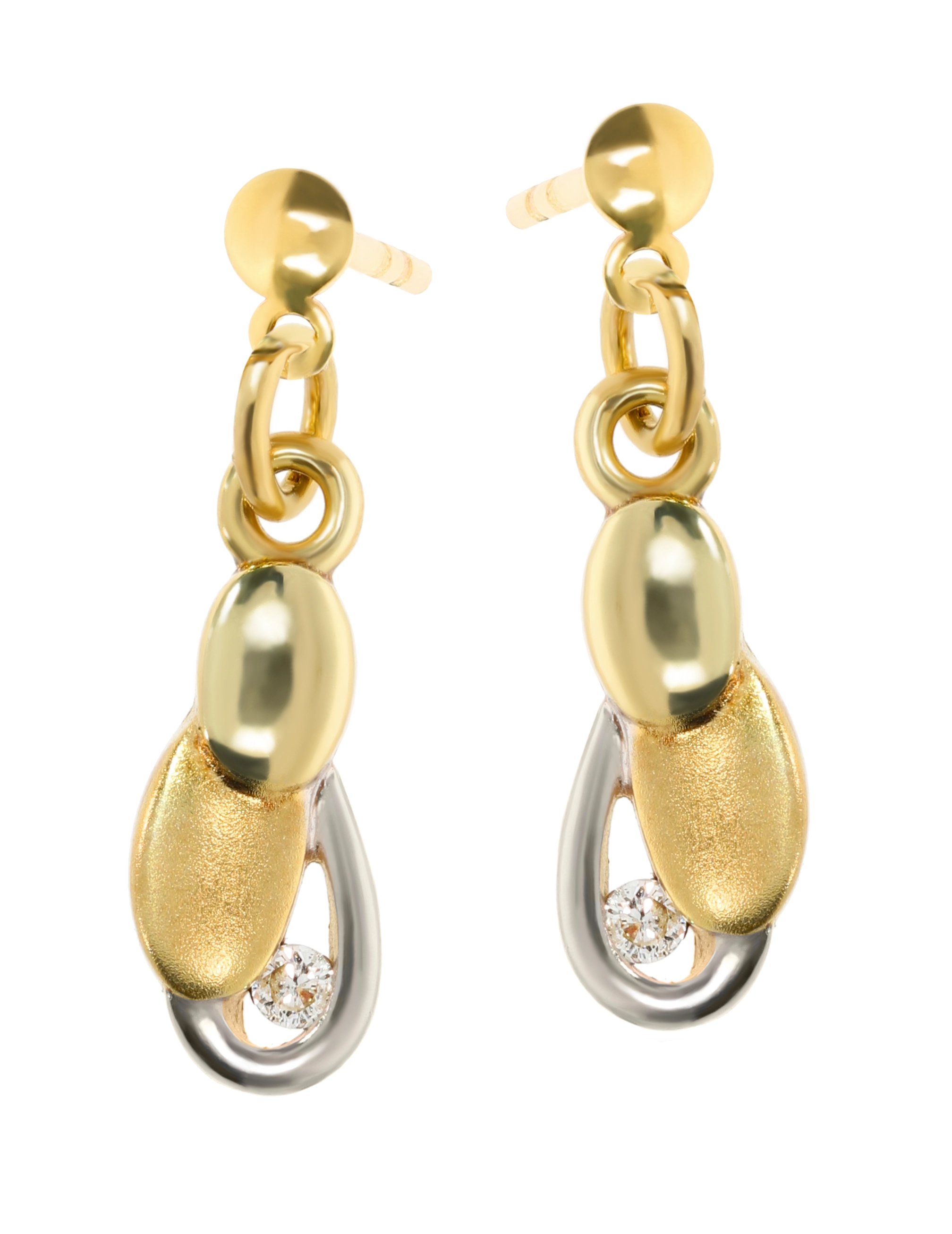 Šių auskarų žavesį vainikuoja žėrintys deimantai, kurių bendra masė siekia 0,05 ct, pasižymintys SI švarumu ir H spalva. Deimantai yra įmontuoti į balto aukso lašo formos elementą, suteikiantį auskarams lengvumo ir grakštumo. Geltono aukso elementai, vienas poliruotas, kitas matinio paviršiaus, sukuria įdomų tekstūrinį kontrastą, pabrėžiantį juvelyrinio dirbinio unikalumą. Auskarų ilgis yra 2 cm, o plotis – 5 mm, todėl jie puikiai tinka tiek kasdieniam nešiojimui, tiek ypatingoms progoms. Patogus štyfto tipo užsegimas užtikrina saugumą ir komfortą. Tai – puiki dovana moteriai, vertinančiai eleganciją, rafinuotumą ir subtilų spindesį.
