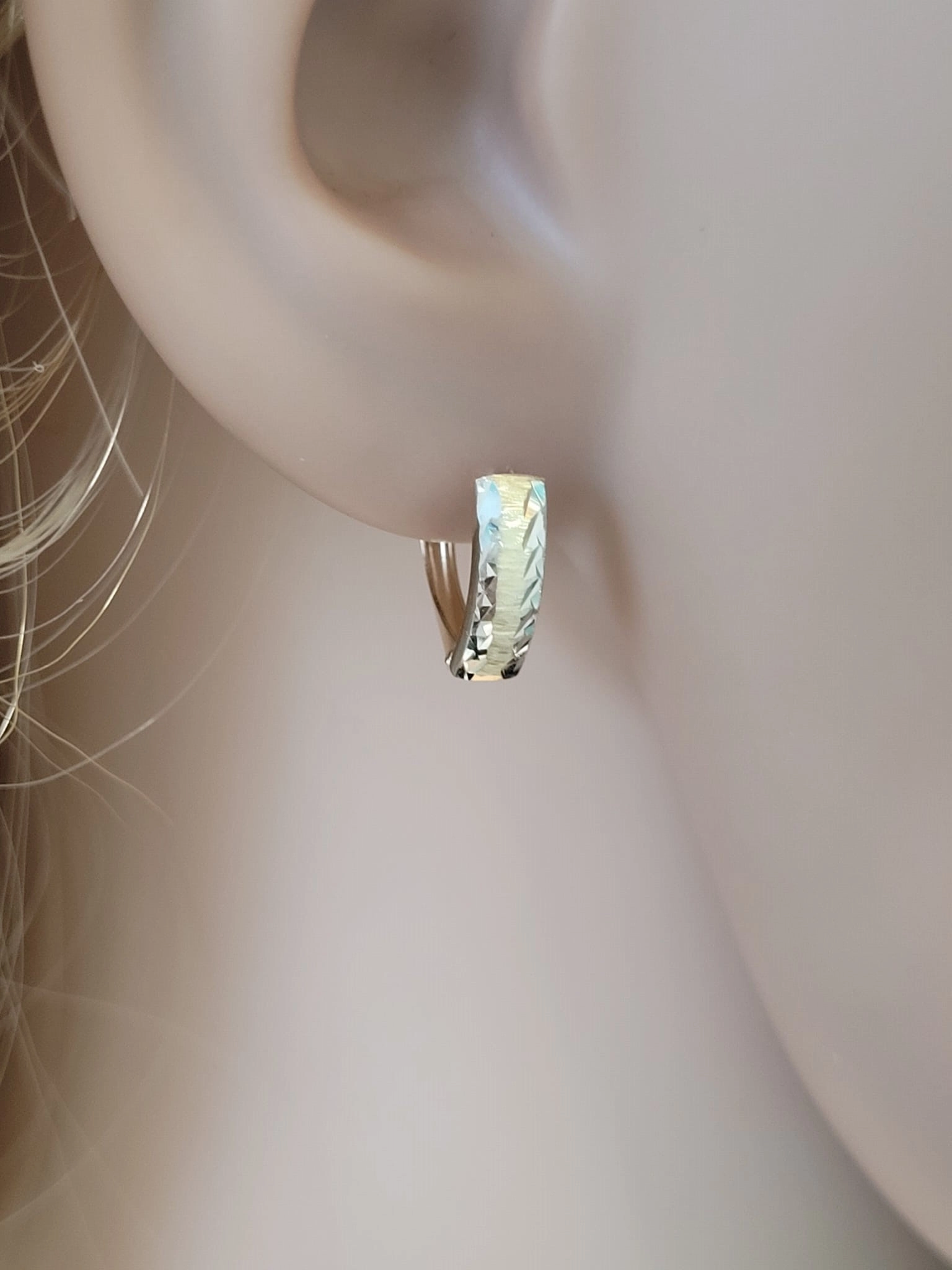 Atraskite išskirtinumą su šiais nuostabiais auskarais, kurie taps neatsiejama Jūsų stiliaus dalimi. Šie elegantiški auskarai, pagaminti iš aukščiausios kokybės 585 prabos geltono ir balto aukso, yra tikras juvelyrikos meno kūrinys. Jų dizainas išsiskiria subtiliu dviejų spalvų aukso deriniu ir unikaliais raižytais intarpais, kurie suteikia auskarams gyvybės ir žaismingumo. Kiekviena detalė apgalvota su meile ir preciziškumu, kad užtikrintų ne tik estetinį grožį, bet ir patogumą dėvint.