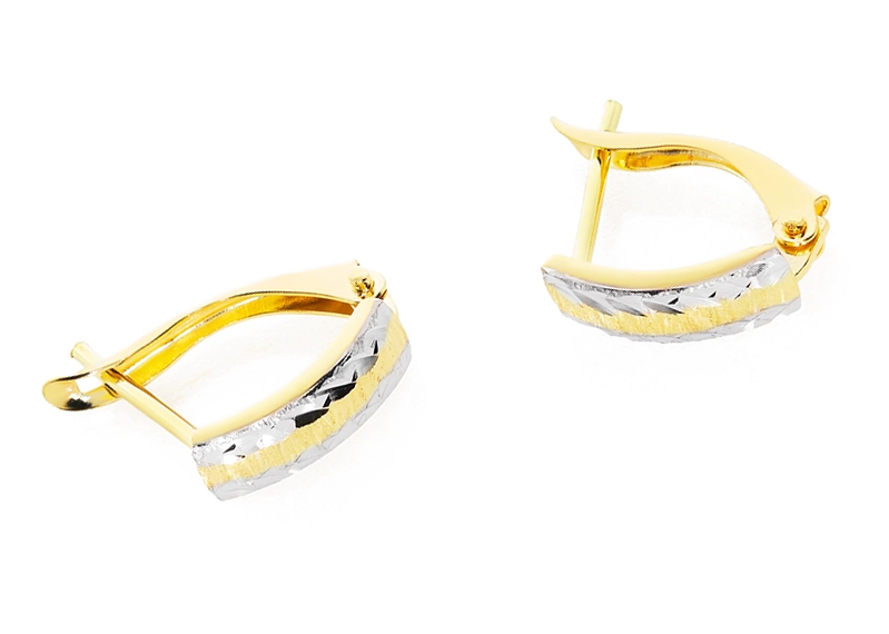 Elegantiški moteriški dviejų spalvų aukso auskarai su raižytais intarpais 585