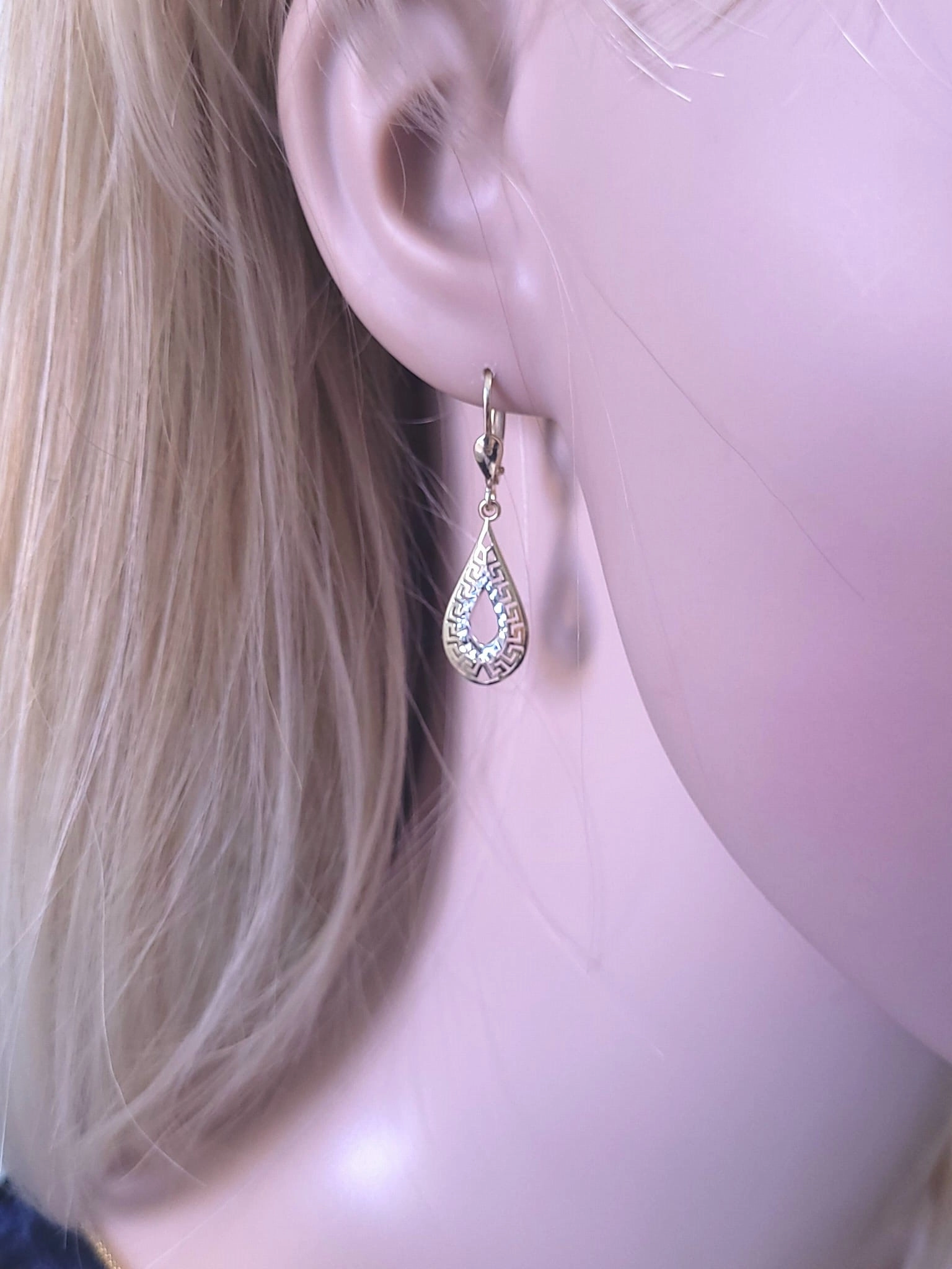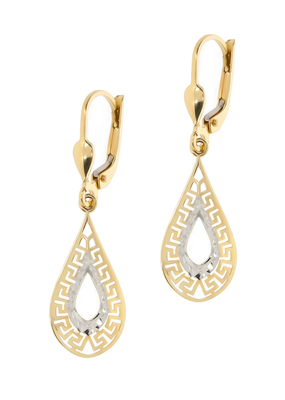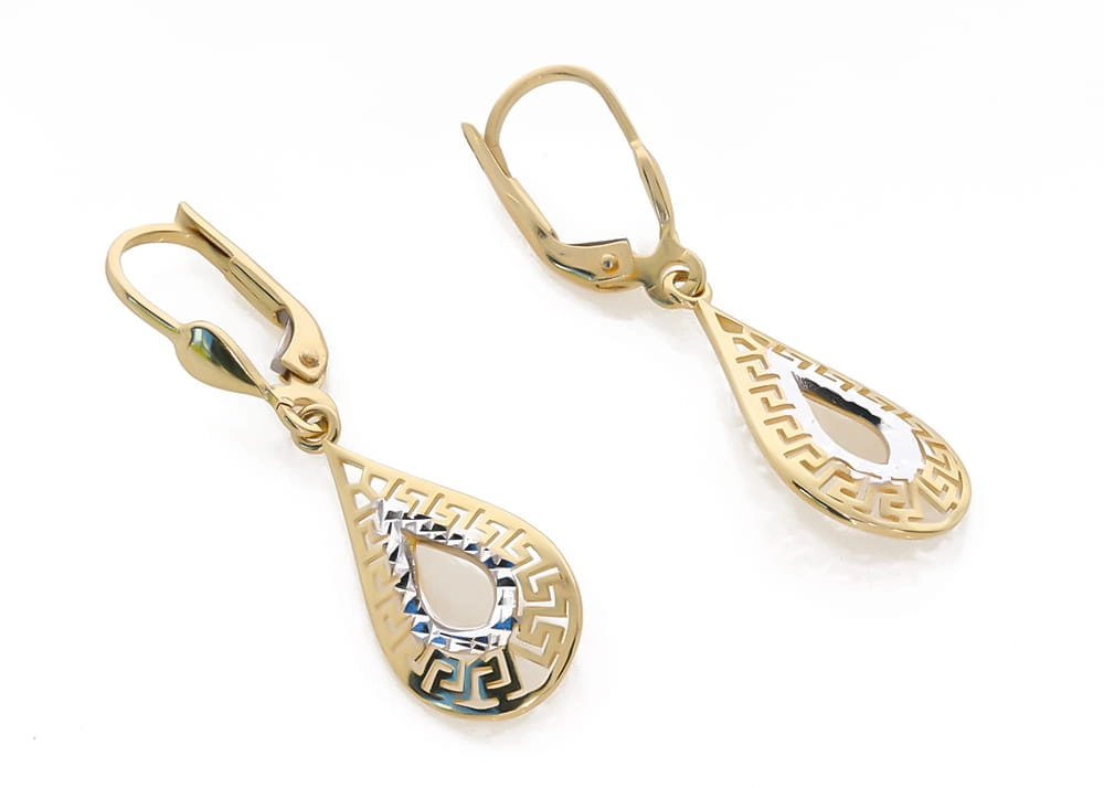 Auskarų dizainas išsiskiria modernia lašo forma, kurią puošia subtilus, geometrinis raštas, įkvėptas klasikinės graikų meandro simbolikos. Šis raštas, subtiliai derinamas su balto aukso intarpu, sukuria įspūdingą dviejų spalvų aukso žaismą, suteikiantį auskarams unikalumo ir prabangos. Auskarų ilgis yra 3,5 cm, o plotis – 1,0 cm, todėl jie yra pakankamai pastebimi, bet kartu ir elegantiški, neapsunkinantys Jūsų įvaizdžio.