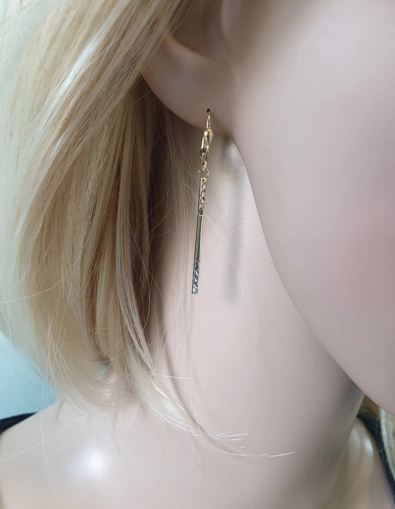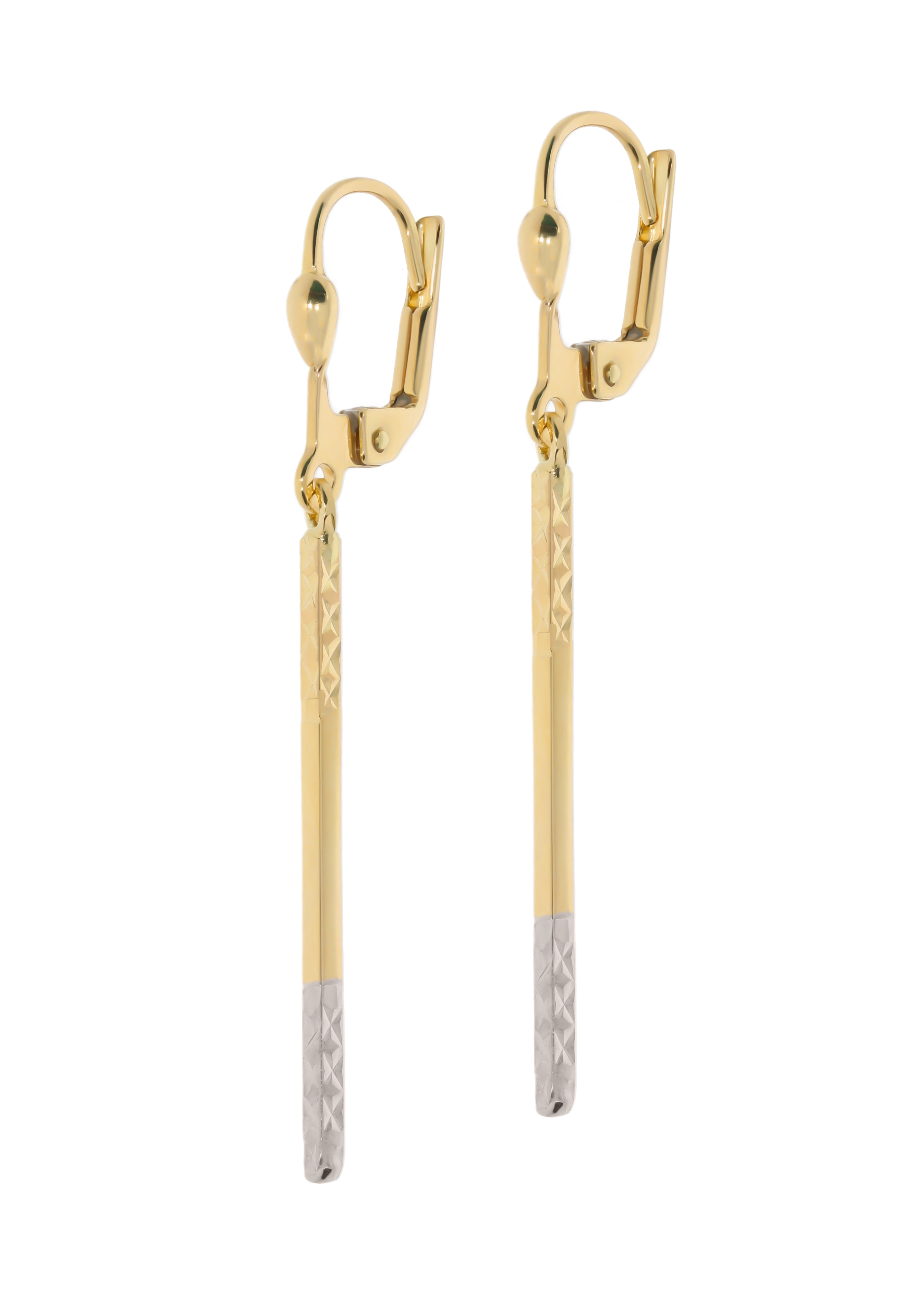 Kiekvienas auskaras pasižymi dviejų spalvų aukso deriniu: viršutinė dalis spinduliuoja šiltu geltonu auksu, o apatinė dalis subtiliai pereina į baltą auksą, papuoštą raižytu raštu. Šis išskirtinis dizainas suteikia auskarams gyvybės ir dinamiškumo, pabrėžiant Jūsų individualumą. Auskarų ilgis yra 5 cm, o plotis – 2 mm, todėl jie yra pakankamai ilgi, kad atkreiptų dėmesį, tačiau pakankamai subtilūs, kad tiktų kasdieniam dėvėjimui. Patogus užsegimas užtikrina, kad auskarai patikimai laikysis visą dieną.