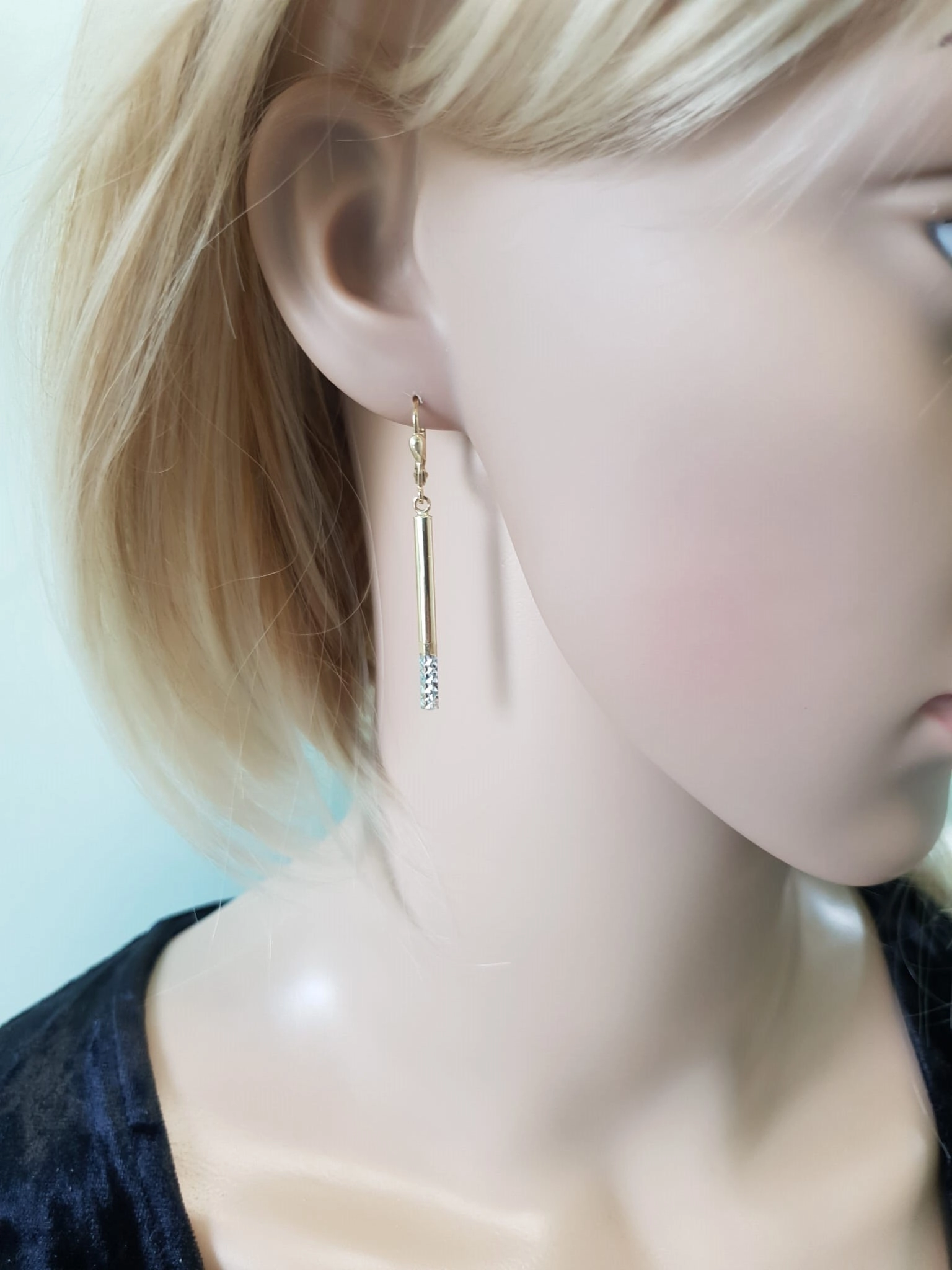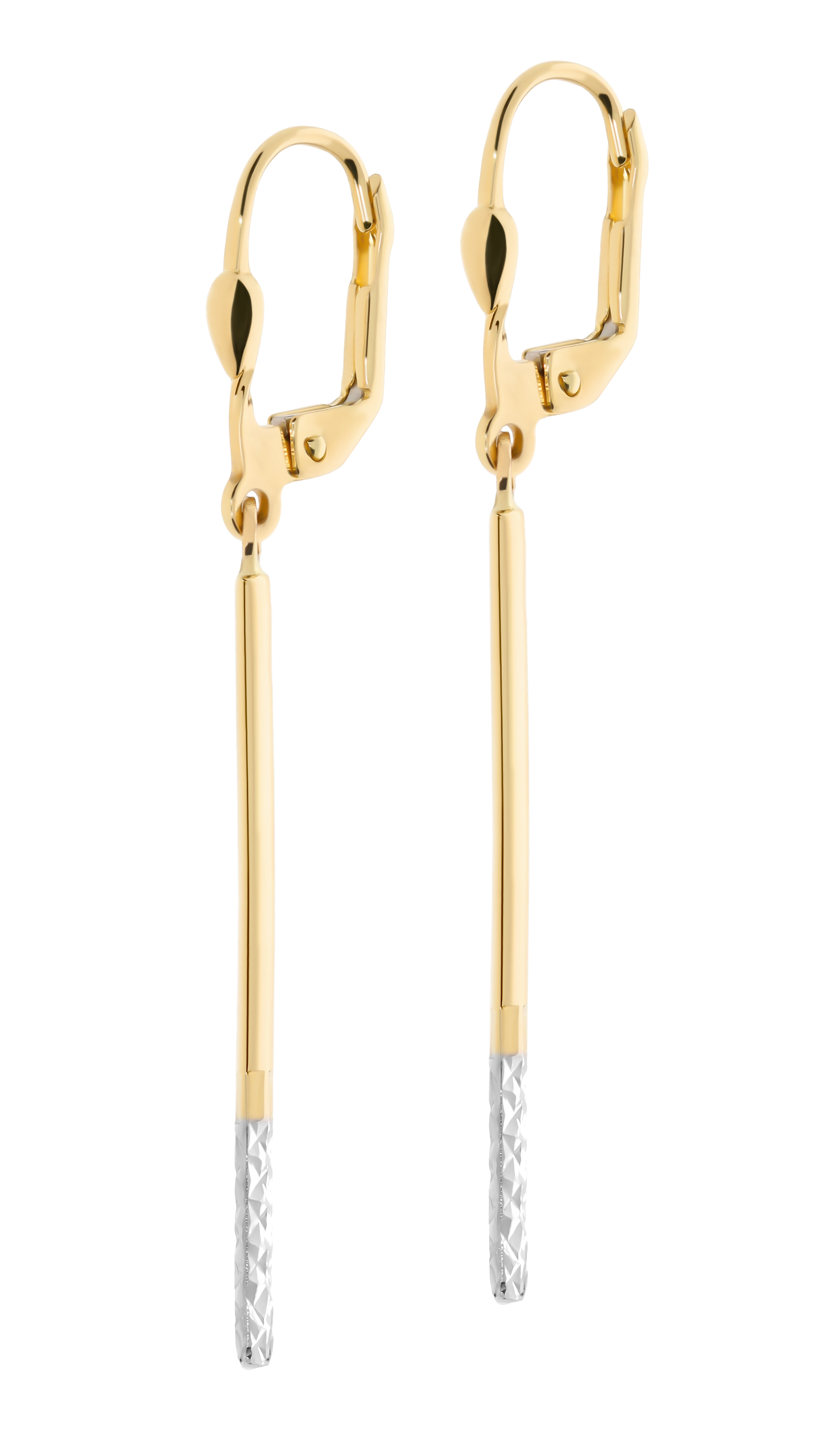 Pagaminti iš aukščiausios kokybės 585 prabos aukso, šie auskarai žavi savo dviejų spalvų aukso deriniu: klasikinio geltono aukso ir subtilaus balto aukso, kuris puošia apatinę auskarų dalį. Baltojo aukso segmentas yra subtiliai raižytas, suteikiant jam unikalios tekstūros ir žaismingo spindesio, kuris puikiai kontrastuoja su lygiu geltono aukso paviršiumi. Auskarų ilgis yra 4,80 cm, o plotis – 3 mm, todėl jie yra pakankamai ilgi, kad atkreiptų dėmesį, bet kartu ir pakankamai ploni, kad atrodytų grakščiai ir lengvai. Tai puiki dovana bet kokia proga – gimtadienio, jubiliejaus ar tiesiog norint palepinti save ar artimą žmogų išskirtiniu juvelyrikos kūriniu, kuris neabejotinai taps mėgstamiausiu aksesuaru.