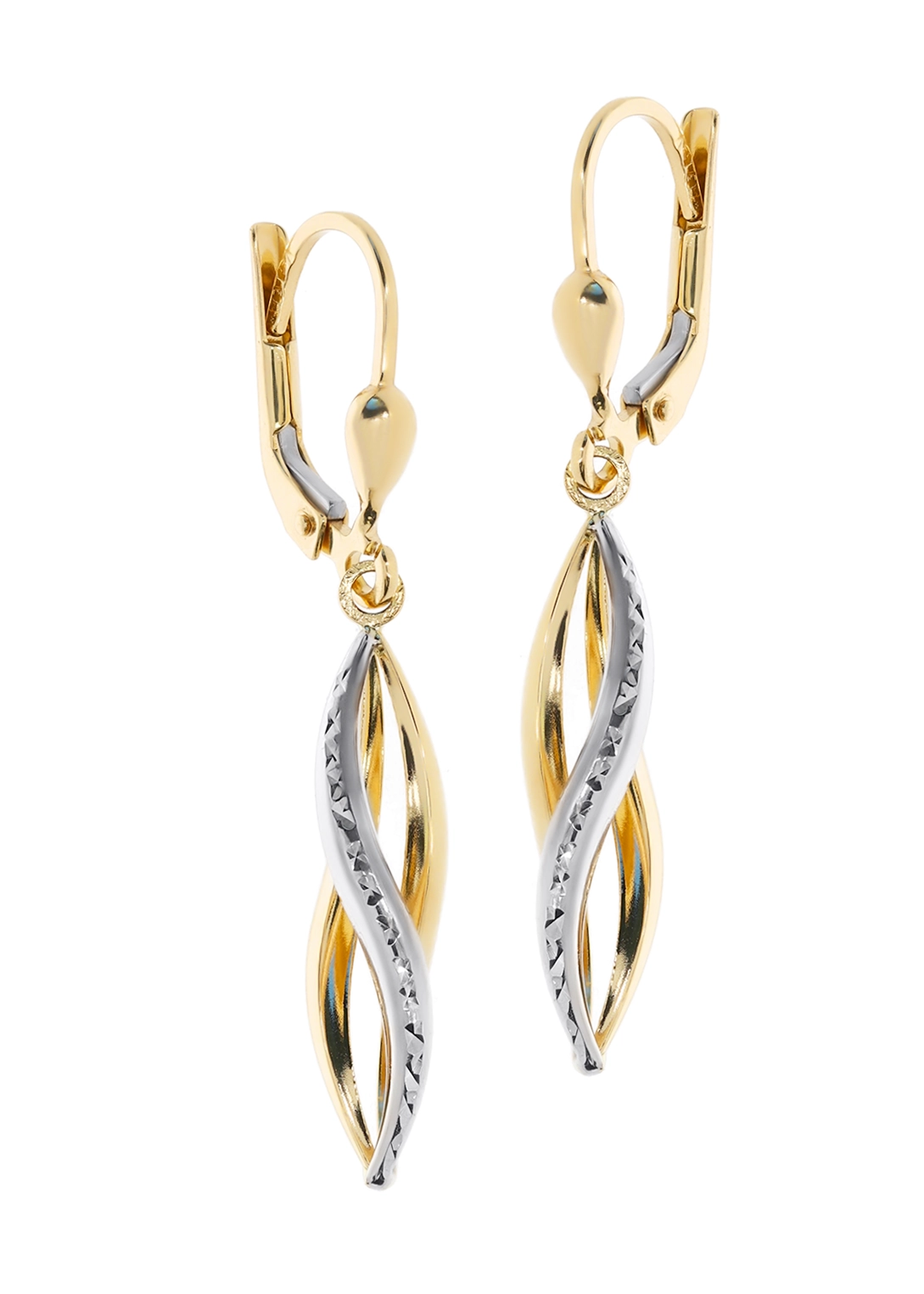 Šie kabantys auskarai pagaminti iš aukščiausios kokybės 585 prabos aukso, derinant klasikinį geltoną auksą su moderniu baltu auksu. Jų unikalus dizainas, kurio ilgis siekia 4,00 cm, o plotis – 5,0 mm, sukuria subtilų, bet įsimintiną įvaizdį. Kiekviena detalė, nuo elegantiškos formos iki preciziškai apdirbtų paviršių, atspindi meistriškumą ir aistrą juvelyrikai. Balto aukso elementai yra subtiliai raižyti, suteikiantys auskarams papildomo žavesio ir žaismingumo, kuris puikiai dera su lygiu geltono aukso spindesiu.