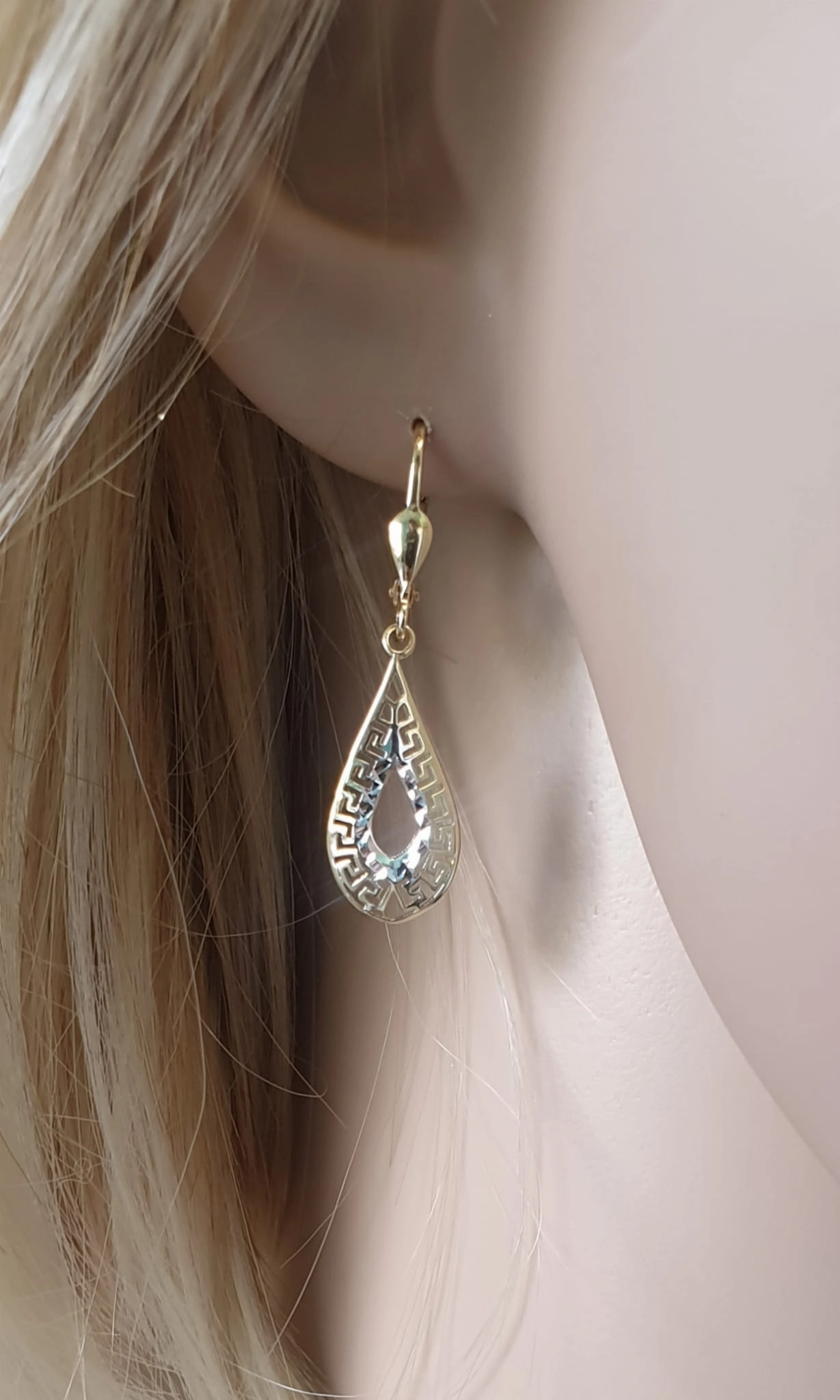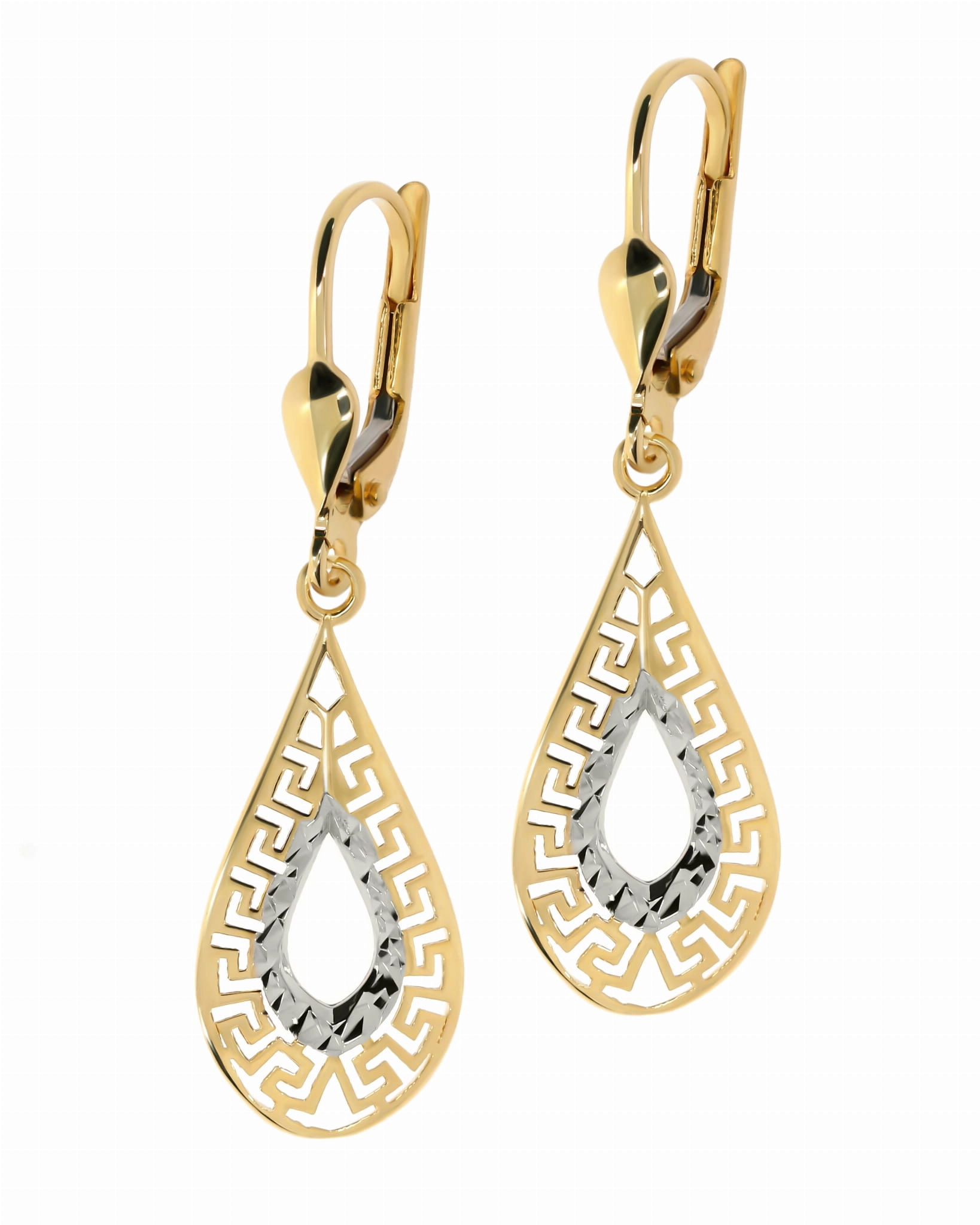 Auskarai pasižymi gracinga lašo forma, kuri subtiliai papuoš Jūsų veidą. Jų dizainas išsiskiria unikaliu dviejų spalvų aukso deriniu: švytintis geltonas auksas apjungia balto aukso intarpą, dekoruotą raštu, primenančiu graikišką meandro ornamentą. Šis raštas suteikia auskarams ne tik išskirtinumo, bet ir istorinio pasakojimo dvelksmo. Balto aukso intarpas yra dailiai briaunotas, kas suteikia papildomo žavesio ir žaismingumo šviesoje.