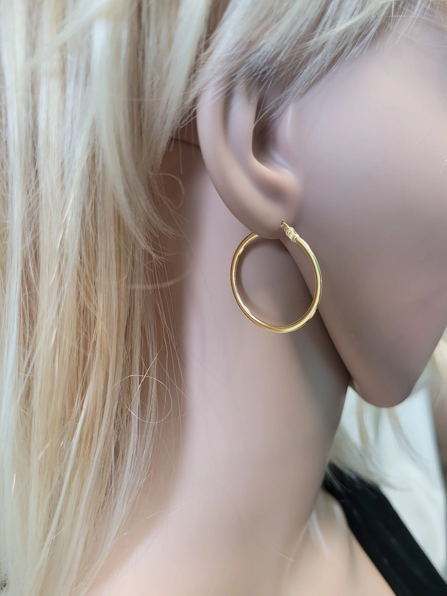 Kiekviena detalė sukurta su aistra ir preciziškumu, siekiant užtikrinti maksimalų komfortą ir ilgaamžiškumą. Jų klasikinė apvali forma ir minimalistinis dizainas pabrėžia moteriškumą ir suteikia Jums išskirtinio žavesio. Auskarų ilgis yra 2,8 cm, o plotis – 1 mm, todėl jie yra pakankamai pastebimi, bet ne per daug įkyrūs, idealiai subalansuoti elegancijai. Tai puiki dovana moteriai, vertinančiai klasikinę juvelyriką ir norinčiai savo kolekciją papildyti universaliu, bet kartu ir išskirtiniu akcentu.