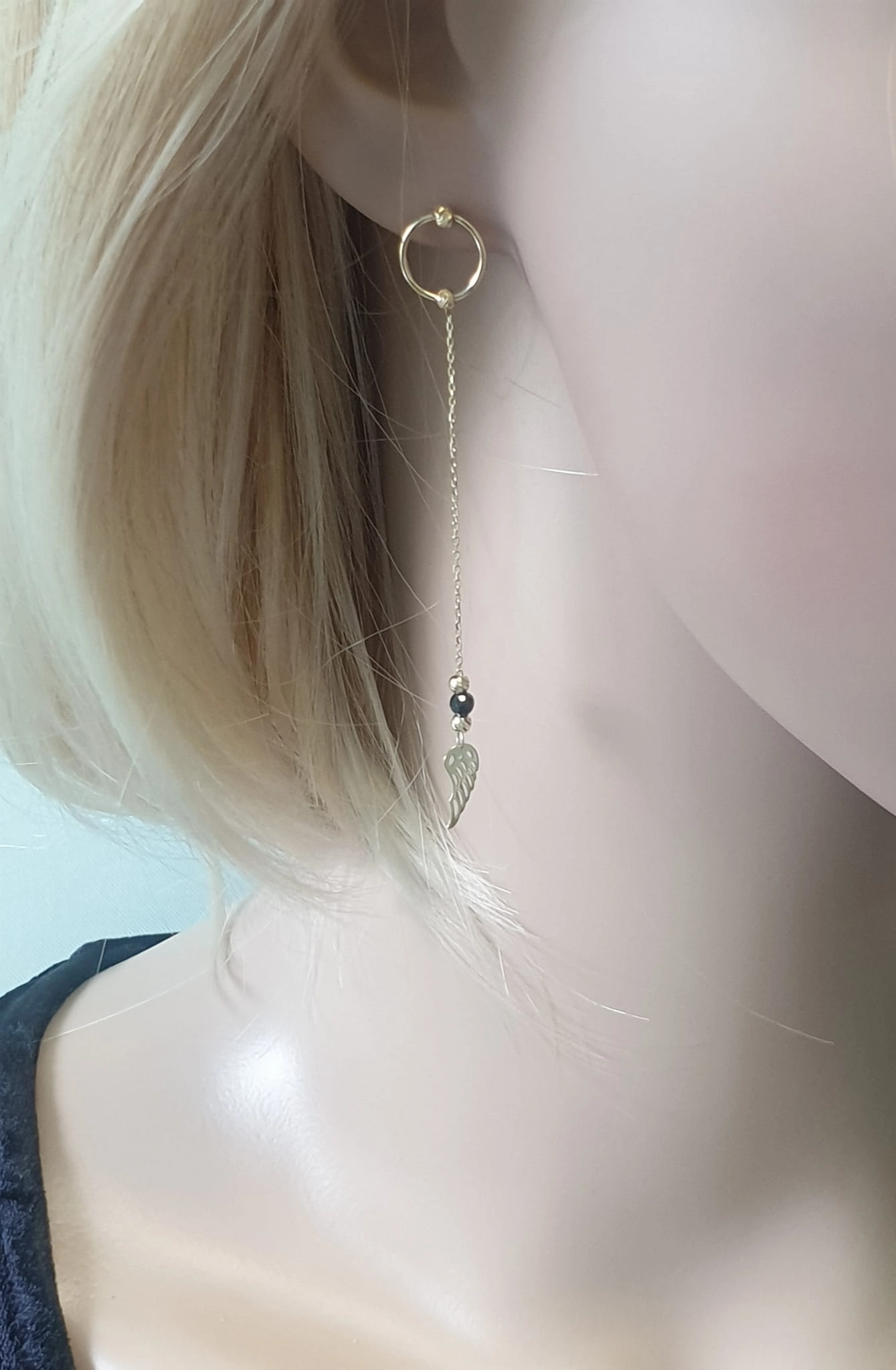 Šie ilgaamžiai auskarai, pagaminti iš aukščiausios kokybės 585 prabos geltono aukso, yra puikus pasirinkimas tiek kasdienai, tiek ypatingoms progoms. Auskarų ilgis siekia 7 cm, o plotis – 5 mm, suteikiant jiems subtilų, bet pastebimą žavesį. Žaismingi sparnelių motyvai, inkrustuoti juodais cirkoniais, sukuria kerintį kontrastą su švytinčiu auksu, o juodos spalvos akcentai suteikia paslaptingumo ir rafinuotumo. Tai puiki dovana moteriai, kuri vertina originalumą ir nori jaustis išskirtine.