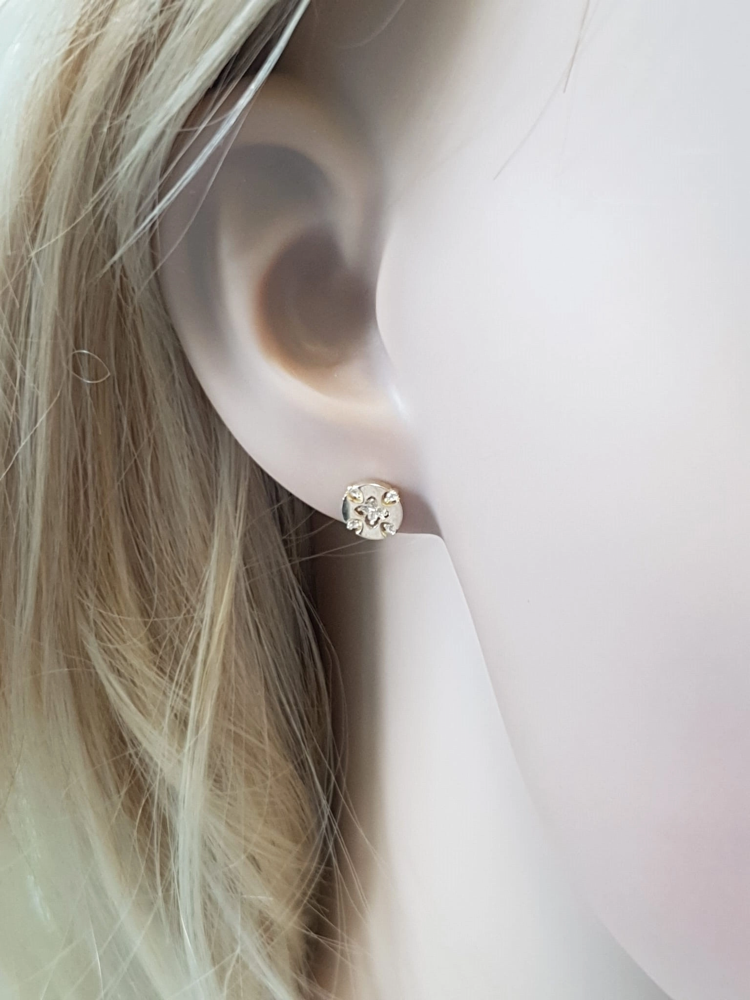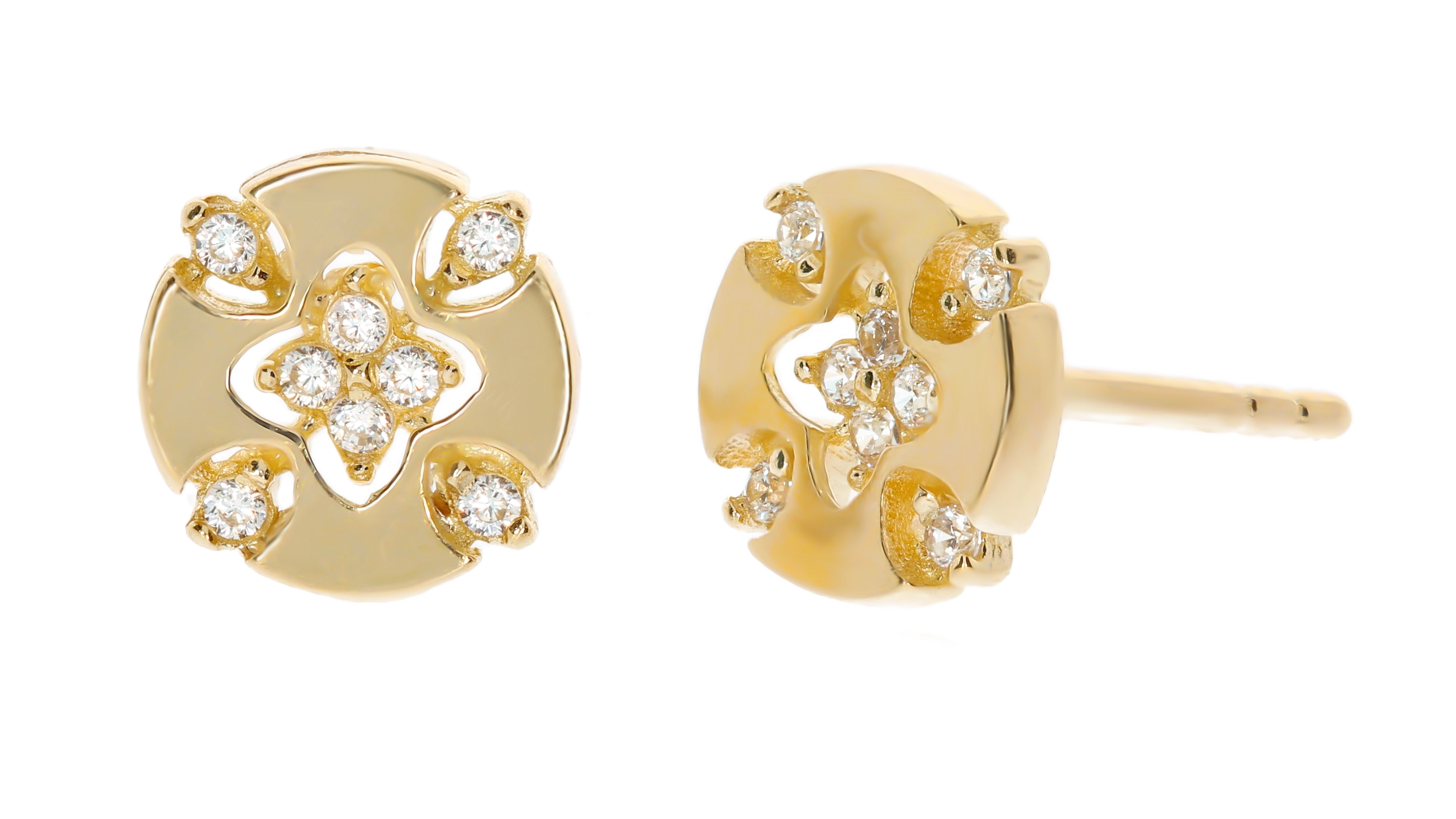 Pristatome išskirtinius geltono aukso auskarus, kurie spinduliuoja elegancija ir rafinuotumu. Šie apvalios formos auskarai, dekoruoti subtiliu keturlapio dobilo motyvu centre, įkūnija prabangą ir stilių. Kiekvienas lapelis puoštas žėrinčiais baltais cirkoniais, kurie atspindi šviesą ir sukuria nepakartojamą spindesį. Papildomi cirkoniai, išdėstyti aplink dobilo motyvą, suteikia auskarams dar daugiau žavesio ir išskirtinumo.
