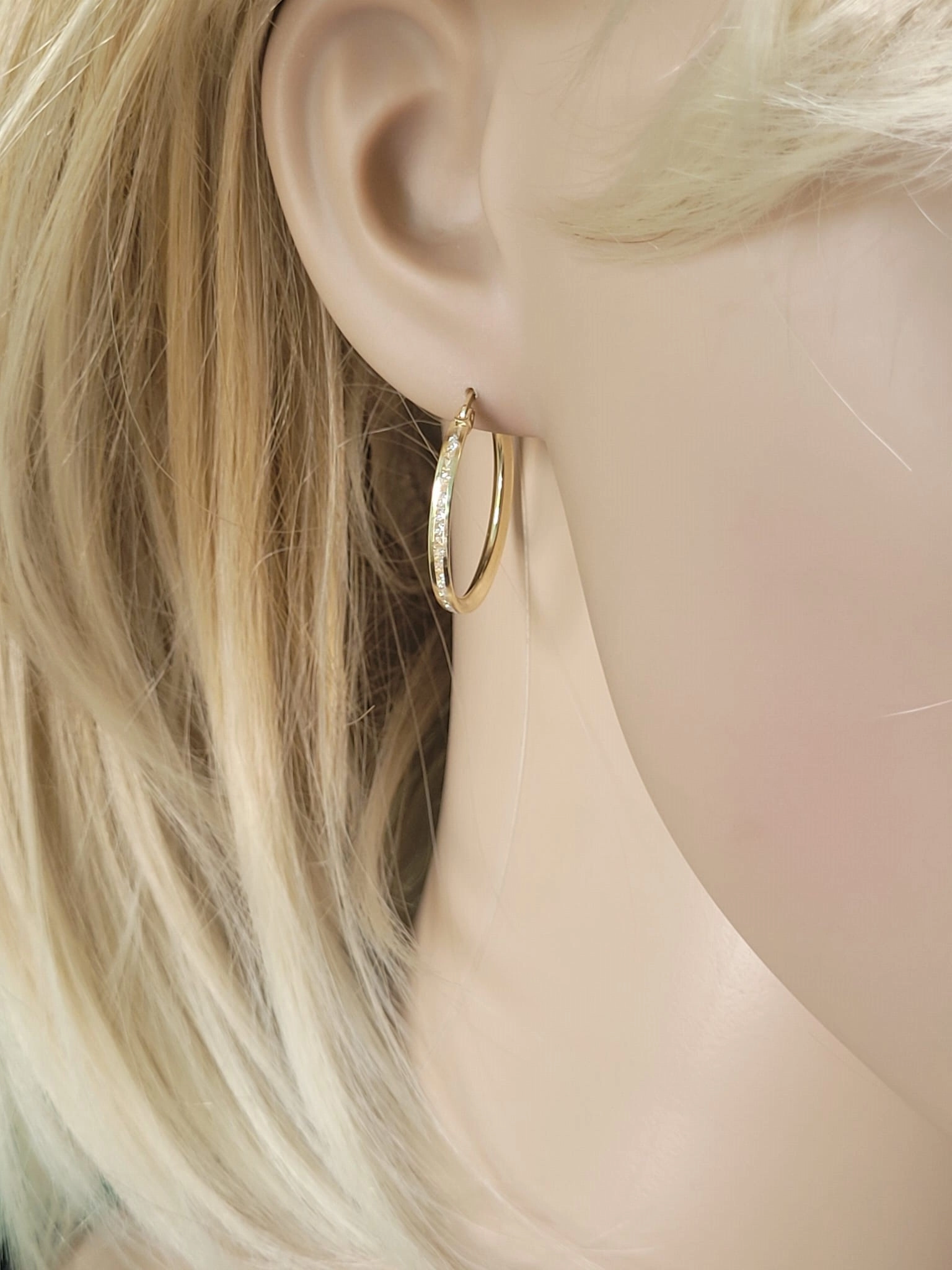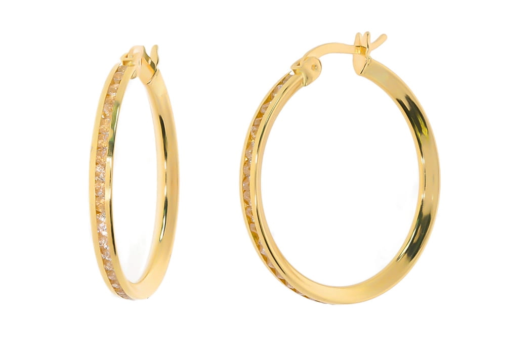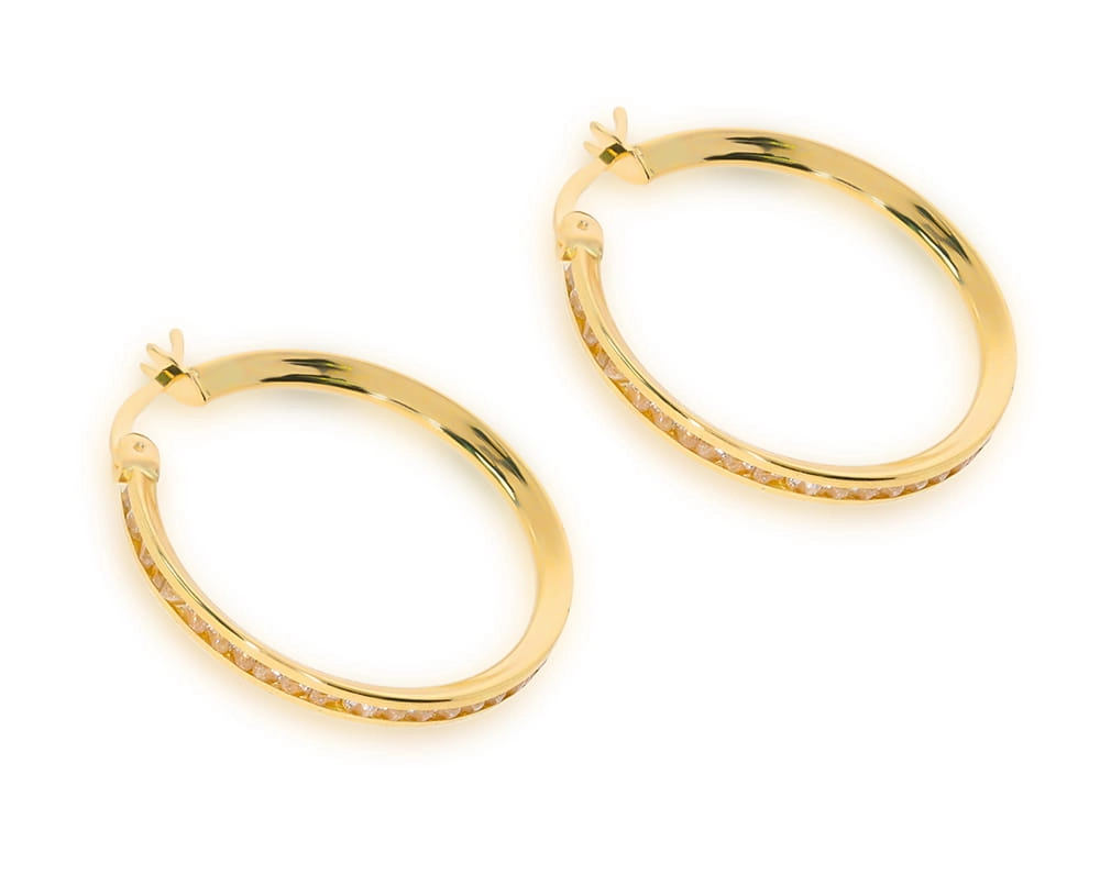 Auskarai yra klasikinės, tačiau visada madingos apvalios formos, kurios skersmuo siekia 2,3 cm, o plotis – 2,4 mm. Viena auskarų briauna yra subtiliai inkrustuota žėrinčiais šviesiai rudos spalvos cirkoniais, kurie suteikia papuošalui prabangos ir švytėjimo. Šis dizainas leidžia auskarams tapti universaliu pasirinkimu – jie puikiai tiks tiek kasdieniam įvaizdžiui pagyvinti, tiek ypatingoms progoms, suteikiant Jums pasitikėjimo savimi ir žavesio.