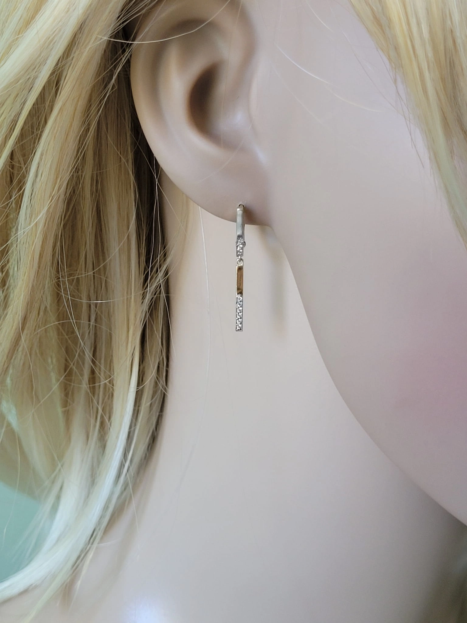 Kiekvienas auskaras yra kruopščiai pagamintas, siekiant užtikrinti ne tik estetinį malonumą, bet ir patogumą dėvint. Jų dizainas pasižymi elegantiškomis, kabančiomis stačiakampio formos detalėmis, kurios subtiliai juda su kiekvienu Jūsų judesiu, suteikdamos Jums žavesio ir pasitikėjimo. Auskarų ilgis yra 2,9 cm, o plotis – 2 mm, todėl jie yra pakankamai išraiškingi, kad būtų pastebėti, tačiau ne per daug masyvūs, kad taptų kasdienio stiliaus dalimi. Ypatingo žavesio suteikia balti cirkoniai, kurie puošia dalį auskaro briaunos, sukurdami nuostabų šviesos žaismą ir suteikdami prabangos pojūtį.
