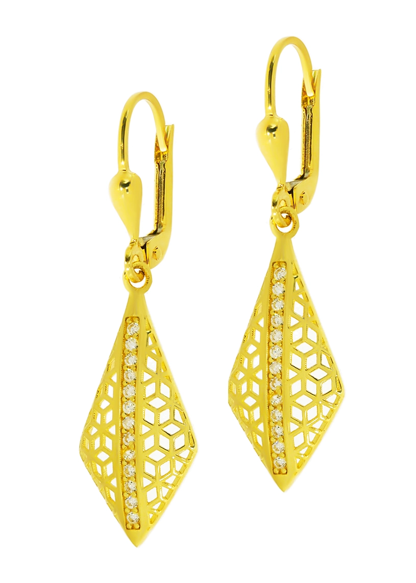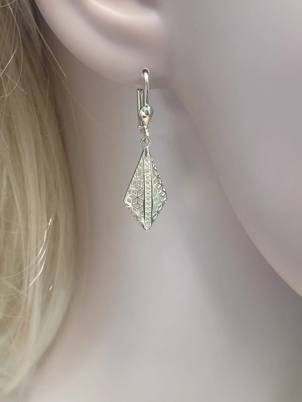 Auskarų dizainas išsiskiria savo modernia, rombo formos ažūrine struktūra, kuri suteikia jiems lengvumo ir subtilumo. Centrinėje dalyje, tarsi brangakmenių takelis, išdėlioti spindintys balti cirkoniai, kurie kiekvienam judesiui suteikia akinančio žavesio. Jų bendras ilgis siekia 3,70 cm, o plotis – 1,0 cm, todėl jie puikiai tiks tiek kasdieniam įvaizdžiui, tiek ypatingoms progoms, suteikdami Jums pasitikėjimo ir pilno spindesio. Tai puiki dovana moteriai, vertinančiai rafinuotumą ir unikalumą.