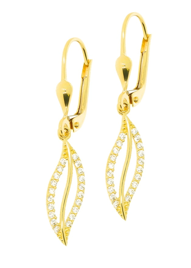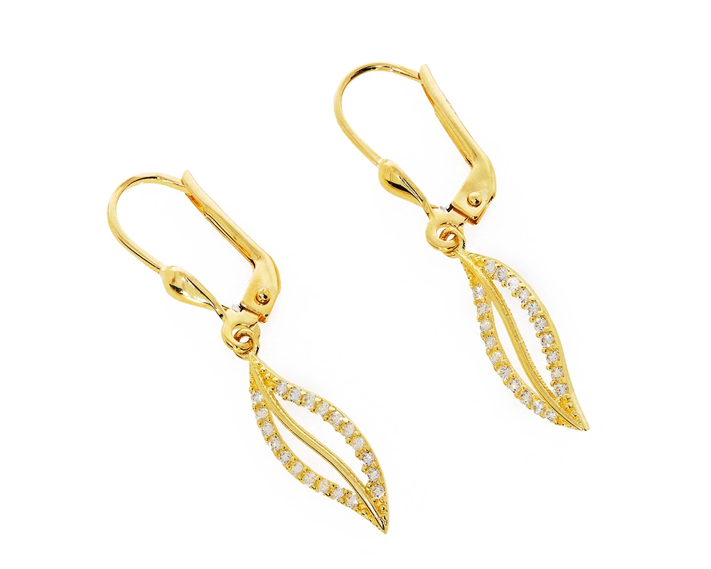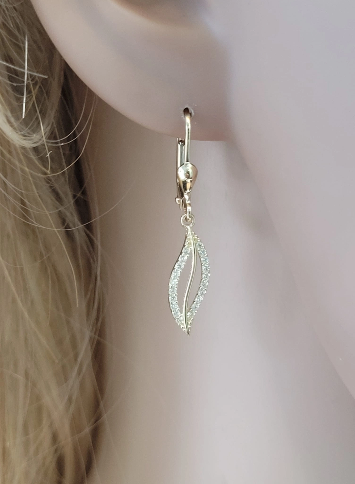 Kruopščiai pagaminti iš aukščiausios kokybės 585 prabos geltono aukso, šie auskarai žavi savo unikaliu dizainu. Kiekvienas auskaras yra lyg stilizuotas lapelis, kurio viena pusė subtiliai inkrustuota žėrinčiais baltais cirkoniais, o kita – glotniai išlenkta aukso briauna. Šis kontrastas sukuria dinamišką ir akį traukiantį efektą, priverčiantį šviesą žaisti su kiekvienu Jūsų judesiu. Auskarų ilgis yra 3,30 cm, o plotis – 6,0 mm, todėl jie yra pakankamai pastebimi, bet ne per daug masyvūs, idealiai tinkantys tiek kasdieniam dėvėjimui, tiek ypatingoms progoms.