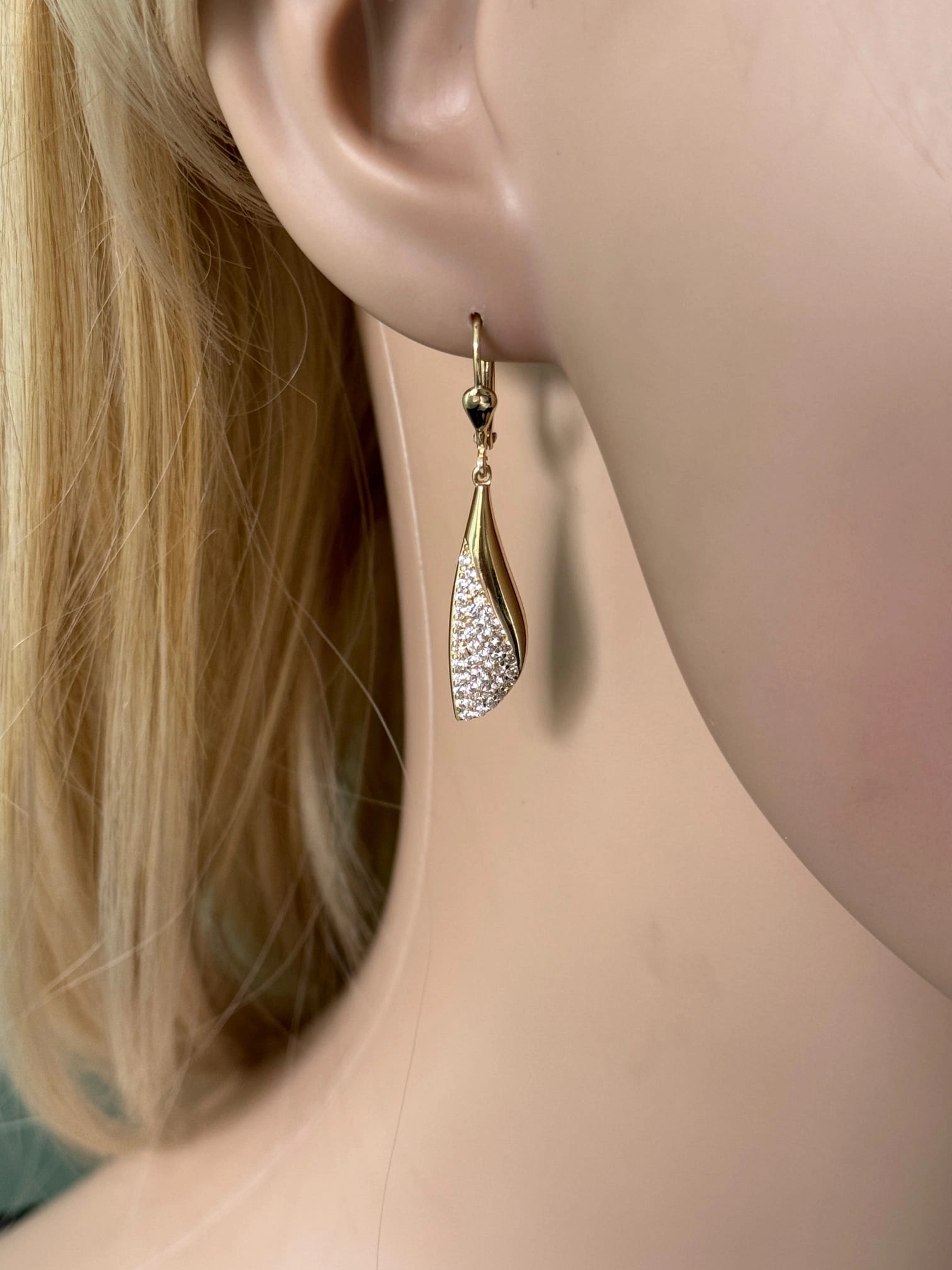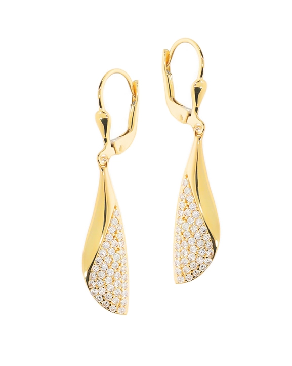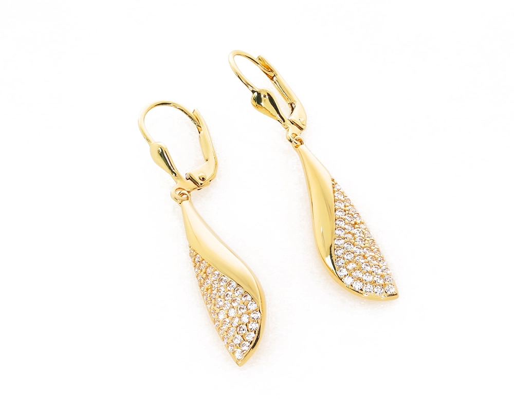 Auskarai pagaminti iš aukščiausios kokybės 585 prabos geltono aukso, kuris švelniai glosto odą ir pabrėžia natūralų Jūsų grožį. Jų kabantis dizainas, primenantis grakščius lašelius ar subtilius lapelius, yra papuoštas daugybe žėrinčių baltų cirkonių. Šie akmenėliai, kruopščiai įkomponuoti į auskarų briauną, sukuria akinantį spindesį, kuris atspindi šviesą su kiekvienu Jūsų judesiu. Auskarų ilgis siekia 4,00 cm, o plotis – 7,30 mm, todėl jie yra pakankamai pastebimi, tačiau ne per daug masyvūs, idealiai tinkantys tiek kasdieniam nešiojimui, tiek ypatingoms progoms.