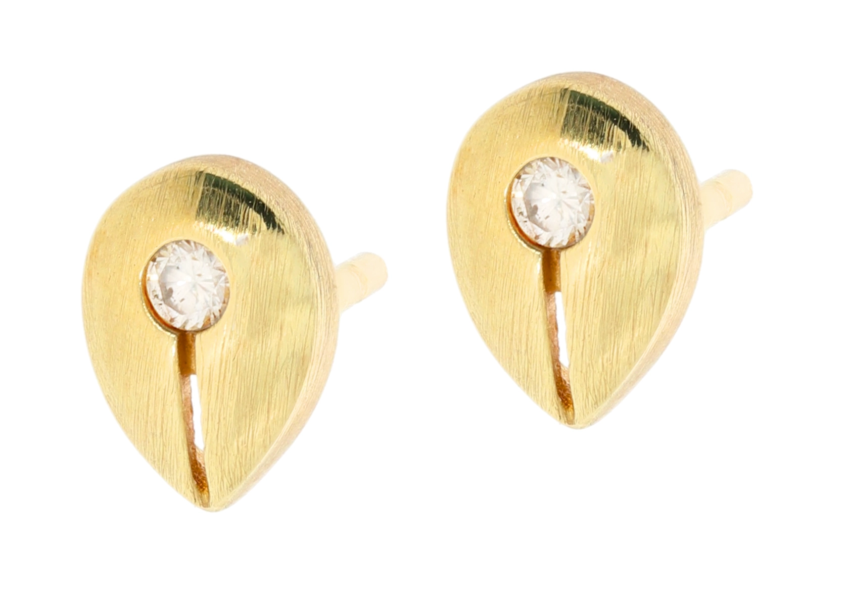 Kiekvienas auskaras pagamintas iš aukščiausios kokybės 585 prabos geltono aukso, suteikiančio jiems šiltą ir prabangų atspalvį. Jų lašo formos dizainas su švelniai matiniu paviršiumi ir subtiliu įpjovimu, vedančiu prie centrinio balto deimanto, sukuria modernų ir kartu klasikinį įvaizdį. Deimantai, kurių bendra masė yra 0,06 ct, pasižymi SI švarumu ir H spalva, užtikrindami akinantį spindesį, kuris nepaliks abejingų. Auskarų matmenys: plotis 5 mm, ilgis 7 mm – idealiai tinka kasdieniam nešiojimui ar ypatingoms progoms.