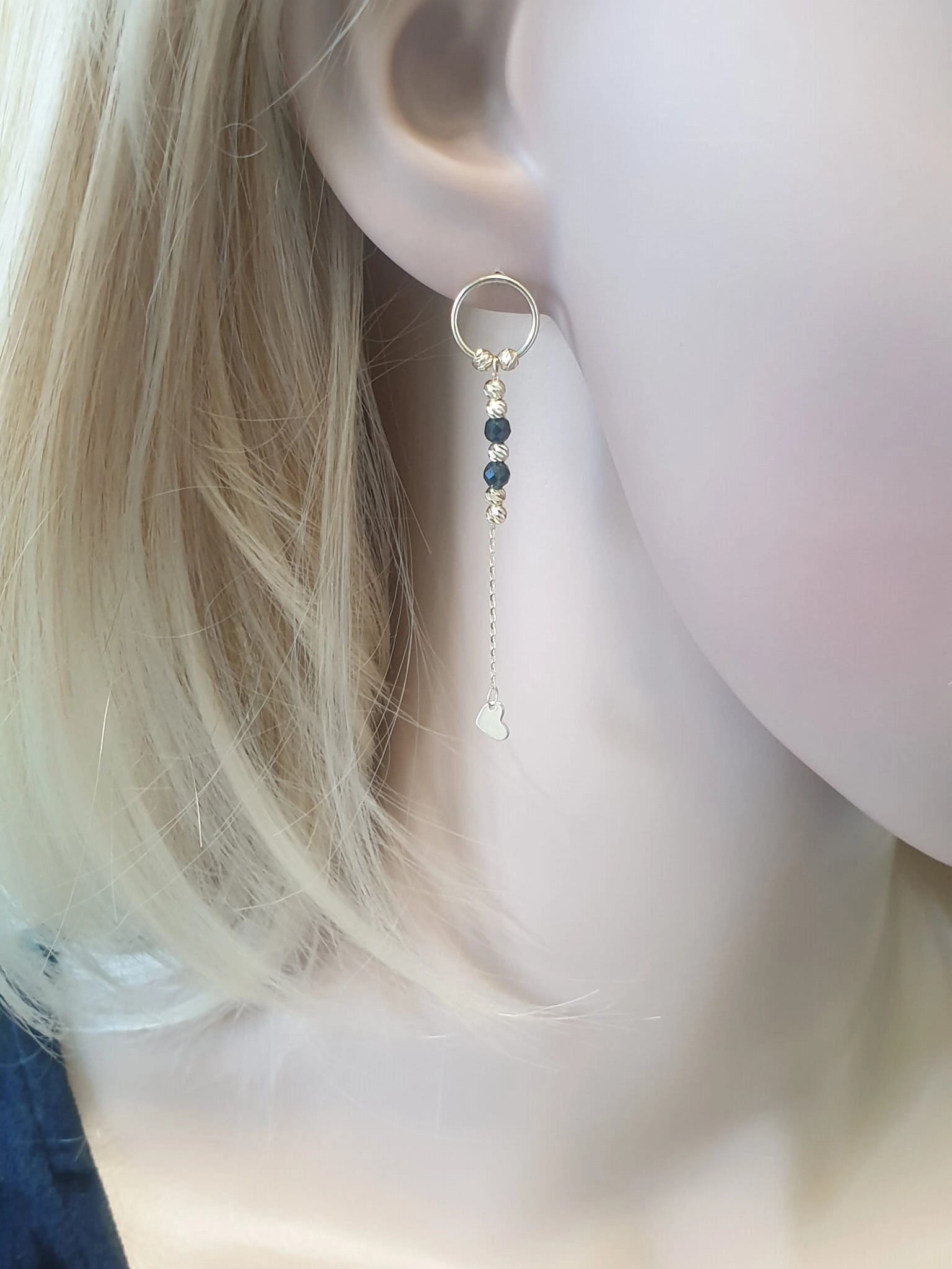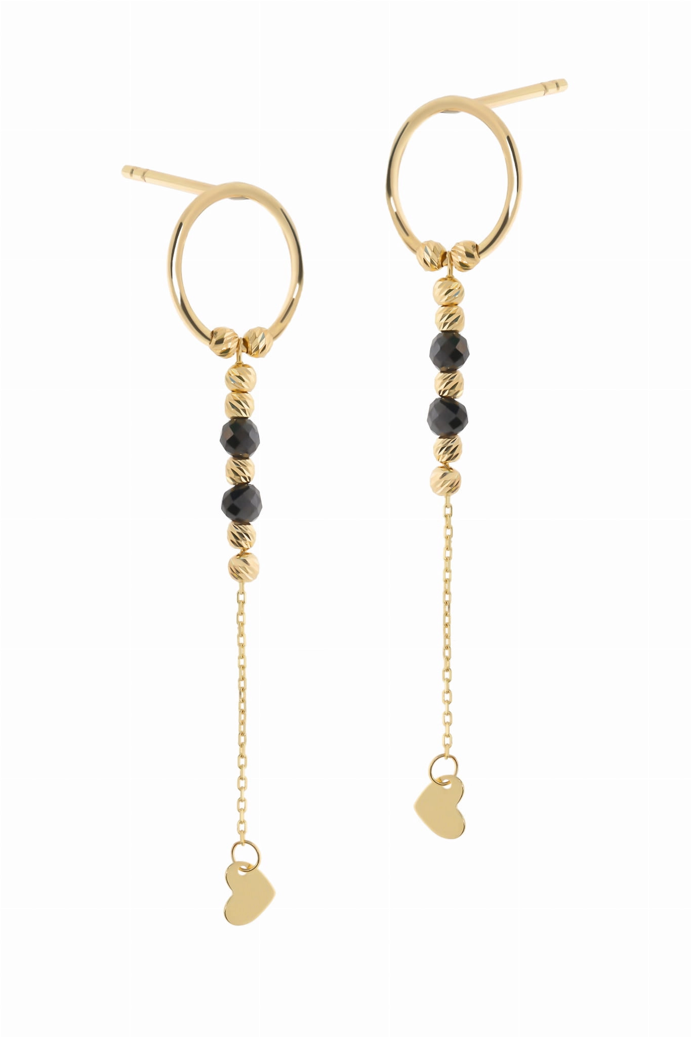 Viršutinėje dalyje puikuojasi trys smulkūs, raižyti aukso burbuliukai, kurie žavi savo tekstūra ir atspindi šviesą. Po jais – trys juodi, briaunuoti cirkoniai, suteikiantys auskarams paslaptingumo ir gilumo. Šie akmenys puikiai dera su geltono aukso švytėjimu, sukurdami harmoniją ir kontrastą. Grandinėlės apačioje kabo miela, poliruota širdelė, simbolizuojanti meilę ir švelnumą, kuri subtiliai siūbuoja su kiekvienu judesiu.