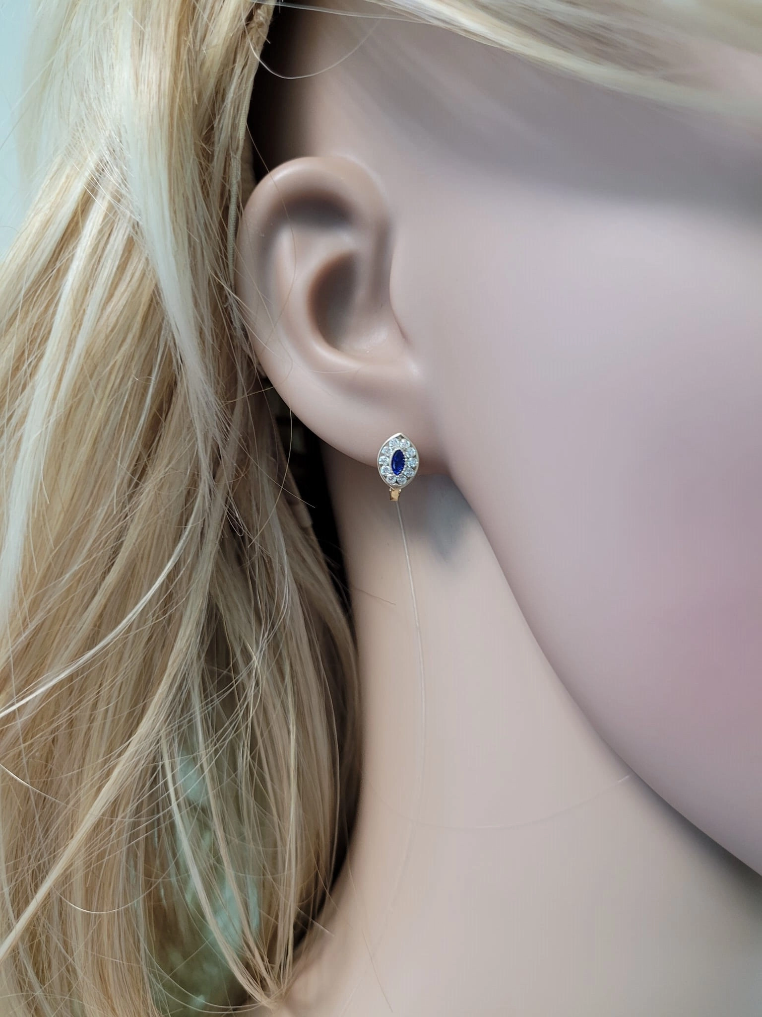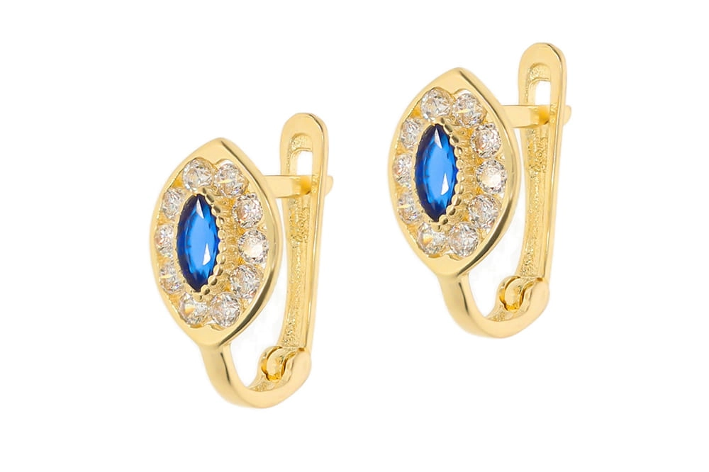 Elegantiški moteriški geltono aukso auskarai su mėlynais cirkoniais 585
