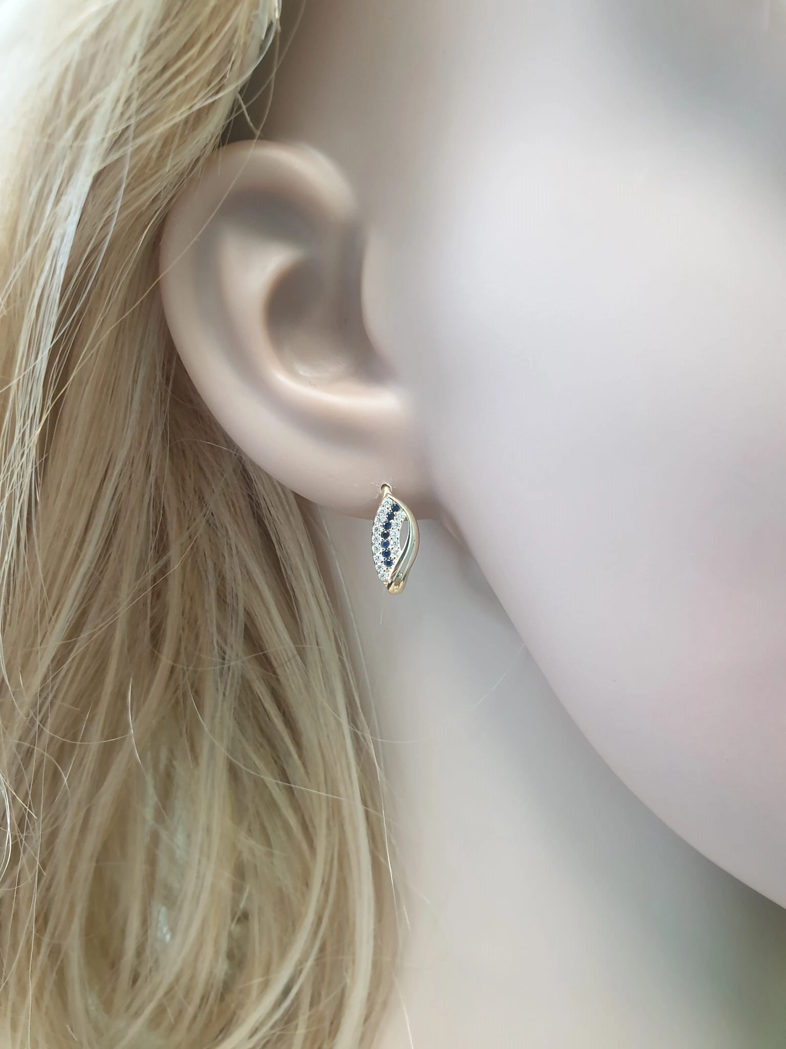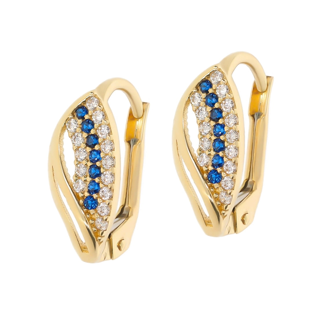 Elegantiški moteriški geltono aukso auskarai su mėlynais ir baltais cirkoniais 585