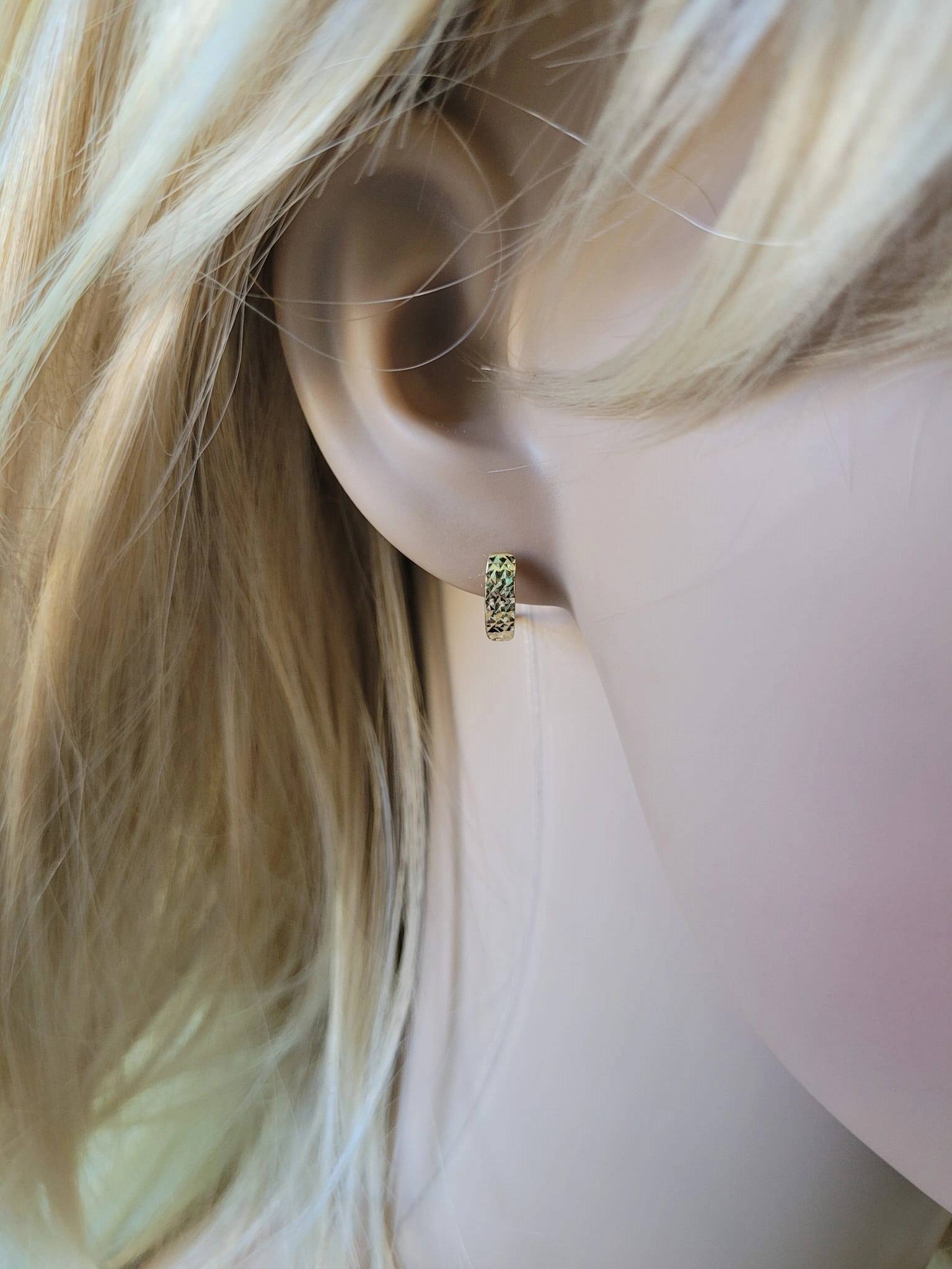 Jų unikali raižyta briauna sukuria subtilų žaismą su šviesa, atspindėdama kiekvieną spindulėlį ir suteikdama auskarams gyvybės. Klasikinė, tačiau moderni forma puikiai tiks moterims, vertinančioms stilių ir rafinuotumą. Auskarų ilgis yra 1,1 cm, o plotis – 3,0 mm, todėl jie yra pakankamai pastebimi, bet ne per daug įkyrūs, idealiai tinkantys tiek kasdieniam nešiojimui, tiek ypatingoms progoms. Tai puiki dovana sau ar brangiam žmogui, kuri leis pasijusti ypatingai ir spindėti kiekvieną dieną.