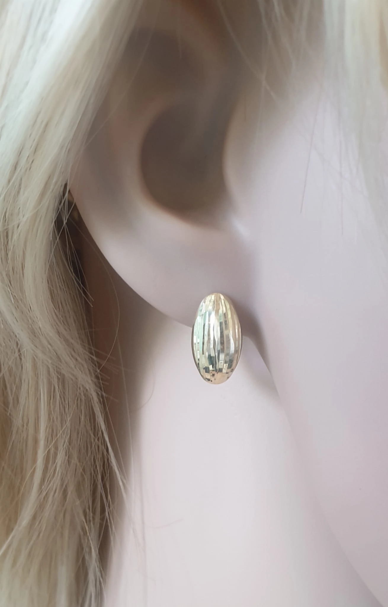 Kiekviena detalė apgalvota su meile ir preciziškumu, siekiant užtikrinti ne tik patogumą, bet ir nepriekaištingą išvaizdą. Auskarų forma – tai subtiliai išlenkti ovalai, kurių paviršius puoštas raižytais vertikaliais grioveliais. Šis unikalus raštas sukuria žavingą šviesos žaismą, priverčiantį auskarus spindėti ir atkreipti dėmesį į Jūsų veido bruožus. Jų matmenys – 1,5 cm ilgio ir 8 mm pločio – yra idealūs, kad auskarai būtų pastebimi, bet ne per daug įkyrūs, puikiai tinkantys tiek kasdieniam dėvėjimui, tiek ypatingoms progoms.