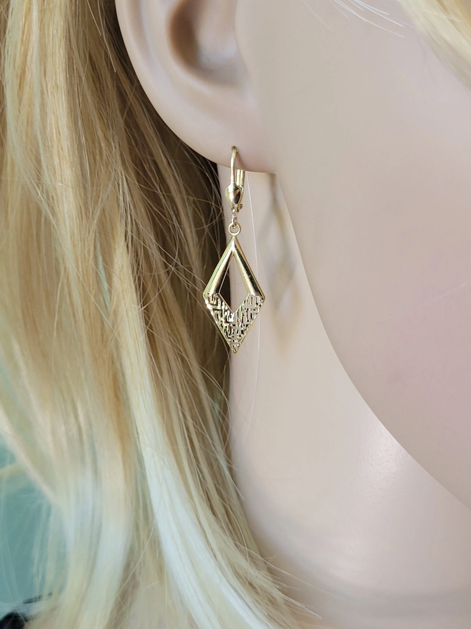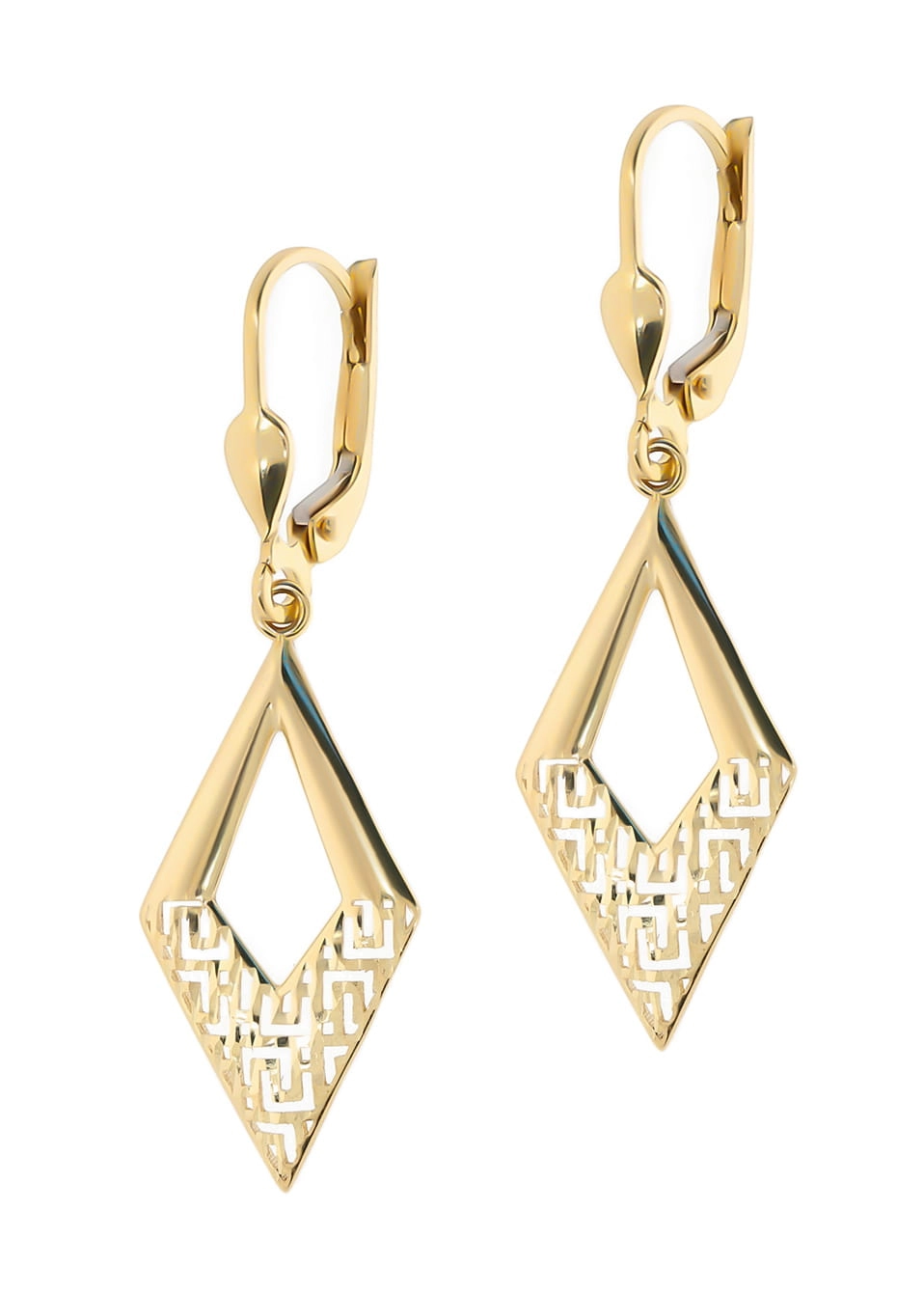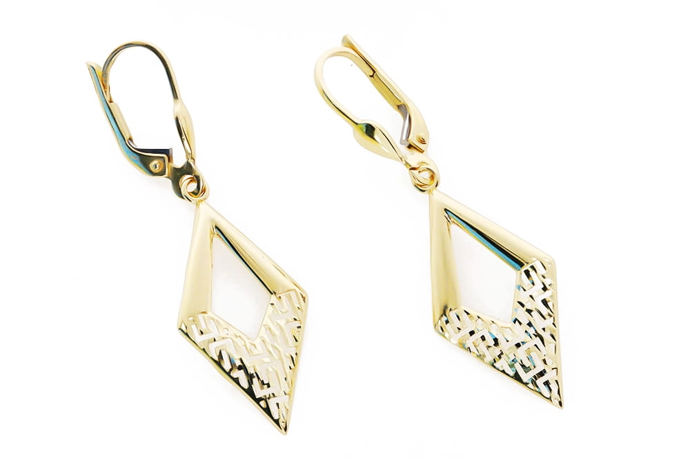 Kiekvienas auskaras yra preciziškai išdirbtas, sujungiant klasikinę rombo formą su moderniu, ažūriniu raštu apatinėje dalyje. Šis subtilus, geometrinis raštas suteikia auskarams lengvumo ir žaismingumo, išlaikant bendrą eleganciją. Auskarų ilgis yra 4,0 cm, o plotis – 1,3 cm, todėl jie yra pakankamai pastebimi, kad patrauktų dėmesį, tačiau ne per dideli, kad būtų patogūs nešioti kasdien ar ypatingomis progomis. Jie puikiai tiks tiek prie vakarinės suknelės, tiek prie kasdienio įvaizdžio, suteikdami jam prabangos ir rafinuotumo. Tai puiki dovana sau ar brangiam žmogui, norint išreikšti pasitikėjimą ir meilę.