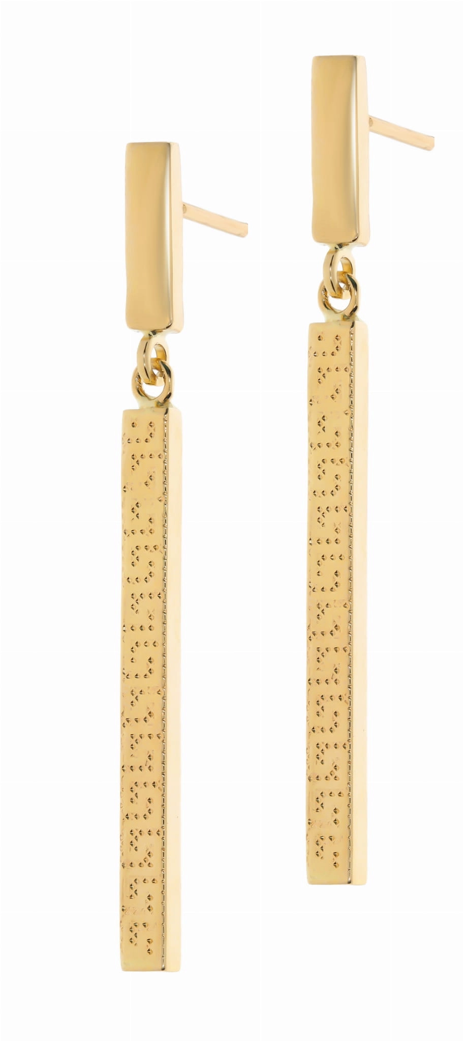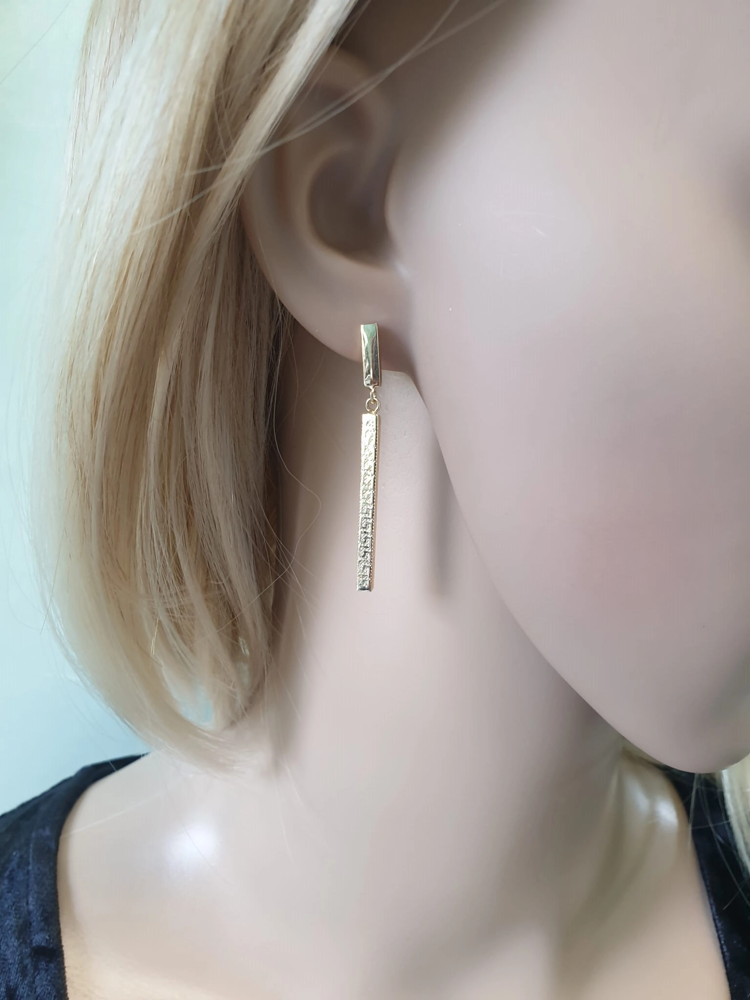 Šie kabantys auskarai, pagaminti iš aukščiausios kokybės 585 prabos geltono aukso, pasižymi unikaliu stačiakampio formos dizainu. Viršutinė dalis yra lygi ir poliruota, o apatinė, ilgesnė dalis, dekoruota subtiliu taškelių raštu, primenančiu Brailio raštą, suteikiančiu jiems išskirtinumo ir žaismingumo. Auskarų ilgis yra 4,60 cm, o plotis – 3 mm, todėl jie yra pakankamai ilgi, kad atkreiptų dėmesį, bet kartu ir pakankamai subtilūs, kad tiktų kasdieniam nešiojimui ar ypatingoms progoms. Jie puikiai papildys tiek vakarinę suknelę, tiek elegantišką kostiumėlį, suteikdami Jūsų įvaizdžiui rafinuotumo ir švytėjimo.