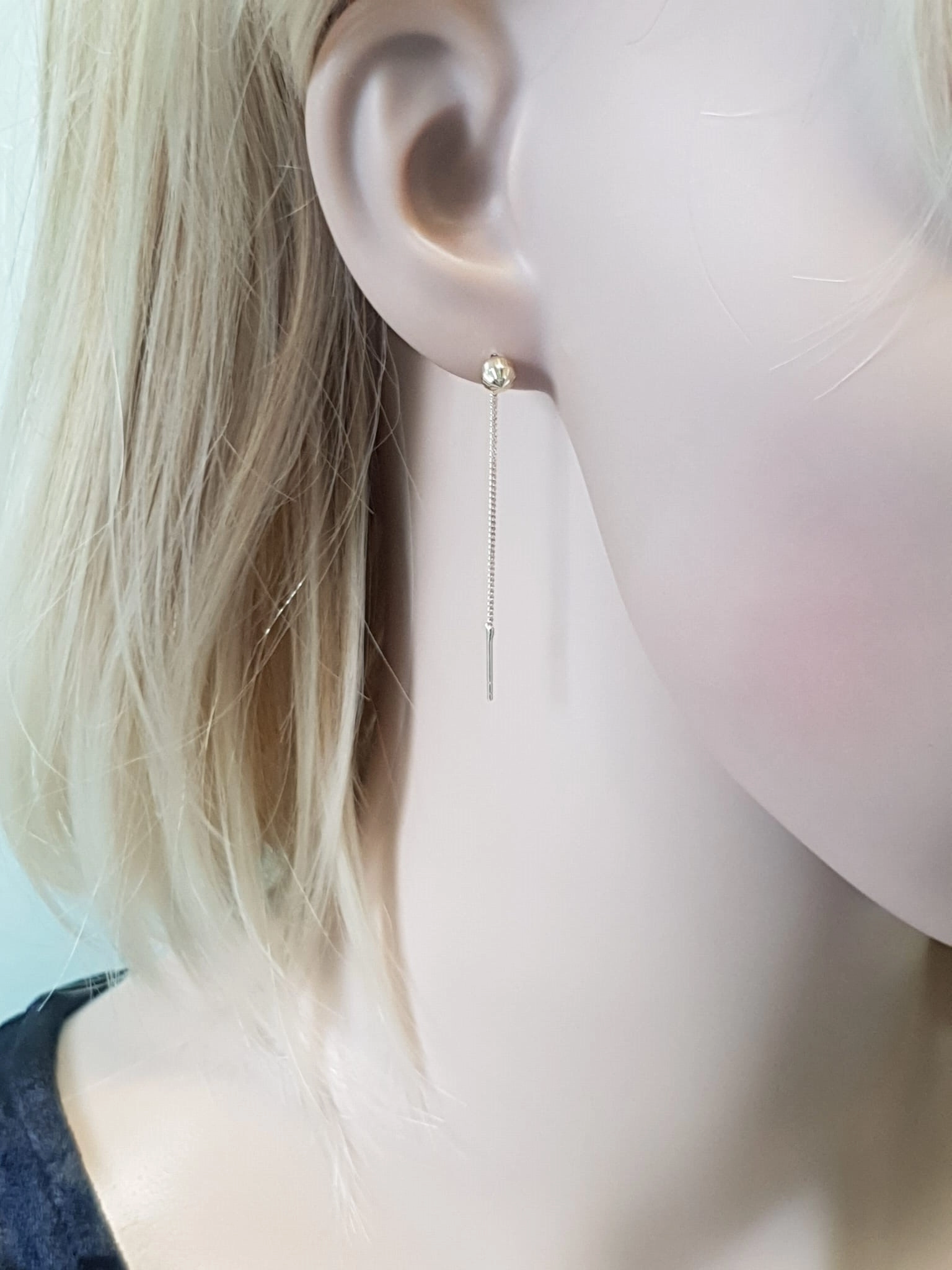 Šie kabantys auskarai pagaminti iš aukščiausios kokybės 585 prabos geltono aukso, garantuojančio ilgaamžiškumą ir nepriekaištingą išvaizdą. Jų dizainas išsiskiria minimalistine elegancija: plonos, grakščios grandinėlės, kurių ilgis su kabliuku siekia 5,5 cm, subtiliai supasi, o apačioje kabo žavingi, raižyti auksiniai rutuliukai, kurių skersmuo yra 5 mm. Šis unikalus raižymas suteikia rutuliukams ypatingo spindesio ir gylio, priverčiant juos žaisti šviesoje su kiekvienu judesiu. Tai puikus pasirinkimas tiek kasdienai, tiek ypatingoms progoms, pavyzdžiui, romantiškai vakarienei ar šventiniam renginiui. Padovanokite sau ar brangiam žmogui šiuos auskarus ir leiskite jiems tapti mėgstamiausiu juvelyrikos kūriniu, kuris spindės ir džiugins ilgus metus.