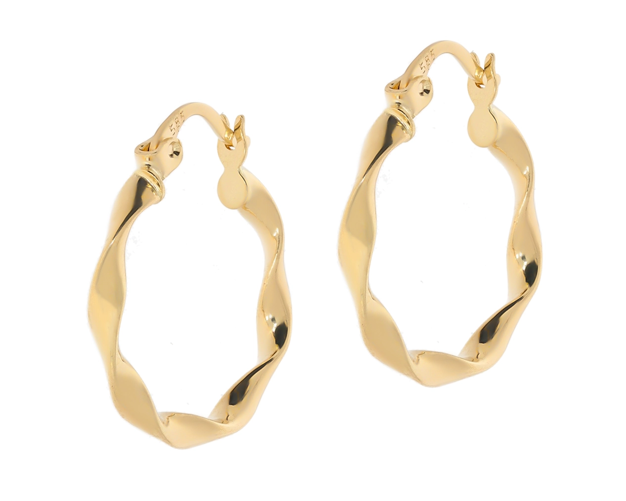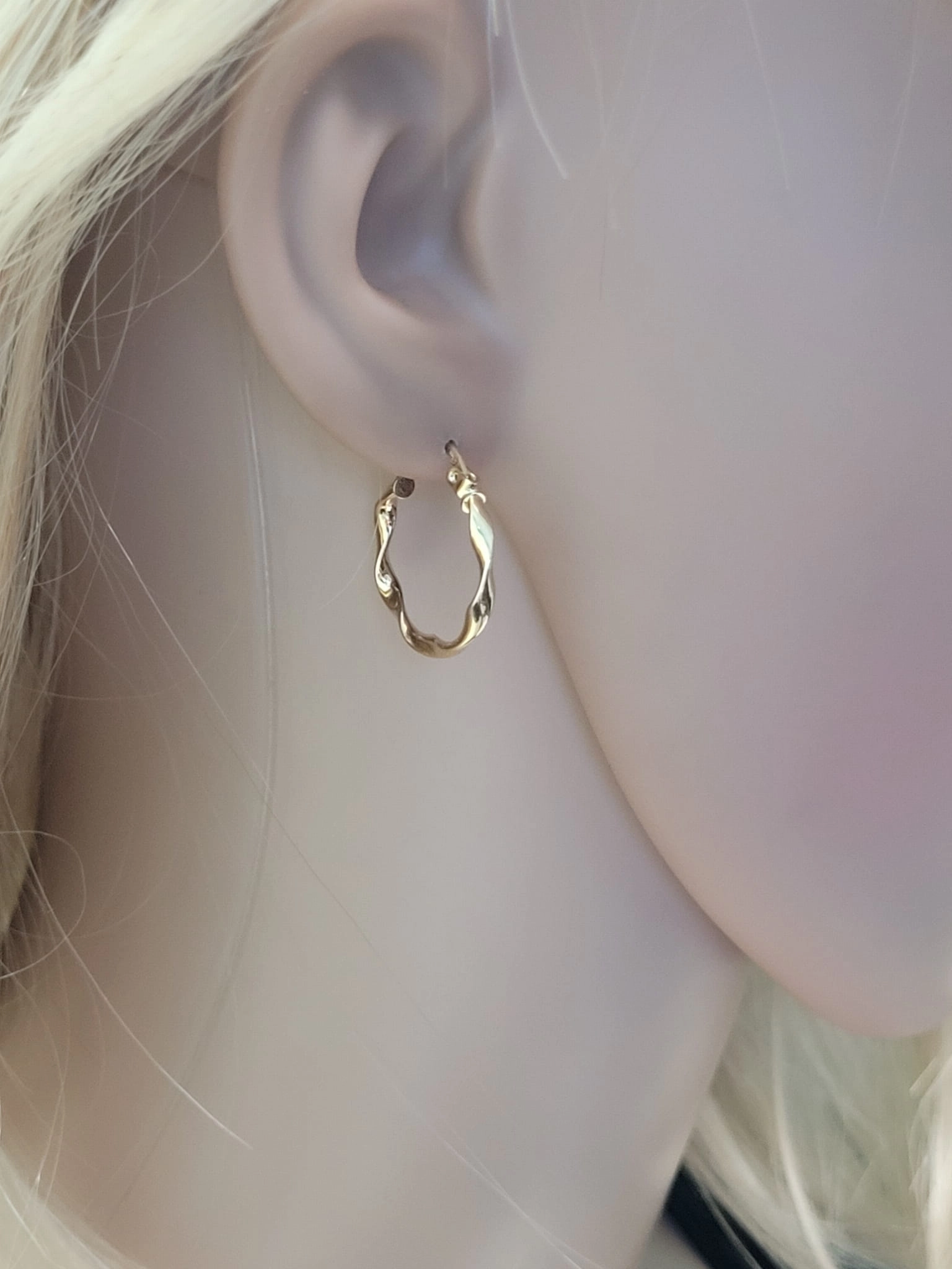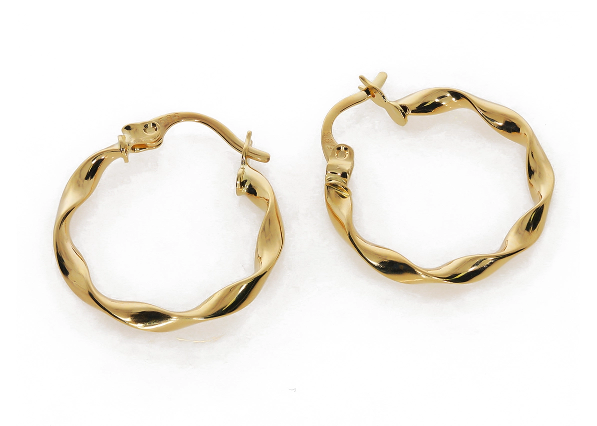 Kiekvienas auskaras yra kruopščiai suformuotas į subtilią, banguotą kilpą, kuri suteikia jam unikalumo ir žavesio. Jų skersmuo yra 1,94 cm, o plotis – 2,50 mm, todėl jie yra pakankamai pastebimi, kad atkreiptų dėmesį, tačiau ne per daug masyvūs, kad taptų kasdienio stiliaus dalimi. Šis dizainas ne tik pabrėžia auskarų estetiką, bet ir užtikrina patogų dėvėjimą visą dieną.