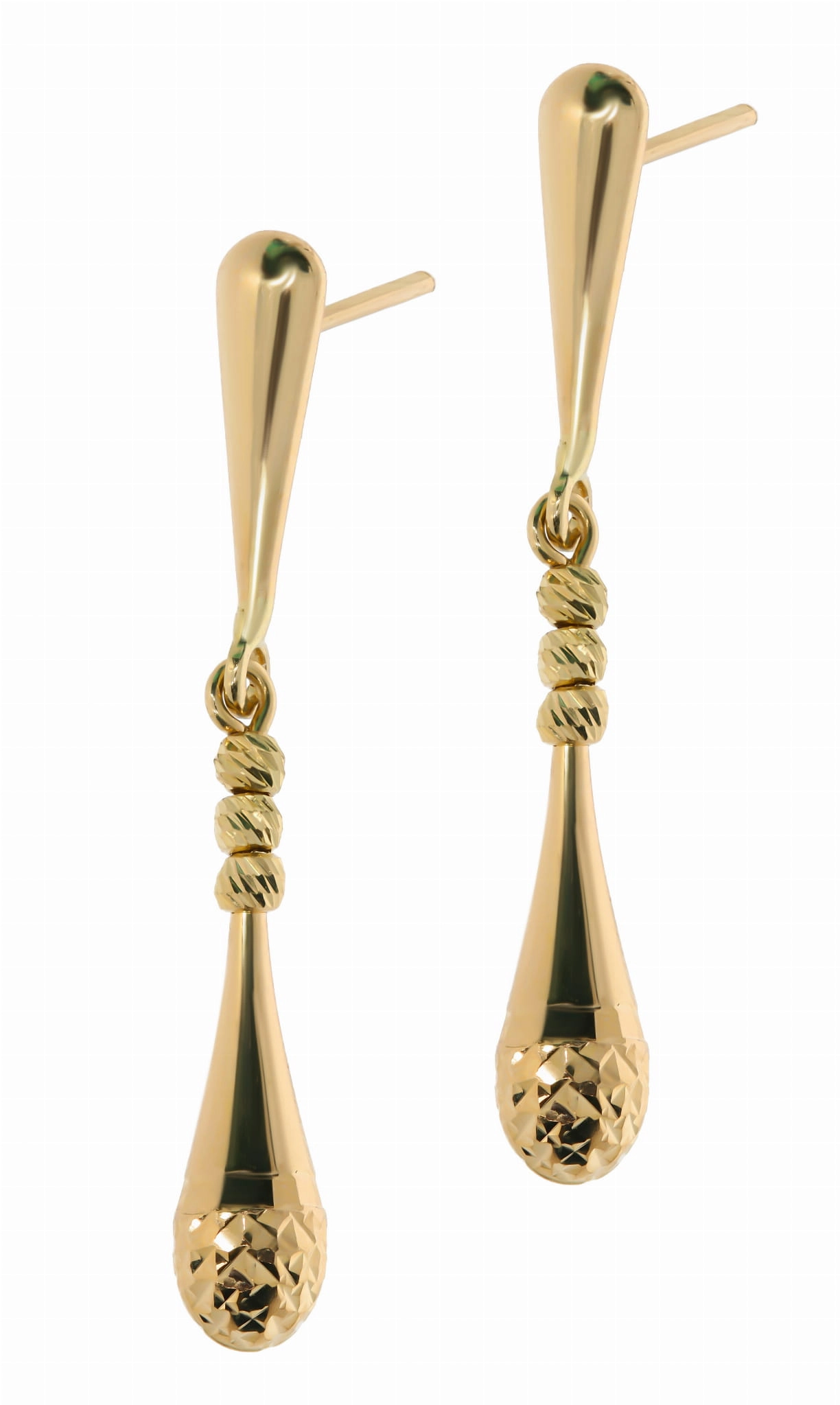 Kiekvienas auskaras kruopščiai pagamintas su meile ir preciziškumu, siekiant užtikrinti ne tik estetinį grožį, bet ir patogumą. Auskarų viršutinė dalis yra lygios, poliruotos geltono aukso formos, kuri grakščiai pereina į tris subtiliai raižytus karoliukus. Šie karoliukai suteikia auskarams papildomos tekstūros ir žavesio. Apatinė dalis – tai lašelio formos elementas, kurio apačia puošta įmantriu raštu, atspindinčiu šviesą ir suteikiančiu auskarams gyvybės. Šis dizainas pabrėžia moteriškumą ir išskirtinumą, leisdamas jums jaustis ypatingai kiekvieną kartą, kai juos dėvite.
