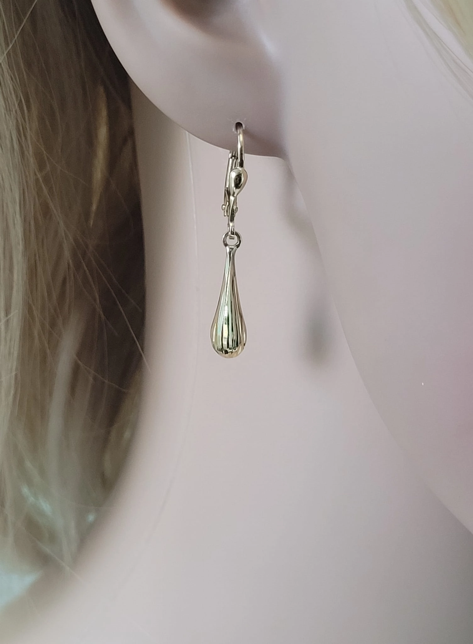 Auskarai išsiskiria savo elegantiška lašo forma, kuri subtiliai pailgina kaklą ir suteikia veidui grakštumo. Jų paviršius dekoruotas smulkiomis, preciziškai išraižytomis linijomis, kurios atspindi šviesą ir sukuria žaismingą blizgesį, primenantį spindinčius vandens lašelius. Tai puikus pasirinkimas tiek kasdienai, tiek ypatingoms progoms, kai norisi atrodyti nepriekaištingai ir jaustis išskirtinai. Auskarų ilgis yra 3,50 cm, o plotis – 5 mm, todėl jie yra pakankamai pastebimi, bet ne per daug masyvūs, idealiai tinkantys moterims, vertinančioms subtilų grožį.