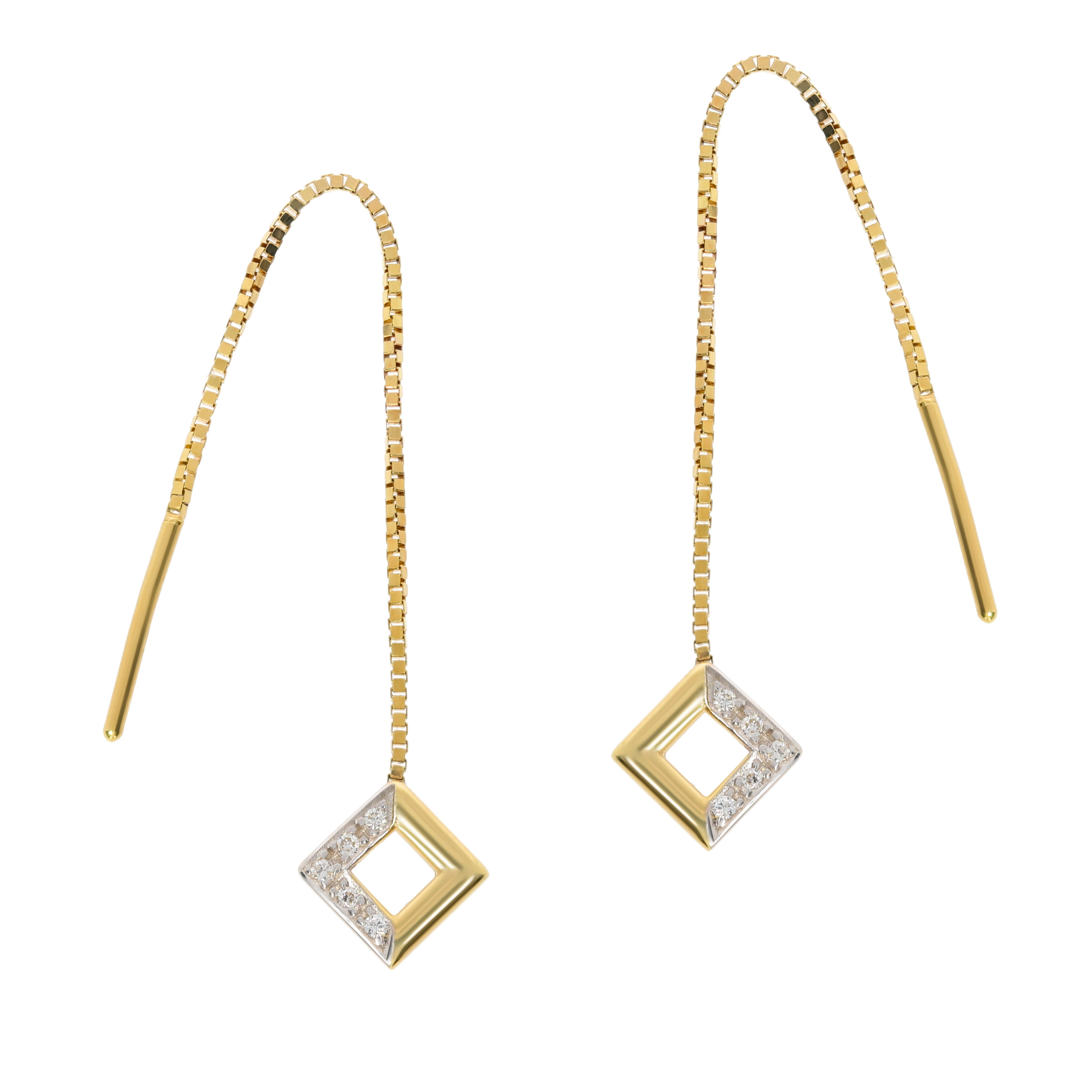 Kiekvienas auskaras yra ilgos, grakščios grandinėlės ir subtilaus rombo formos derinio pavyzdys. Rombo vidinė dalis yra iš geltono aukso, o išorinė briauna – iš balto aukso, puošta spindinčiais deimantais. Bendras deimantų svoris siekia 0,05 ct, jų švarumas SI, o spalva I, suteikianti jiems nepaprastą švytėjimą. Šis modernus, tačiau kartu ir klasikinis dizainas, leidžia auskarams elegantiškai kaboti ir judėti kartu su Jumis, atspindint šviesą su kiekvienu judesiu. Auskarų plotis yra 6 mm, o ilgis – įspūdingi 6,5 cm, todėl jie puikiai tiks tiek kasdieniam įvaizdžiui, tiek ypatingoms progoms, suteikdami Jums pasitikėjimo savimi ir žavesio.
