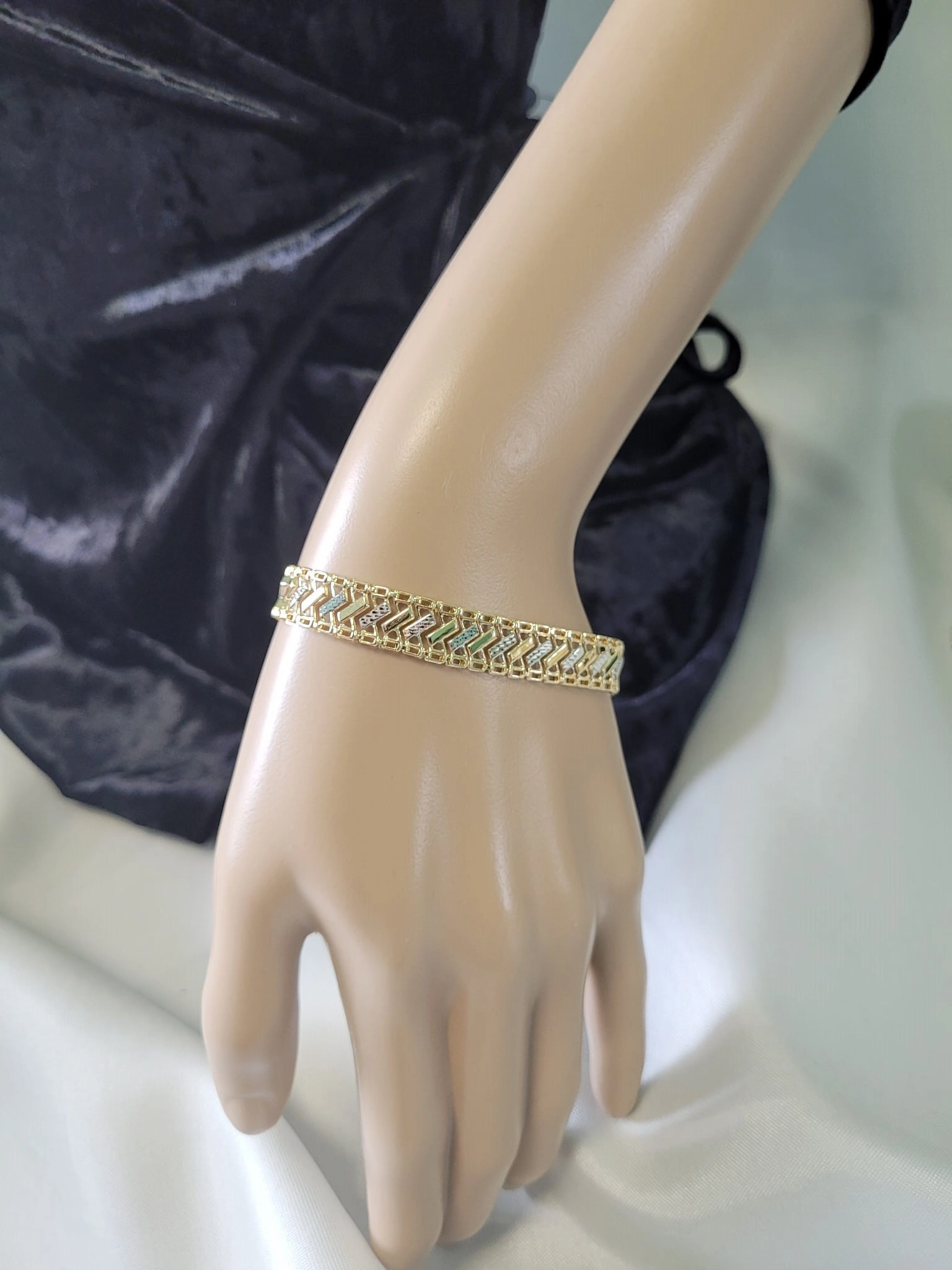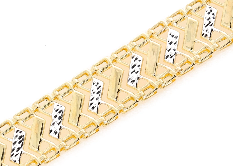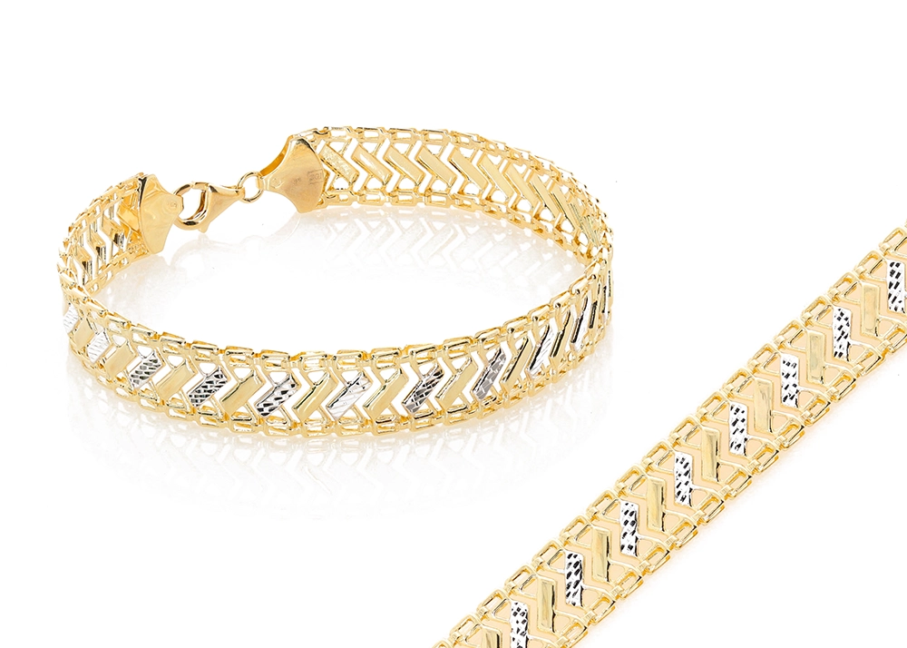 Pristatome išskirtinę dviejų spalvų aukso apyrankę, kuri sujungia klasikinę eleganciją su moderniu dizainu. Ši apyrankė, pagaminta iš aukščiausios kokybės 585 prabos aukso, yra puikus pasirinkimas moterims, vertinančioms stilių ir ilgaamžiškumą. Jos unikalus dizainas, kuriame persipina geltonas ir baltas auksas, sukuria žavingą kontrastą, priverčiantį apyrankę spindėti ant riešo.