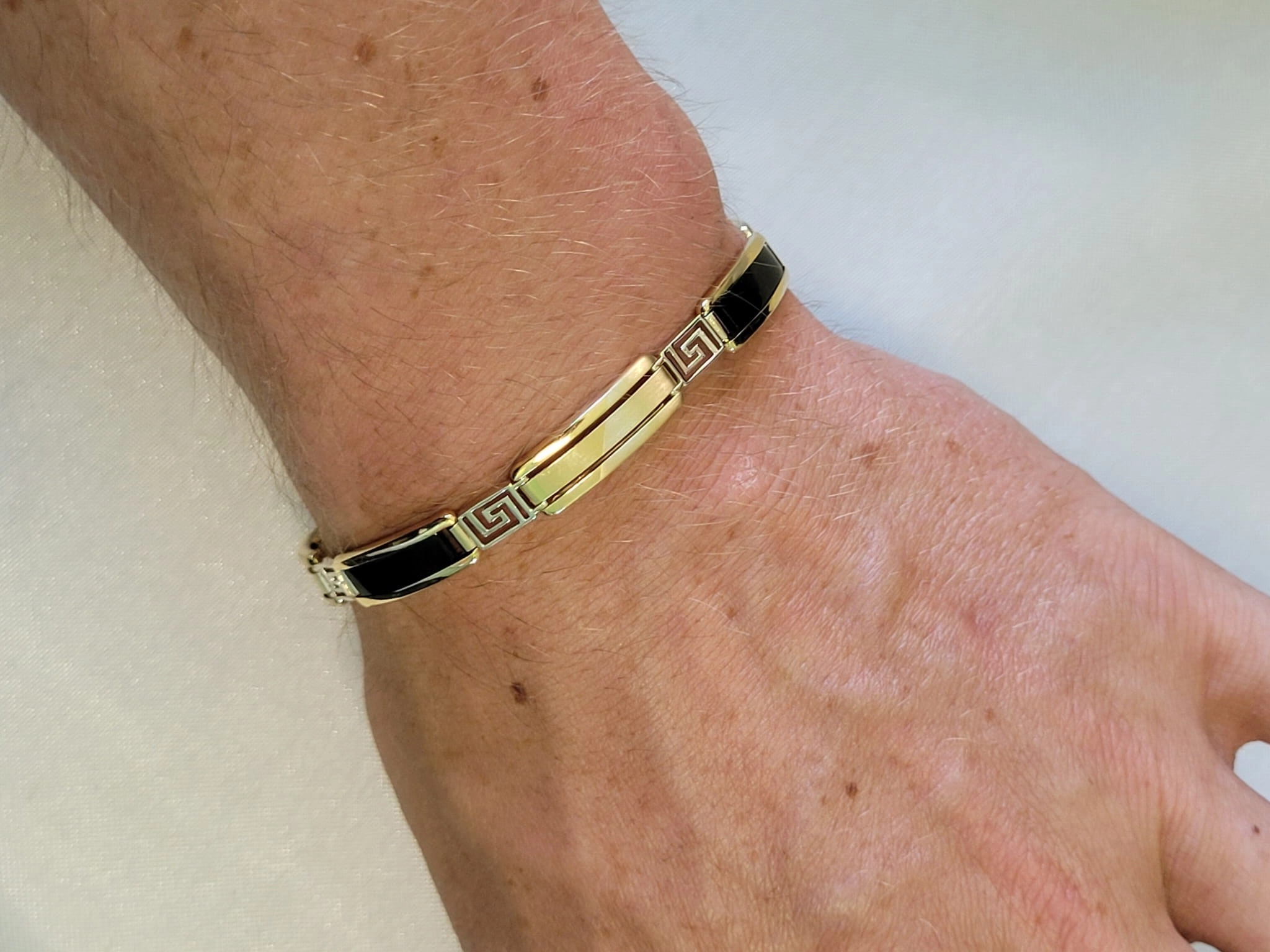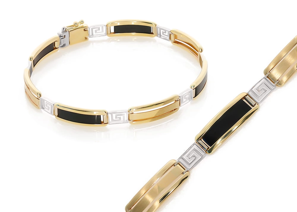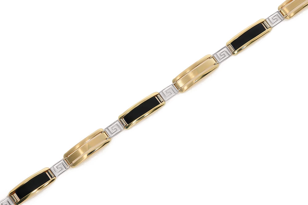 Pristatome Jums išskirtinę vyrišką apyrankę, kuri sujungia klasikinę eleganciją su moderniu dizainu. Ši apyrankė pagaminta iš aukščiausios kokybės 585 prabos geltono ir balto aukso, suteikiančio jai prabangos ir ilgaamžiškumo. Jos unikalus dizainas, kuriame persipina geltono ir balto aukso elementai su juodais intarpais, sukuria išskirtinį kontrastą ir pabrėžia vyrišką stilių.