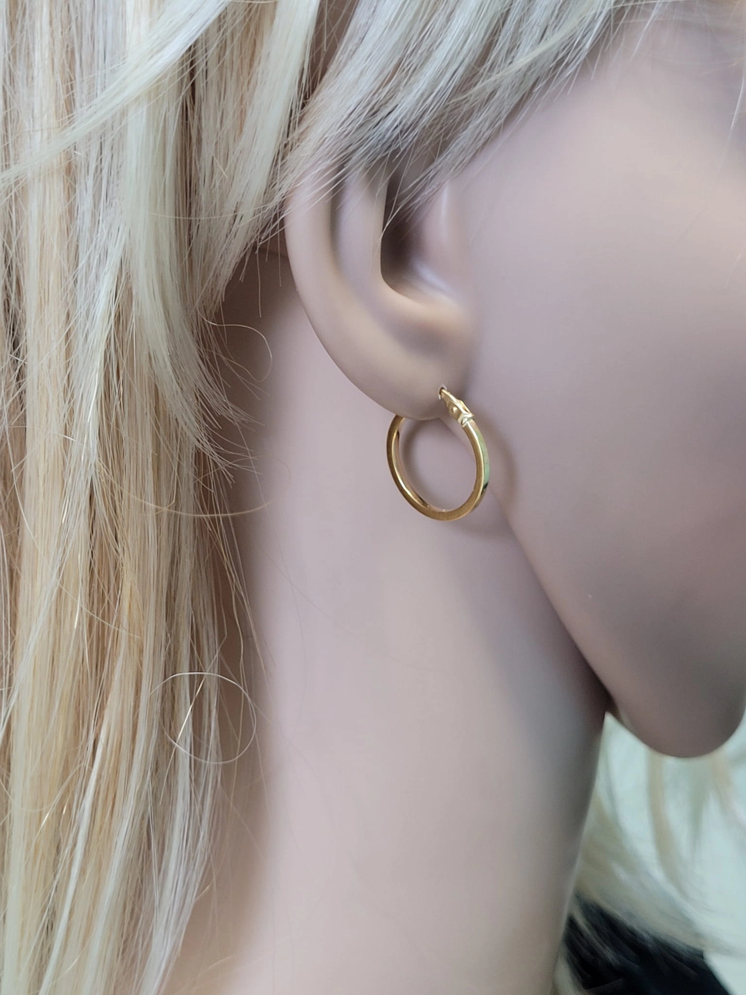 Šie klasikinio dizaino auskarai yra universalūs ir stilingi, tinkantys įvairioms progoms. Jų tobulai apvalios formos ir lygus paviršius sukuria subtilų, bet ryškų akcentą, pabrėžiantį jūsų veido bruožus. Auskarų ilgis yra 1,8 cm, o plotis – 2 mm, todėl jie yra pakankamai pastebimi, bet ne per daug įpareigojantys. Tai puiki dovana sau ar brangiam žmogui, norinčiam jaustis išskirtinai ir pasitikėti savimi kiekvieną dieną.